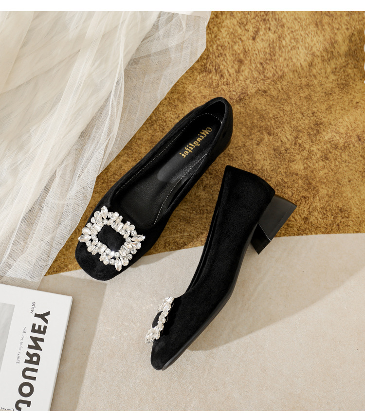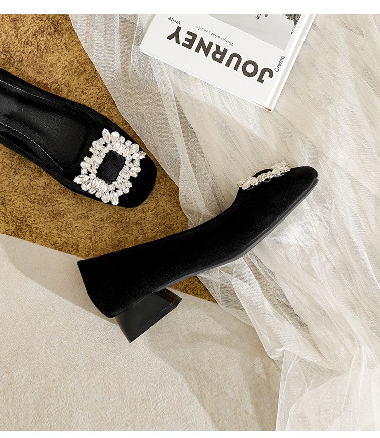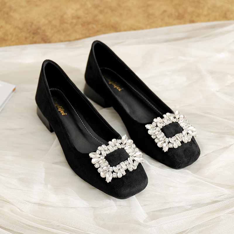 프렌치 스타일의 우아한 여성용 슈즈, 스퀘어토, 얕은 입구, 2026년 봄 신상, 워터다이아몬드 장식, 두꺼운 굽, 낮은 굽의 플랫슈즈