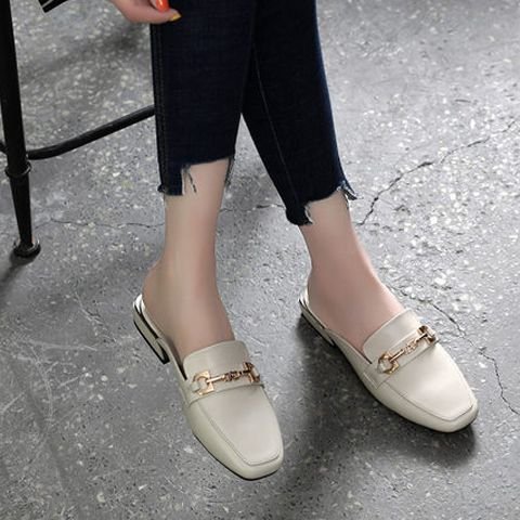 2024 봄과 여름 새로운 패션 올 매치 아우터 착용 청키 힐 로퍼 부드러운 바닥 미끄럼 방지 가죽 표면 폐쇄 발가락 하프 슬리퍼 여성용 신발스토어 가기