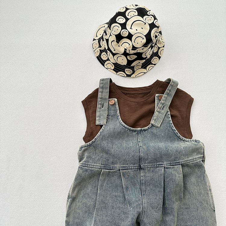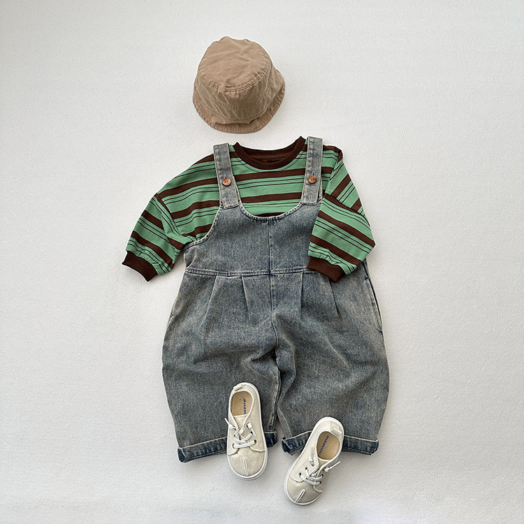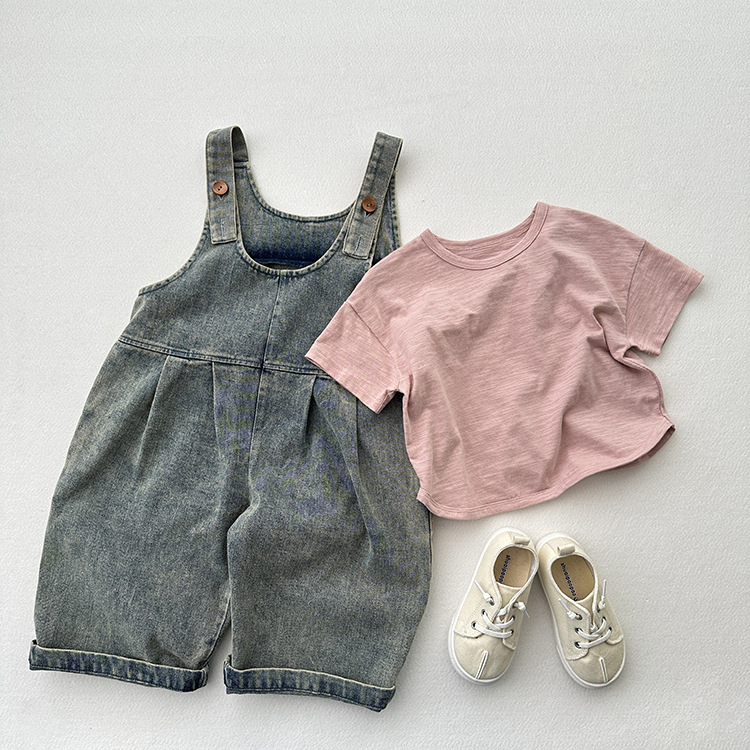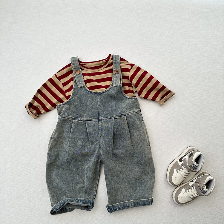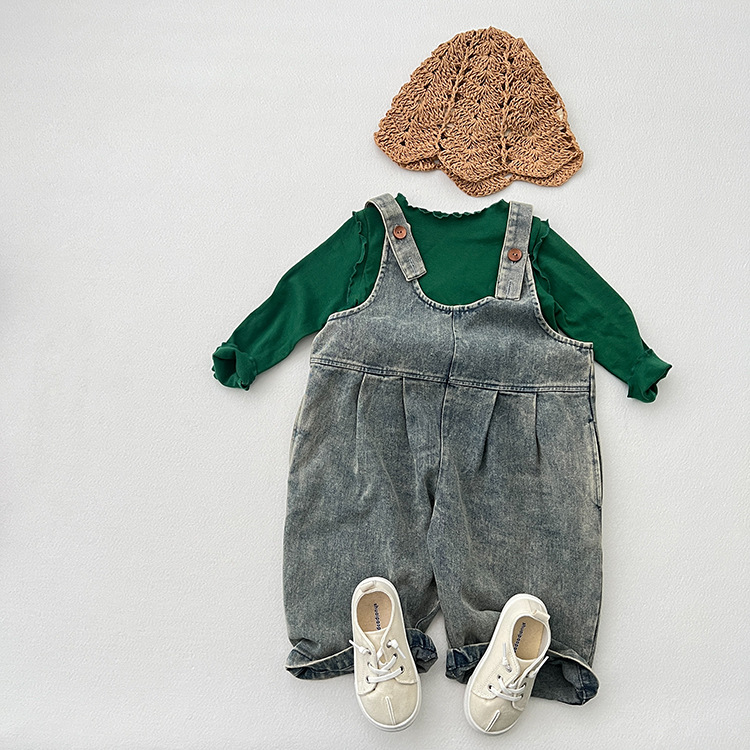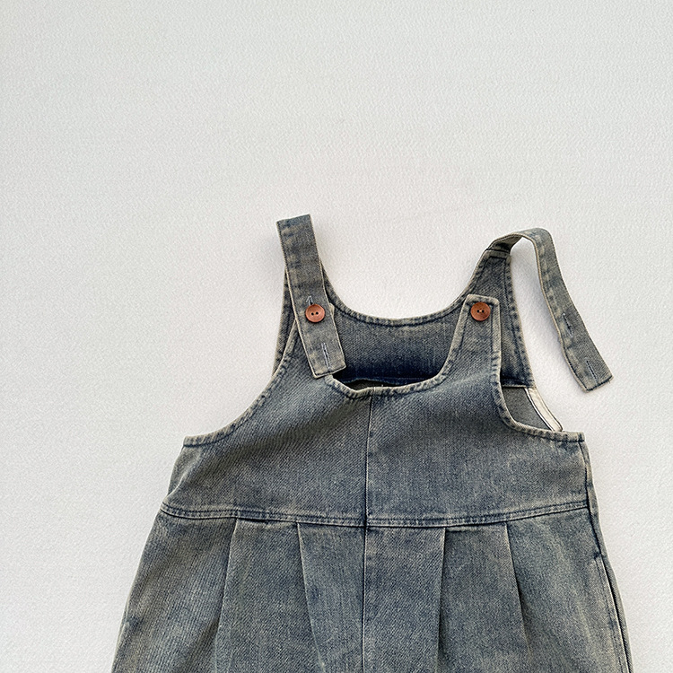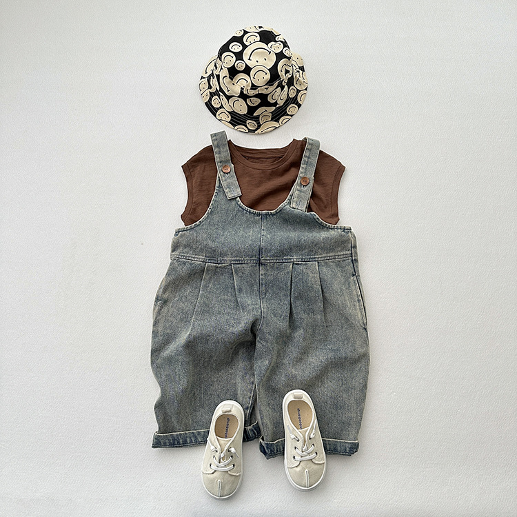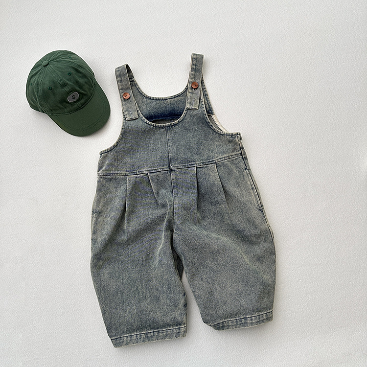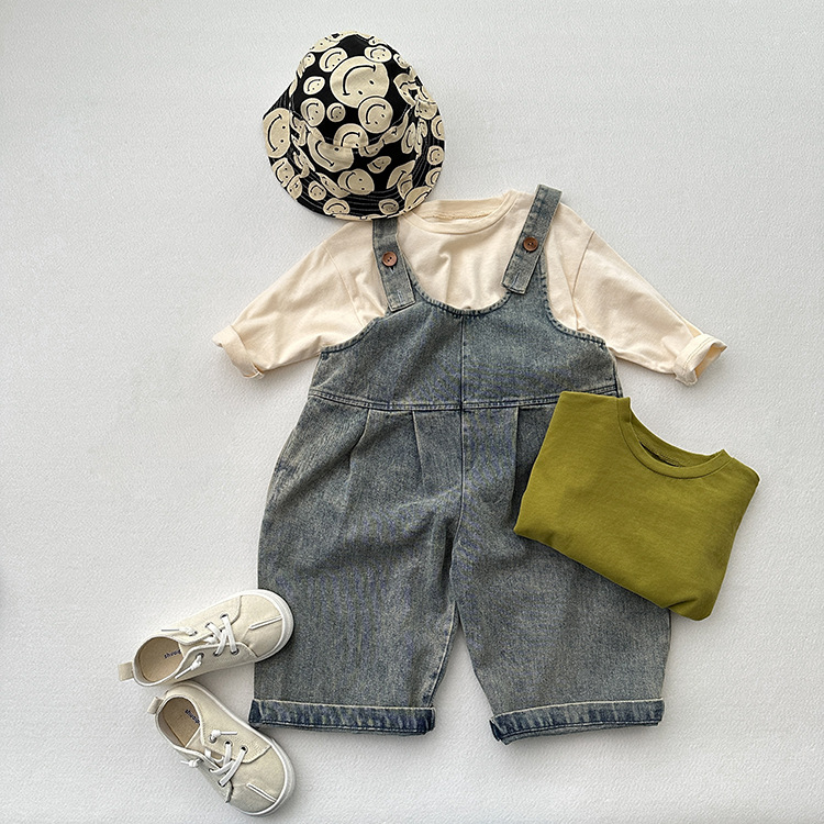 봄과 여름 새로운 어린이 한국 스타일의 간단한 올 매치 점프 수트 소년과 소녀 복고풍 귀여운 트렌디 한 라이트 블루 데님 서스펜더 바지스토어 가기