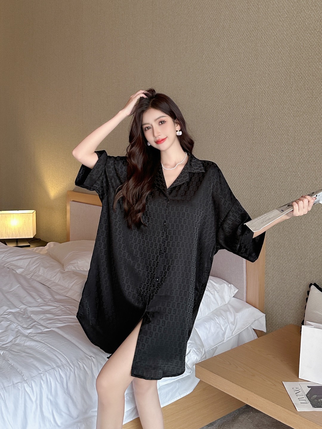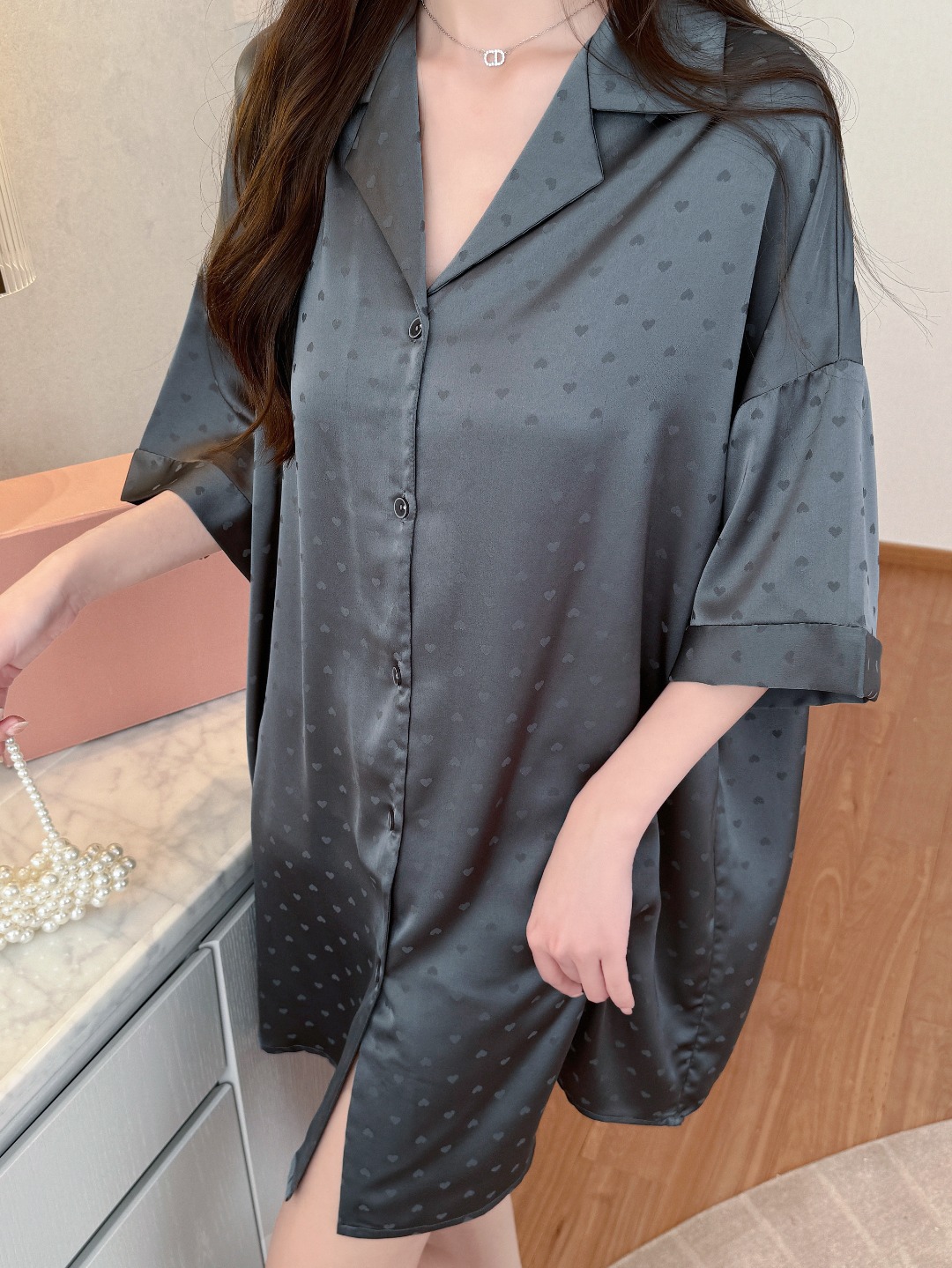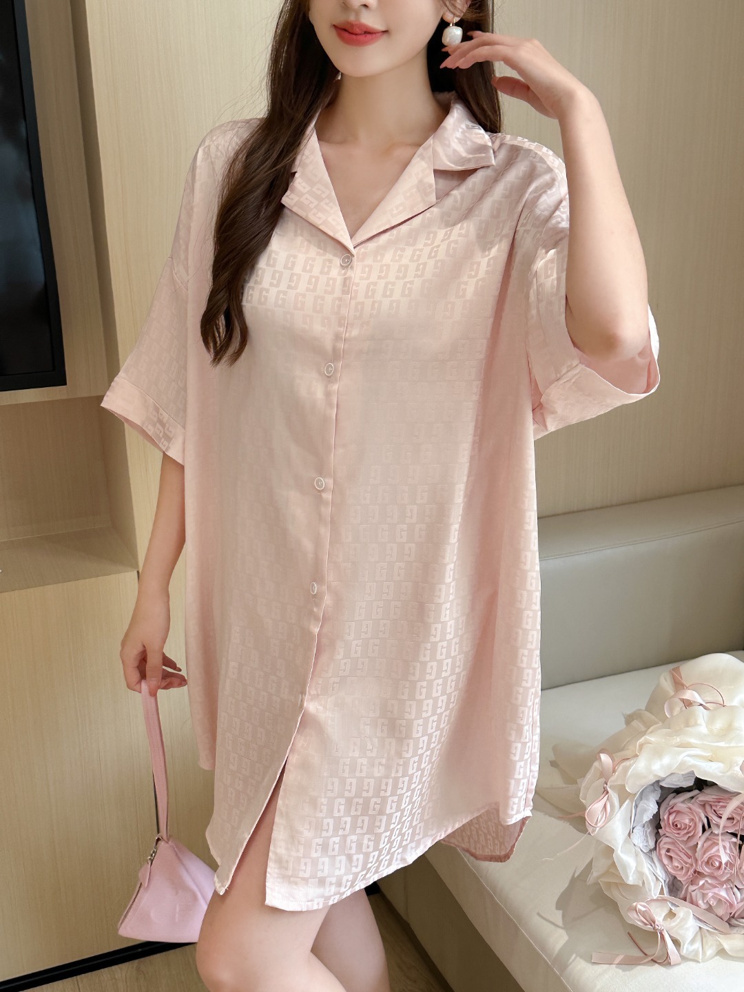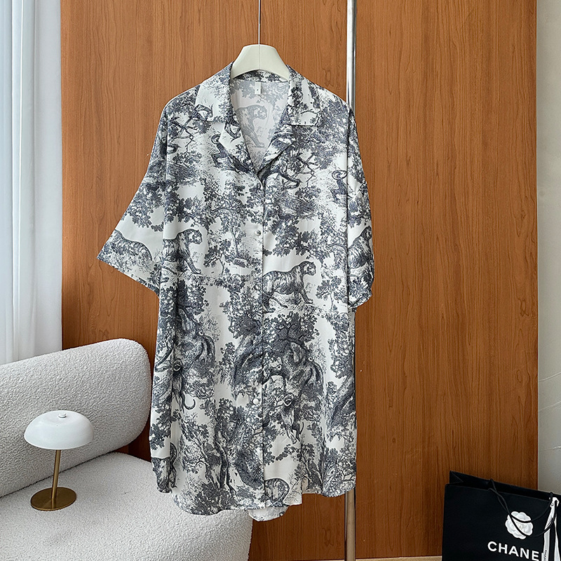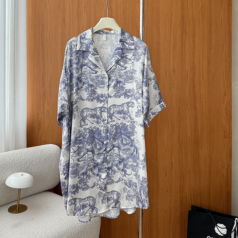 한국식 심플한 스타일 셔츠 원피스 잠옷 여성 실크 긴소매 봄과 여름 가정복 세트 도매스토어 가기
