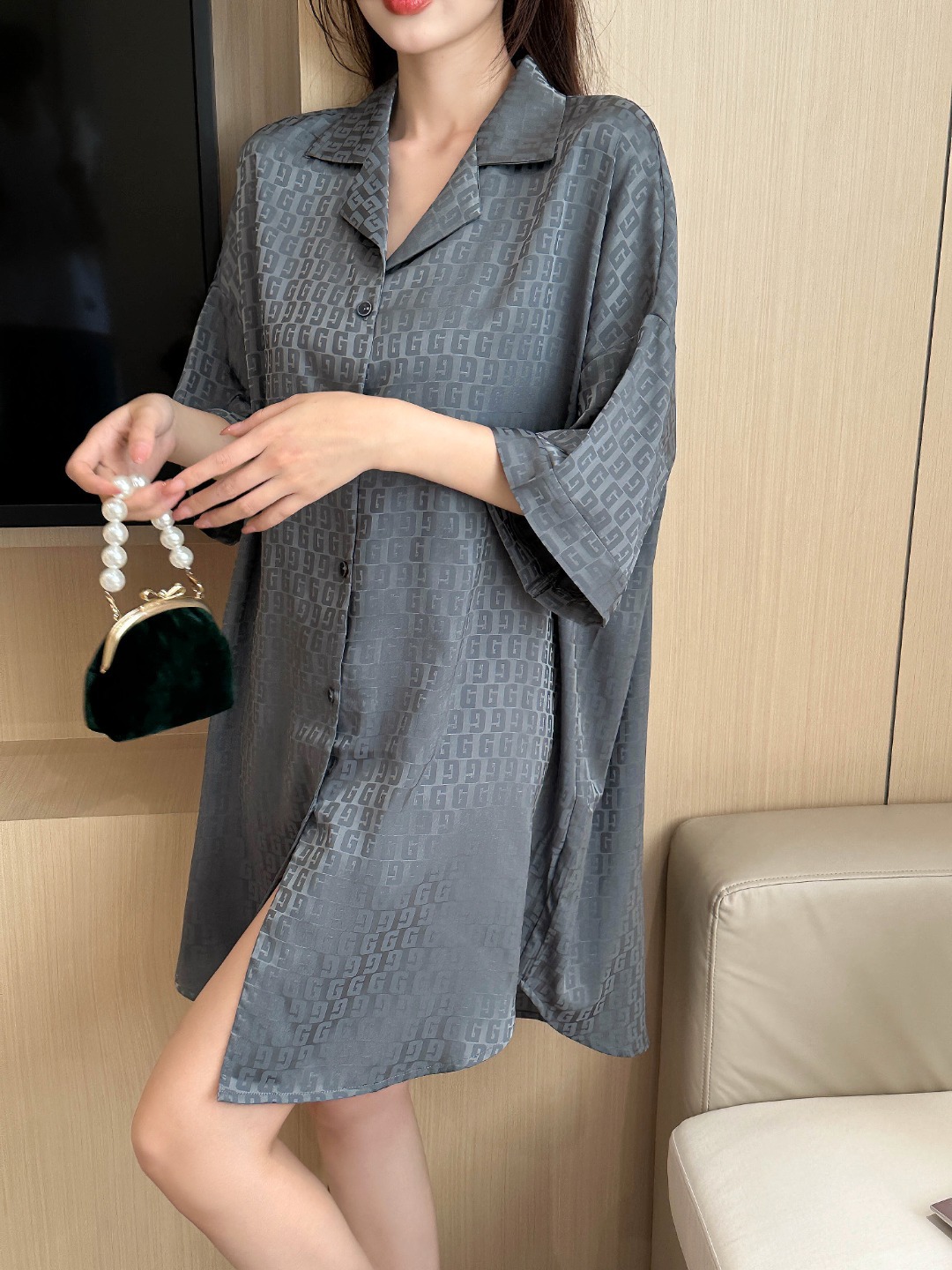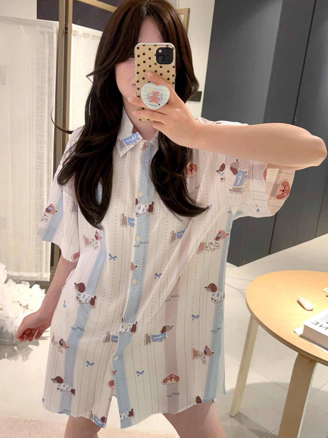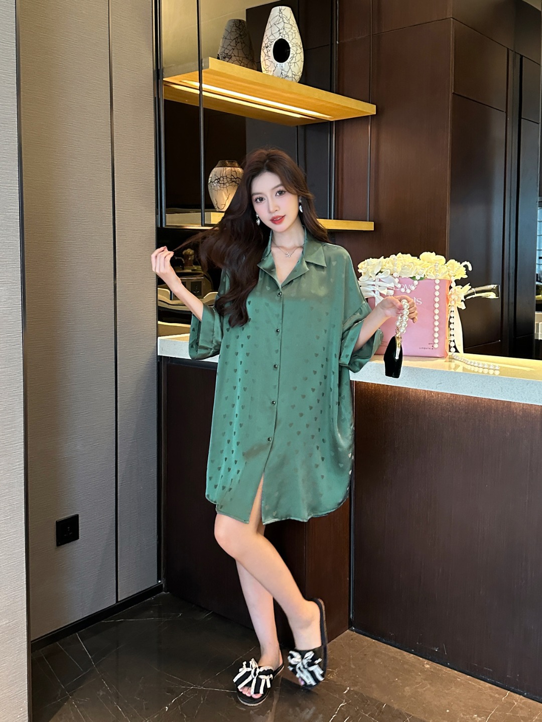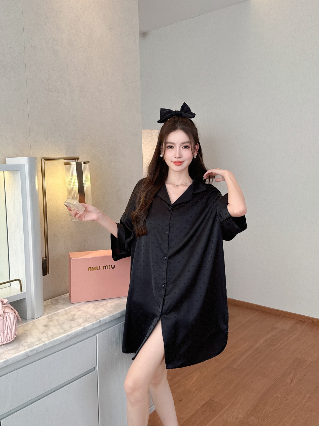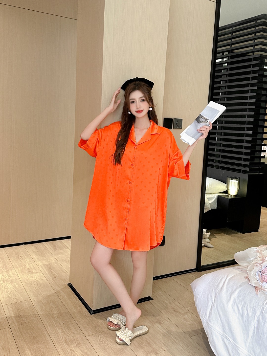 한국식 심플한 스타일 셔츠 원피스 잠옷 여성 실크 긴소매 봄과 여름 가정복 세트 도매스토어 가기