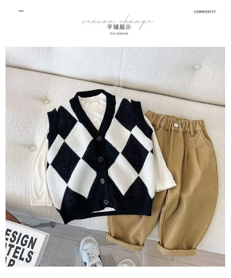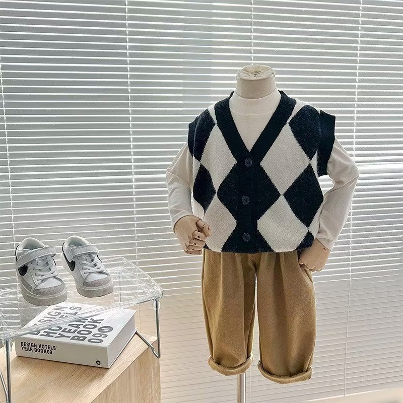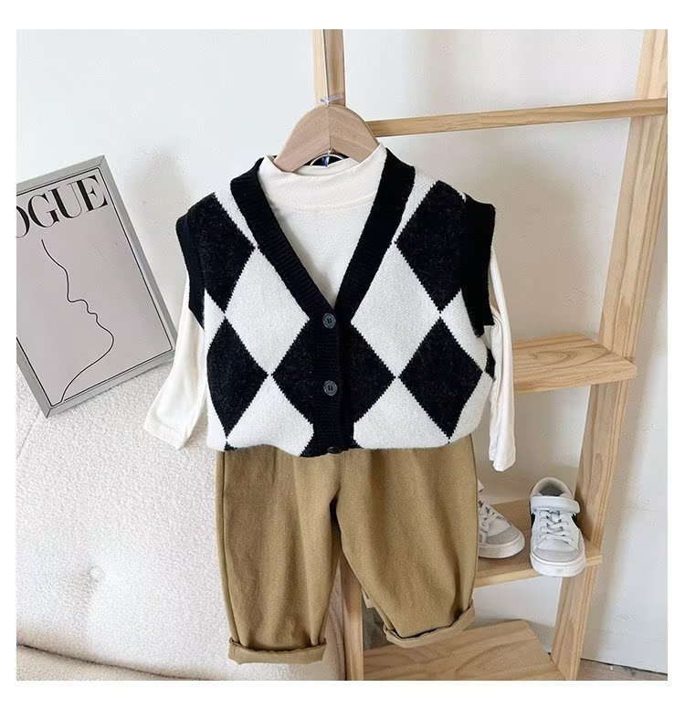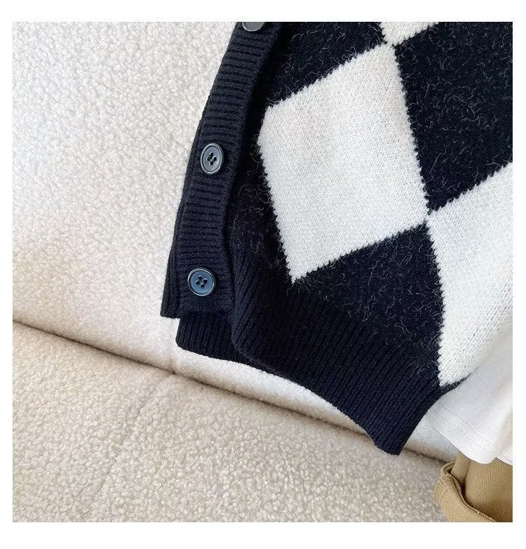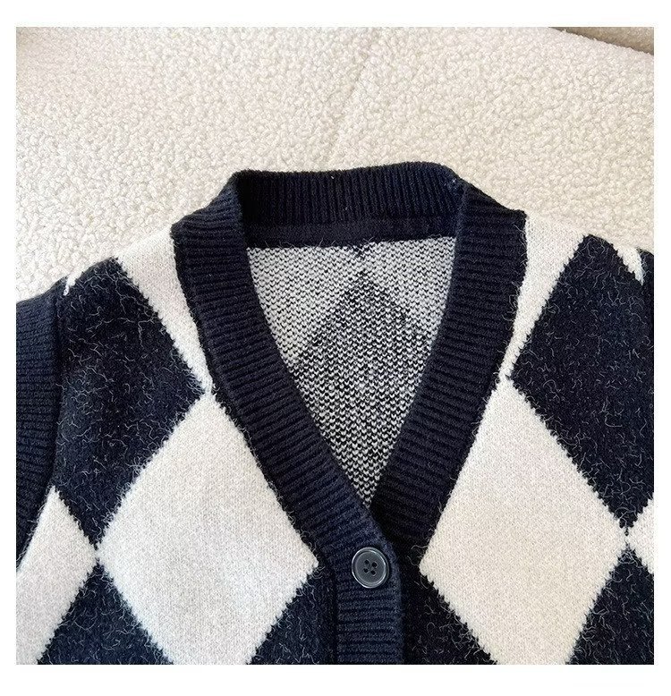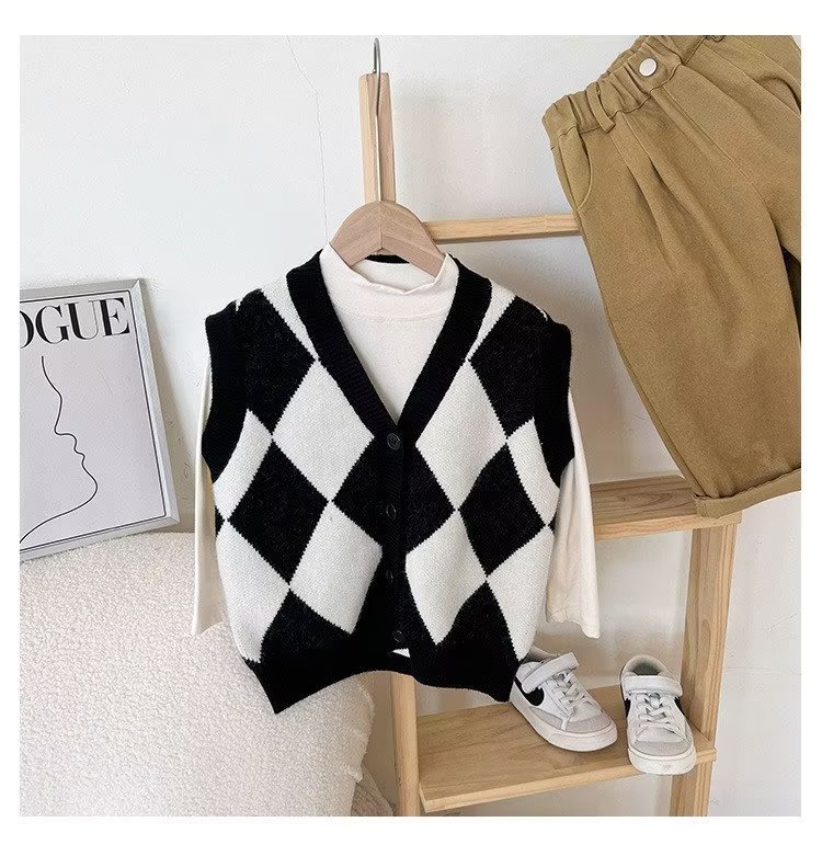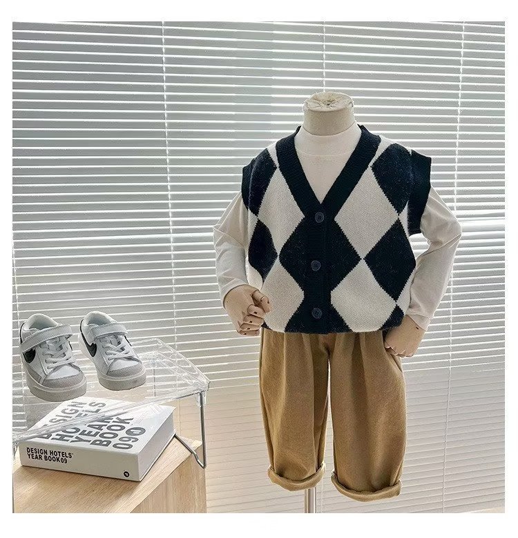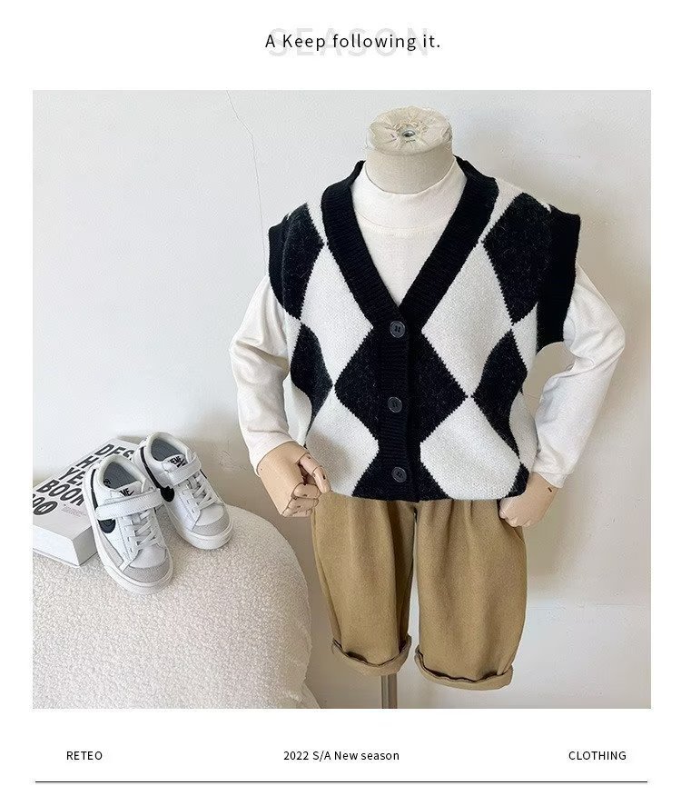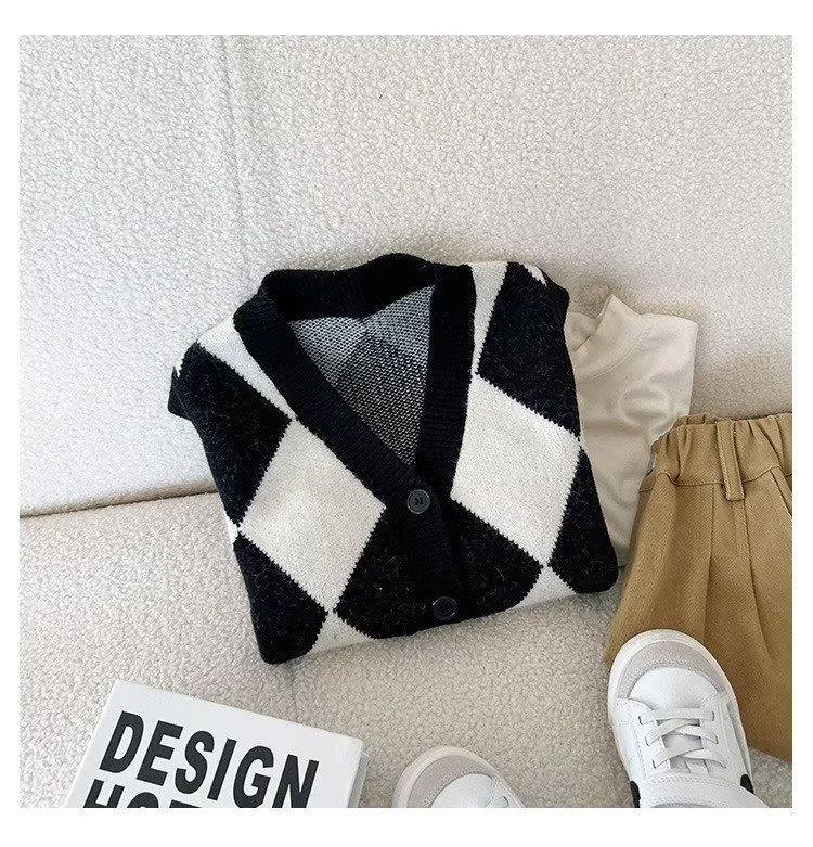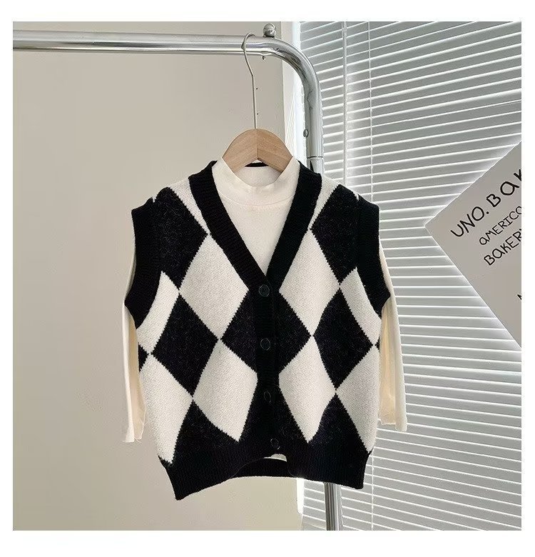 남학생을위한 마름모 스웨터 조끼 가을 및 겨울 V 넥 카디건 니트 조끼 아기 소녀 중소 어린이 양복 조끼