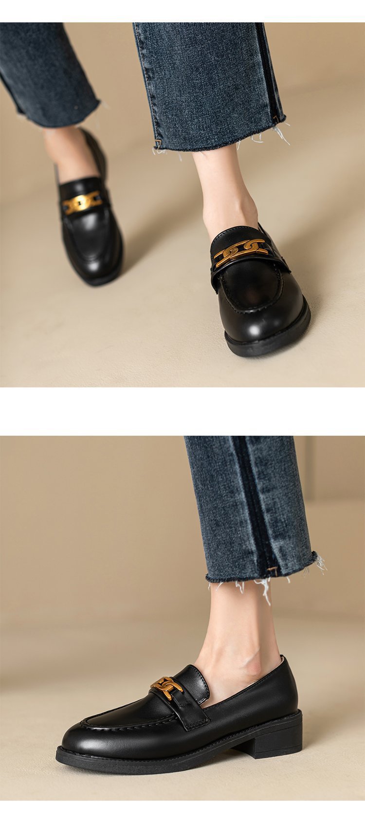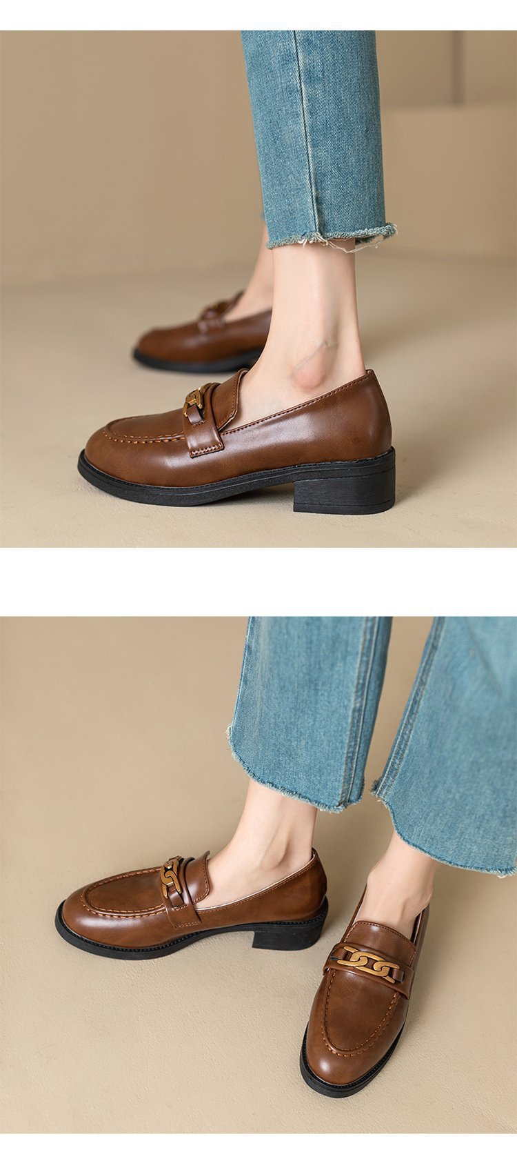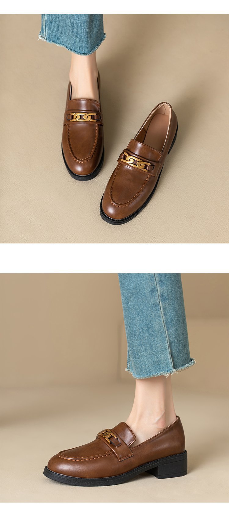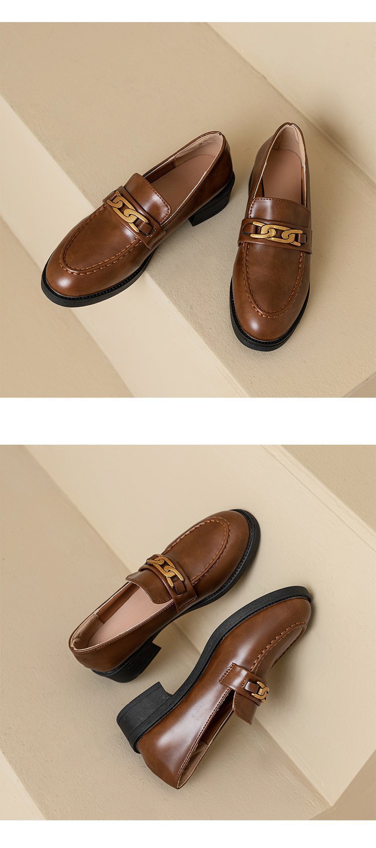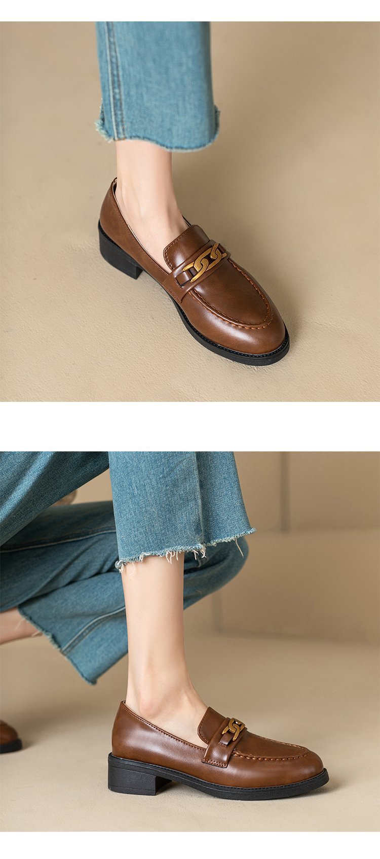 여성용 청키 힐 메탈 버클 로퍼 2024 봄 새로운 프랑스 레트로 다크 브라운 올 매치 싱글 라이닝 가죽 신발