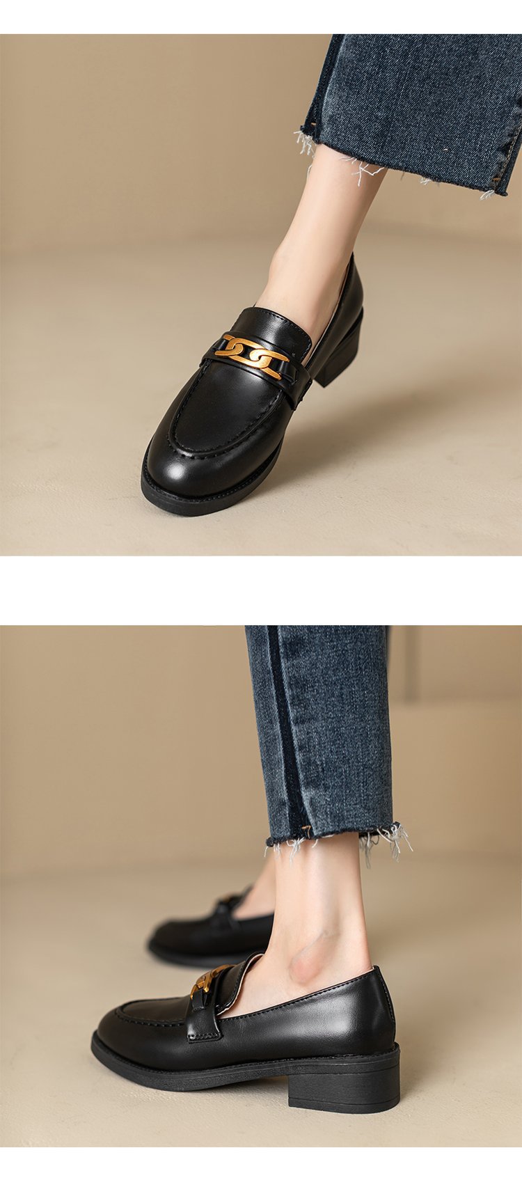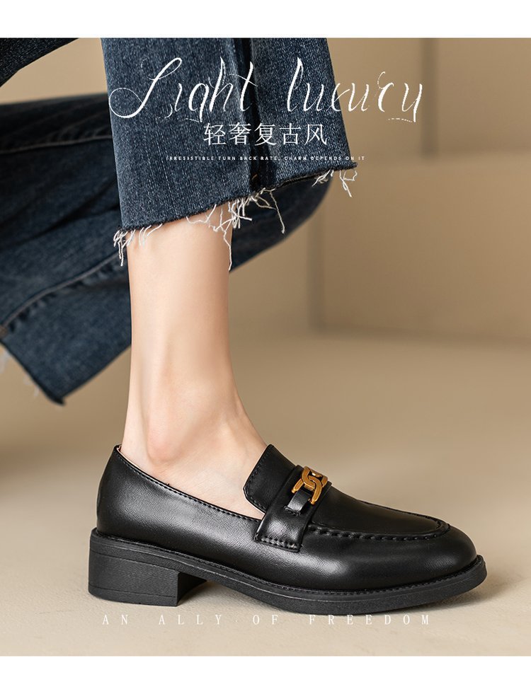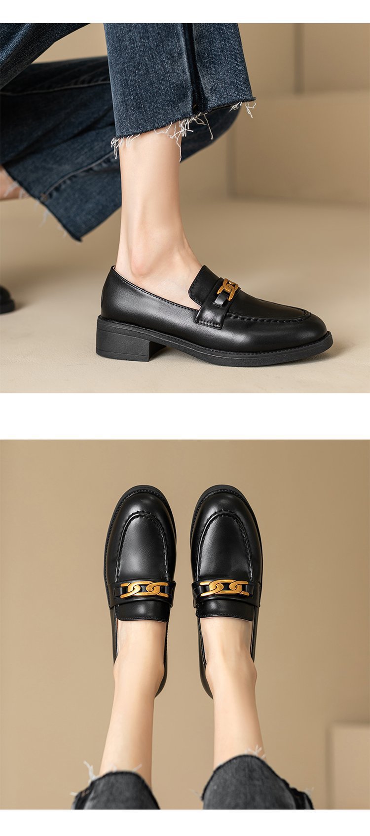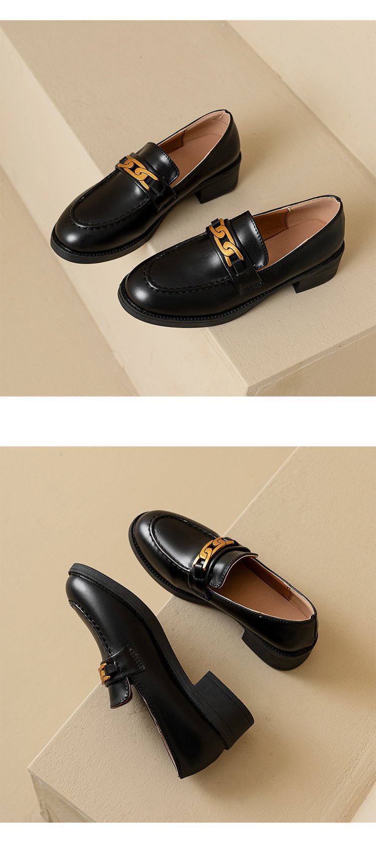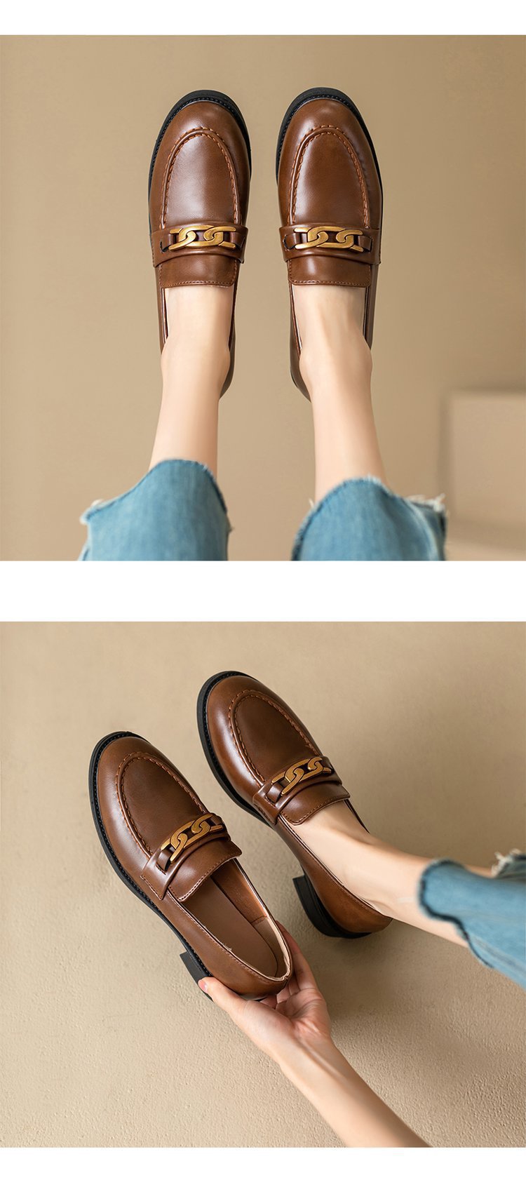 여성용 청키 힐 메탈 버클 로퍼 2024 봄 새로운 프랑스 레트로 다크 브라운 올 매치 싱글 라이닝 가죽 신발