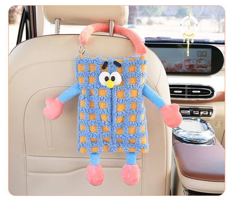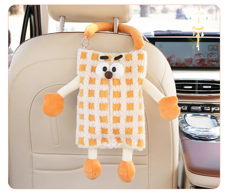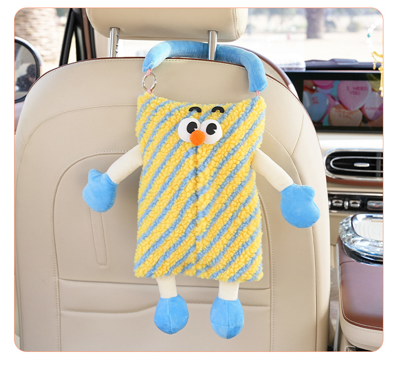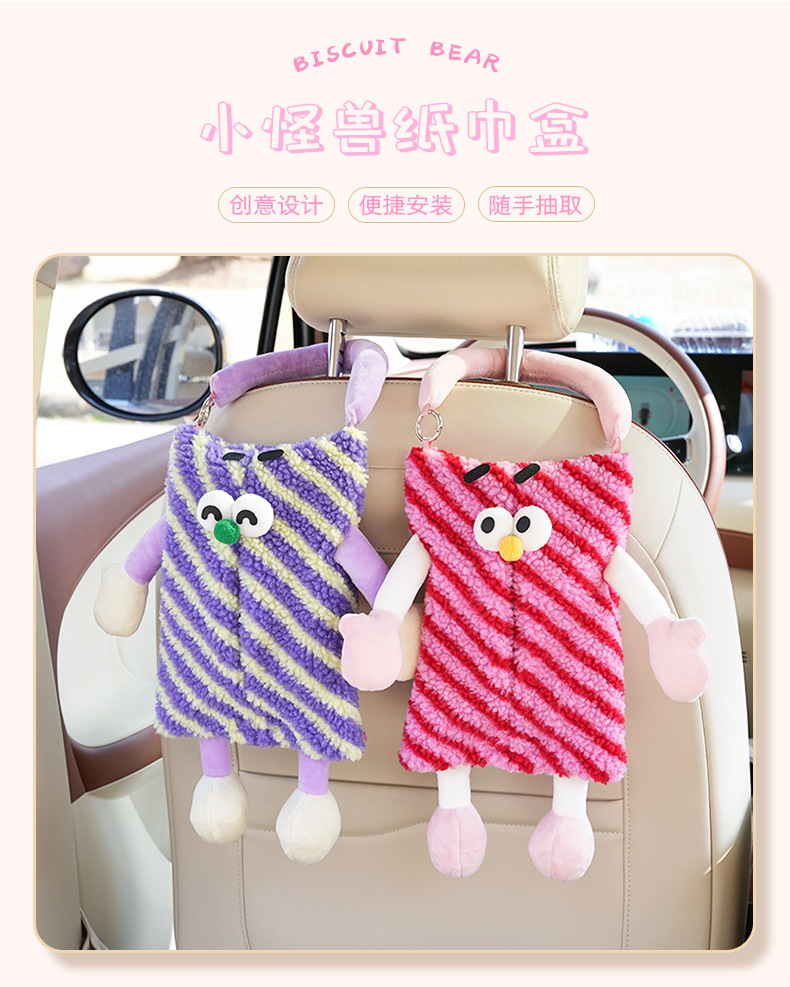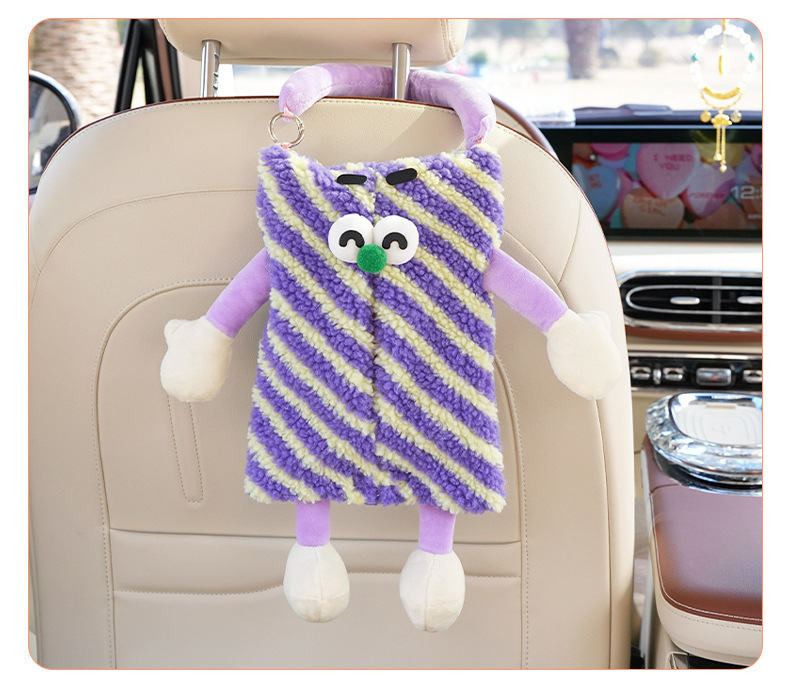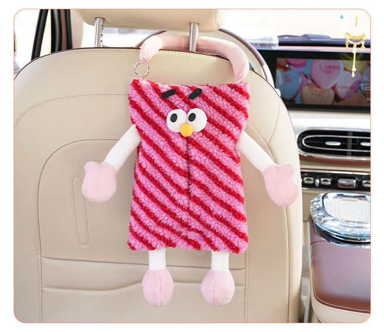 자동차 티슈 박스 플러시 스트라이프 체크 무늬 자동차 의자 다시 매달려 티슈 박스 귀여운 작은 괴물 자동차 티슈 박스