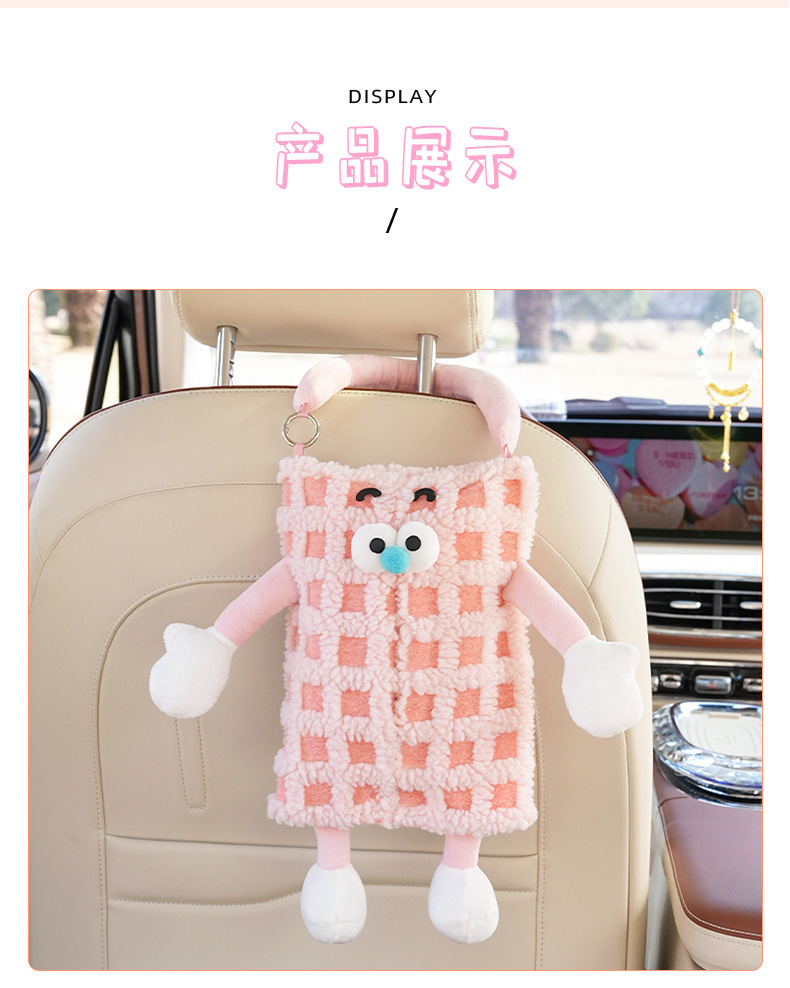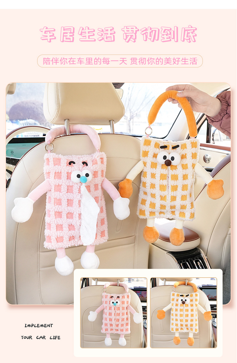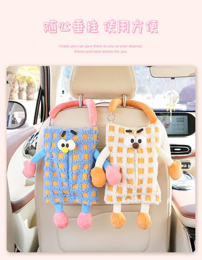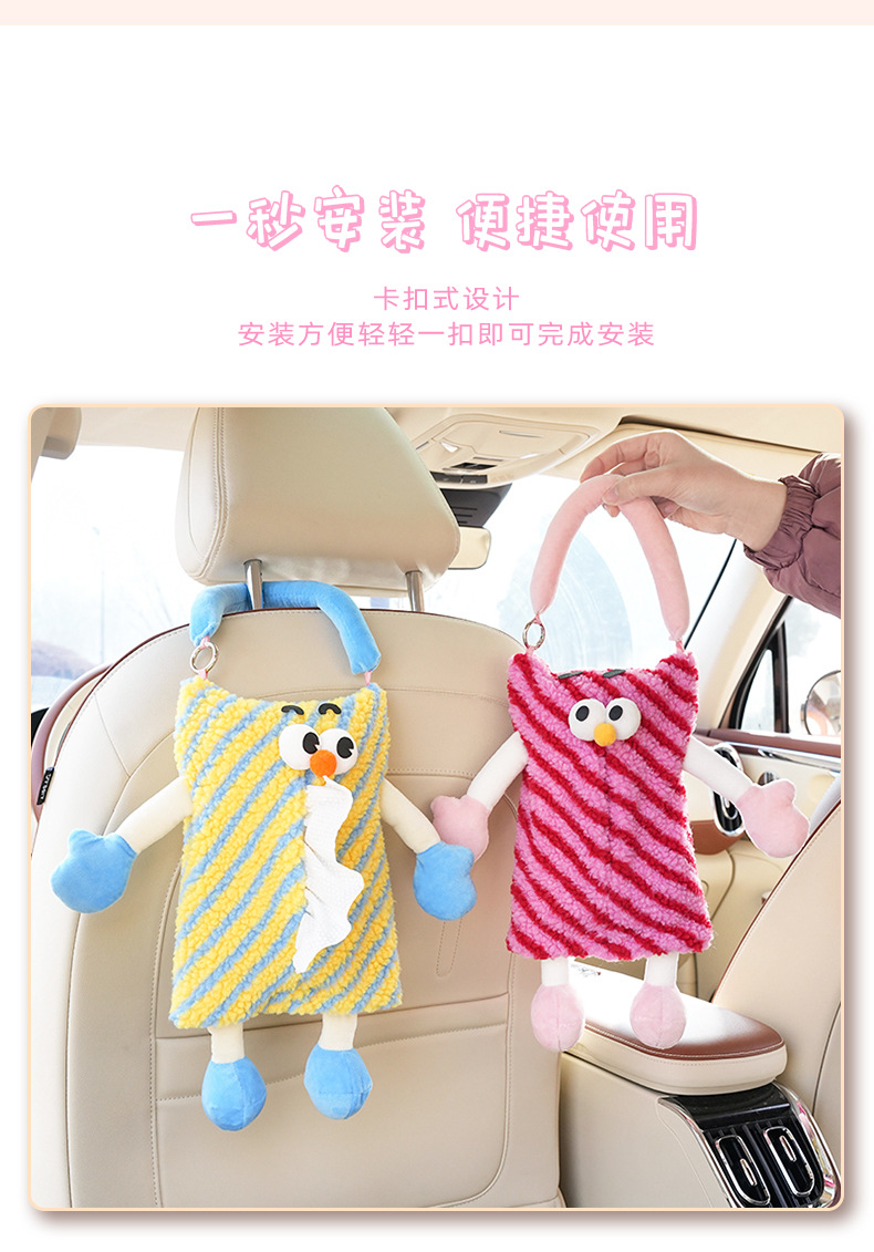 자동차 티슈 박스 플러시 스트라이프 체크 무늬 자동차 의자 다시 매달려 티슈 박스 귀여운 작은 괴물 자동차 티슈 박스스토어 가기