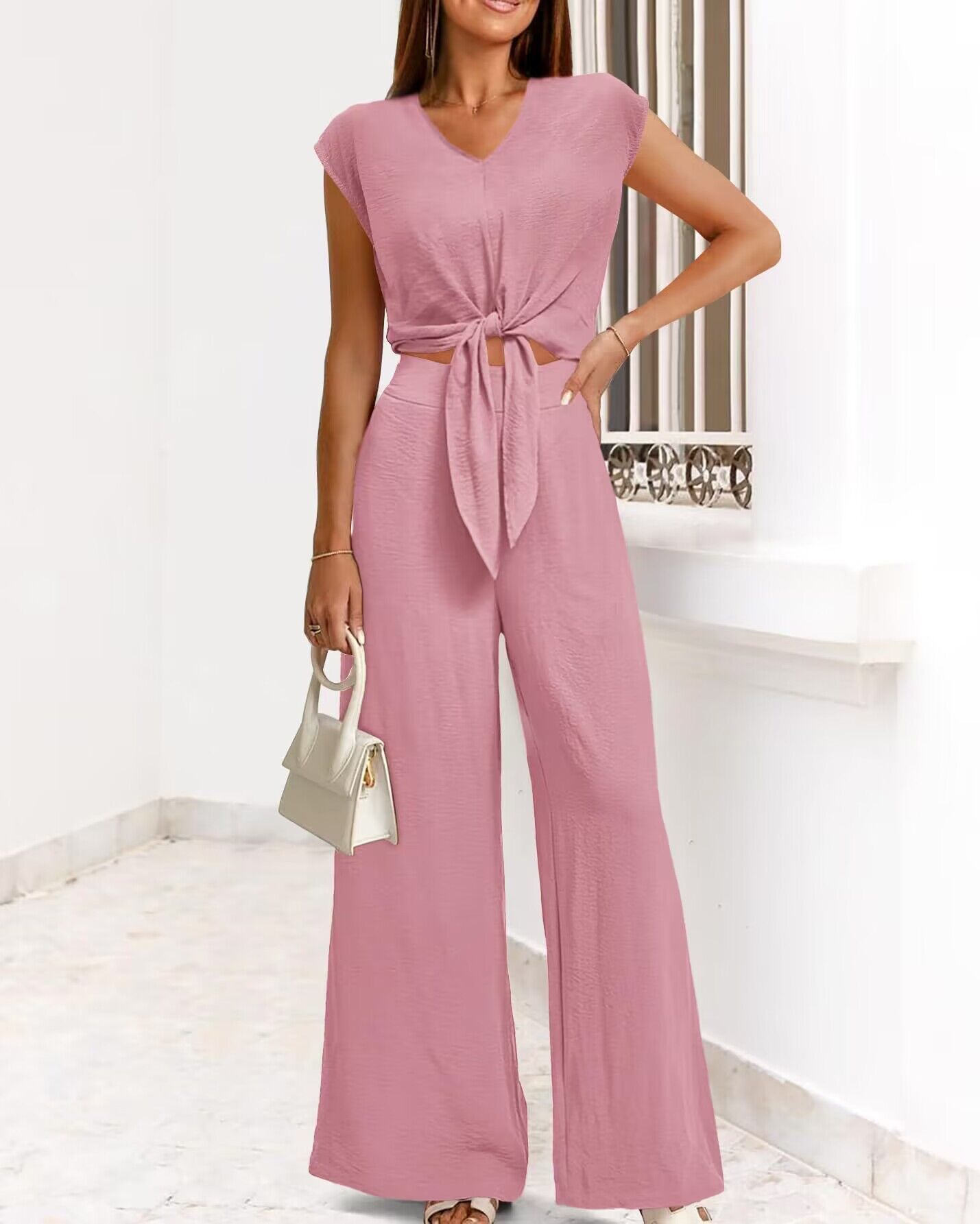 2024 유럽과 미국의 패션 여성 여름 2 피스 커버 슬리브 V-Neck 벨트 쇼트 탑 와이드 다리 바지 세트
