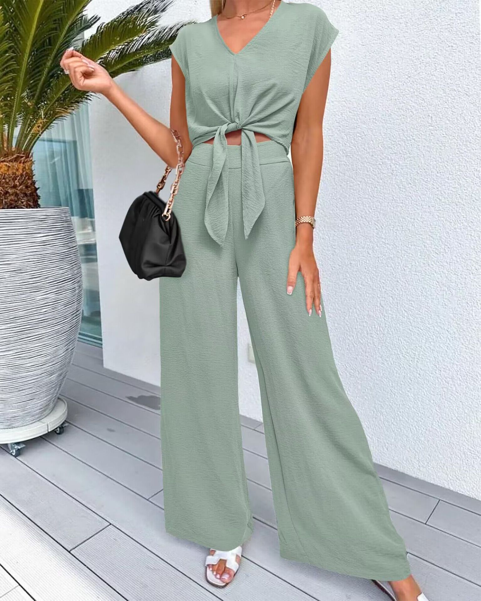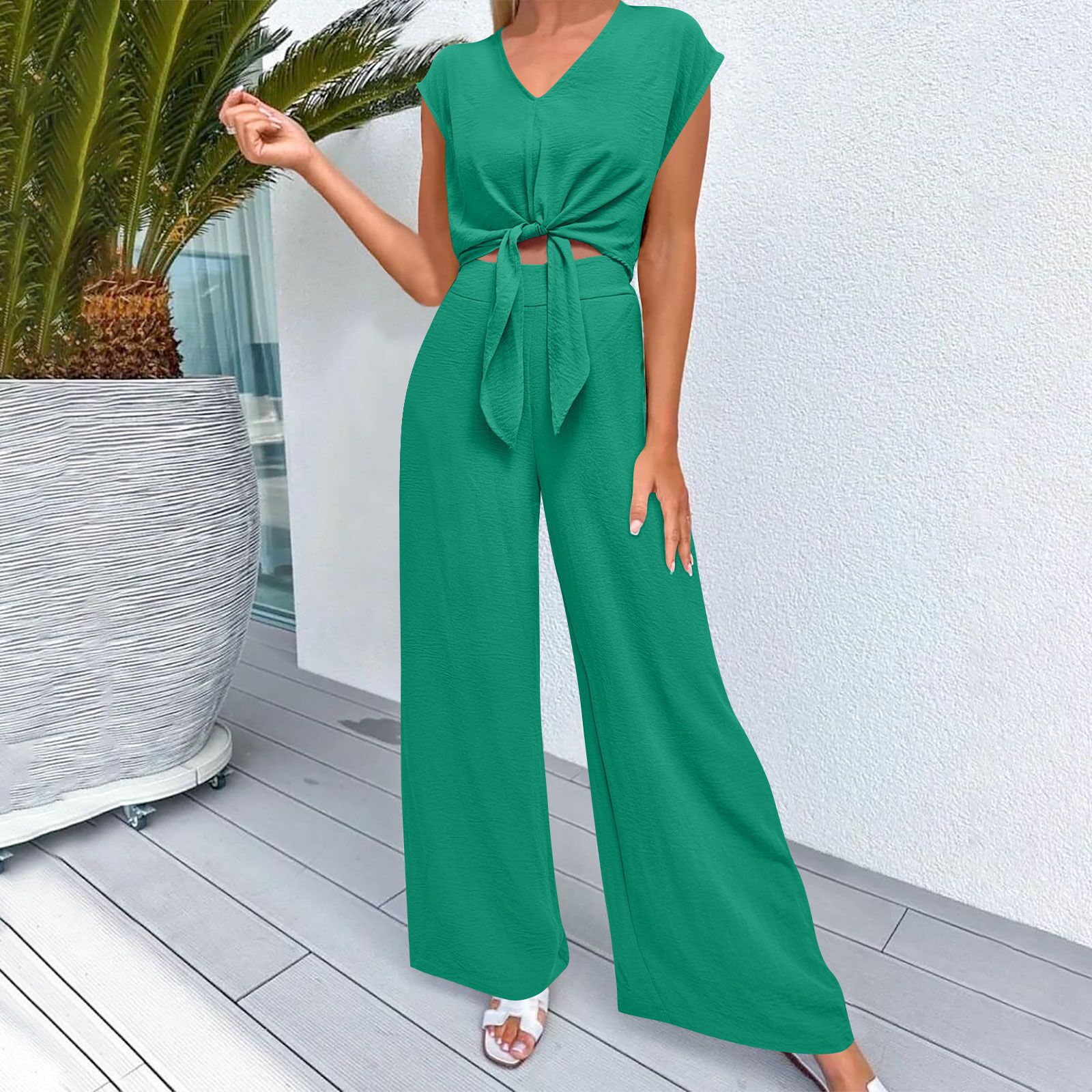 2024 유럽과 미국의 패션 여성 여름 2 피스 커버 슬리브 V-Neck 벨트 쇼트 탑 와이드 다리 바지 세트스토어 가기