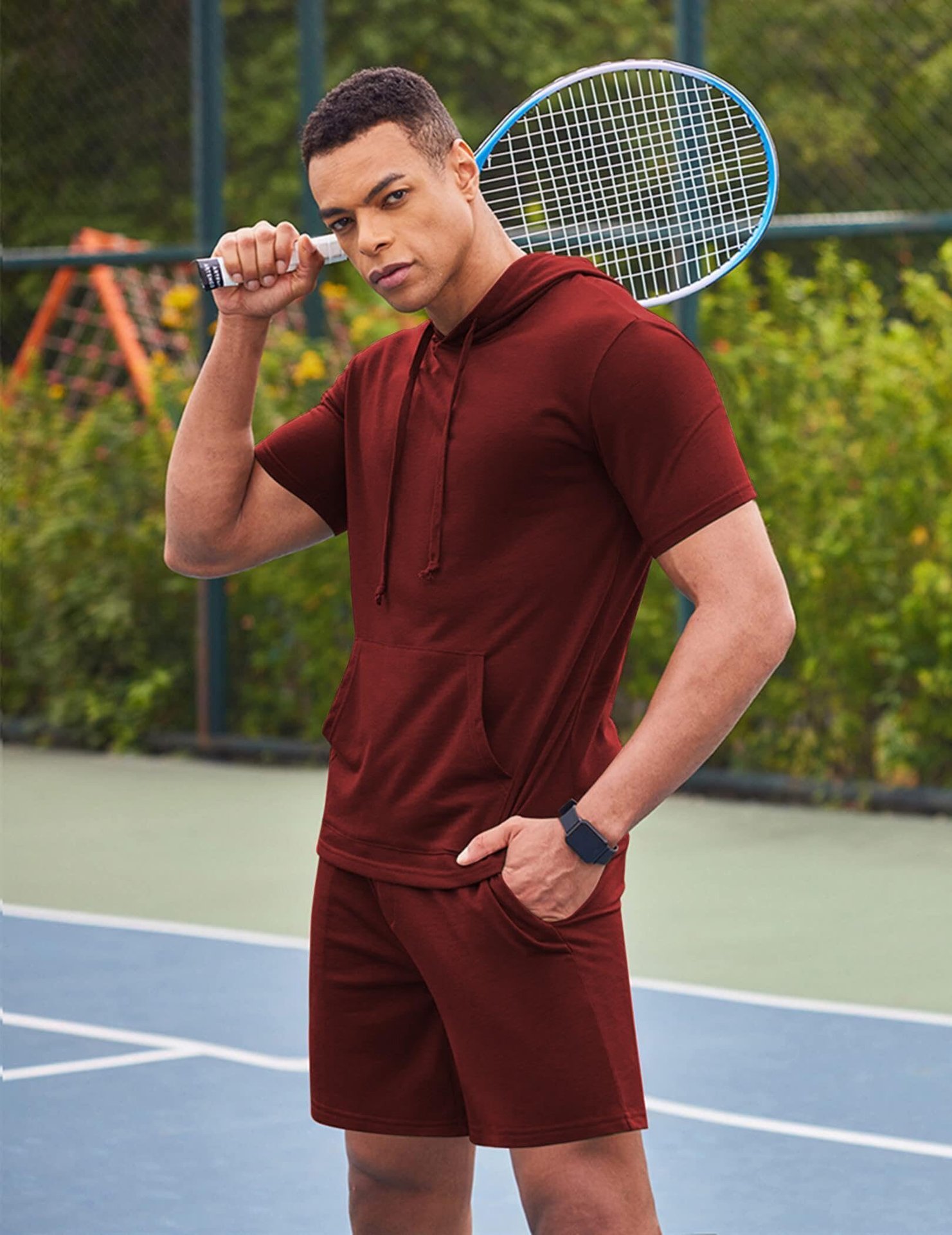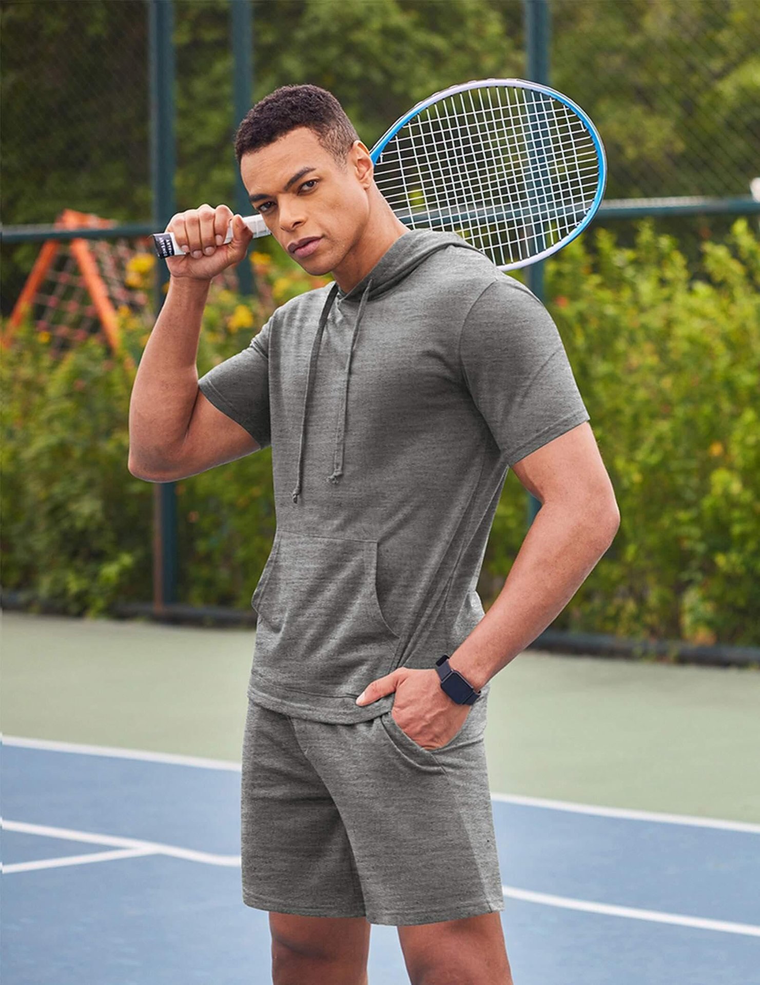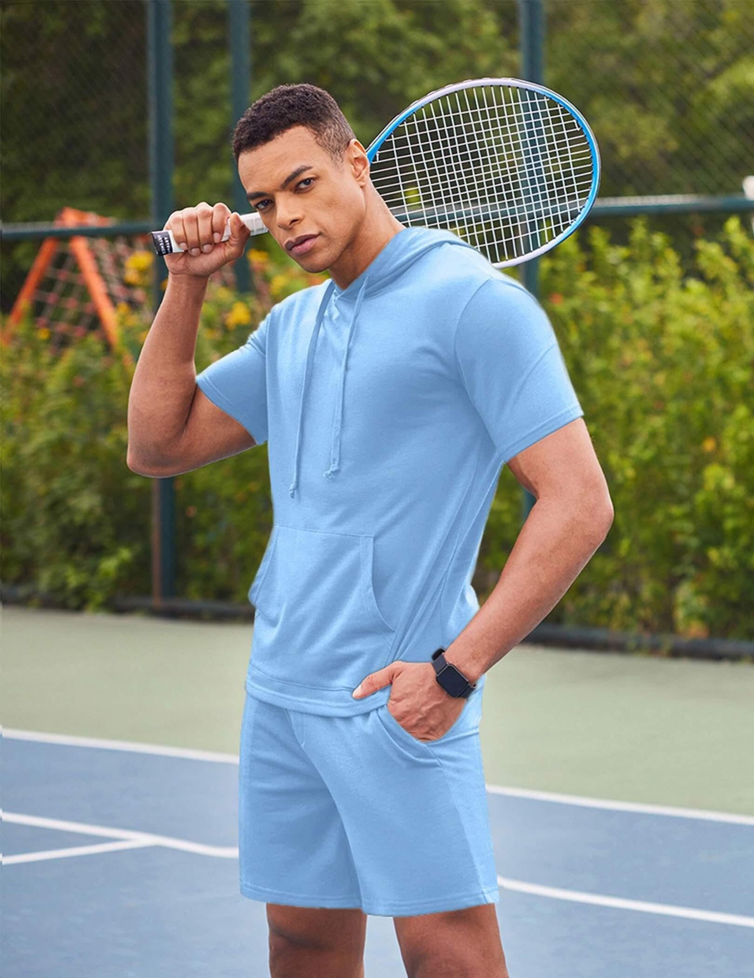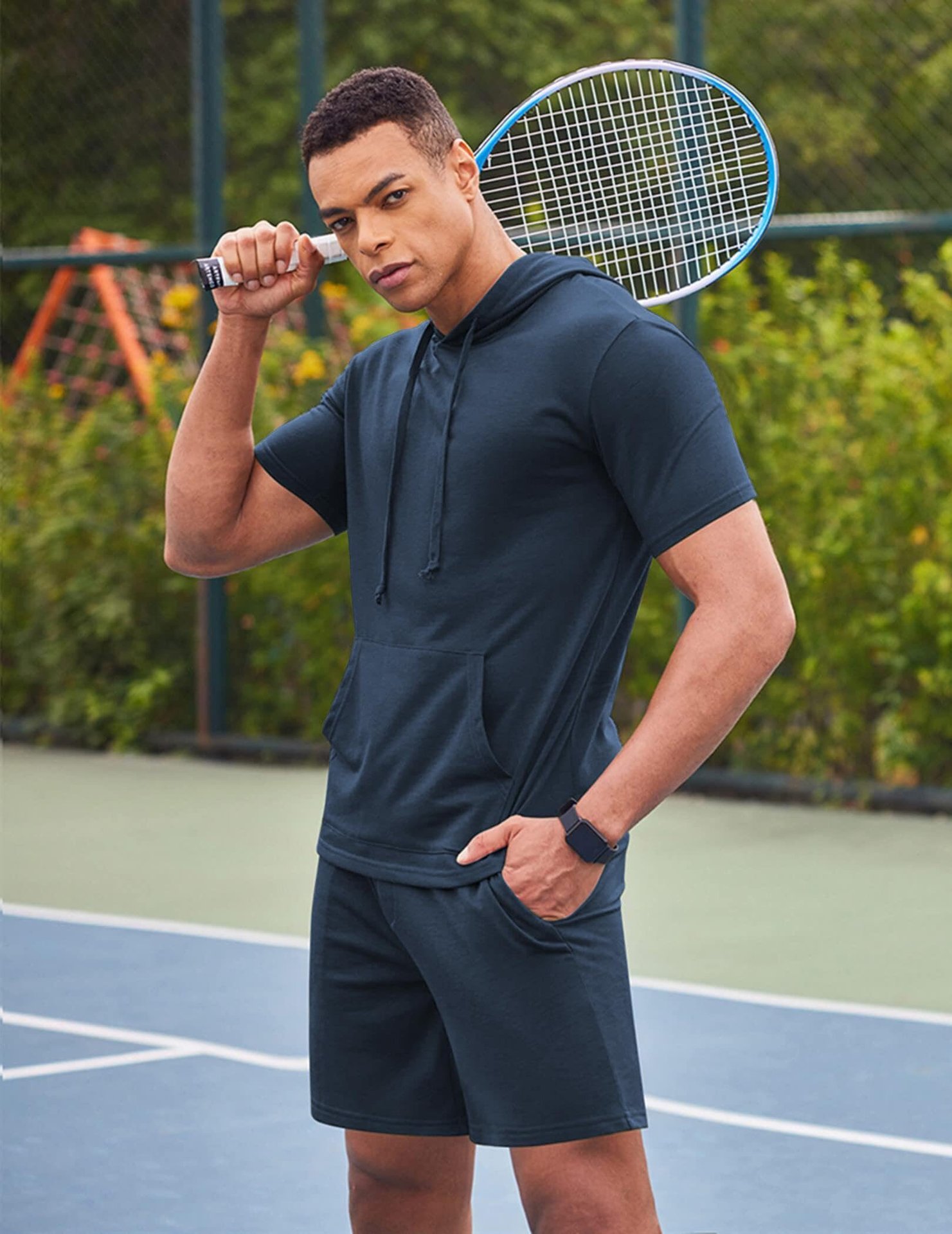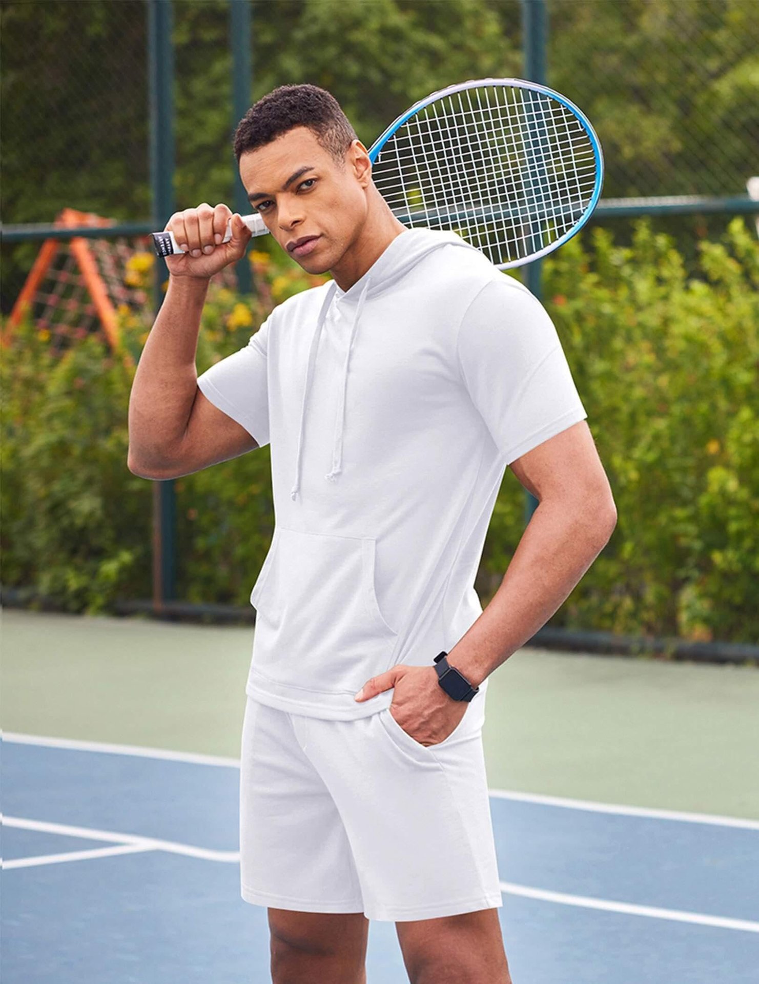 2024 국경 남성 여름 새로운 후드 스포츠 반팔 티셔츠 느슨한 플러스 사이즈 스트레이트 캐주얼 반바지 세트
