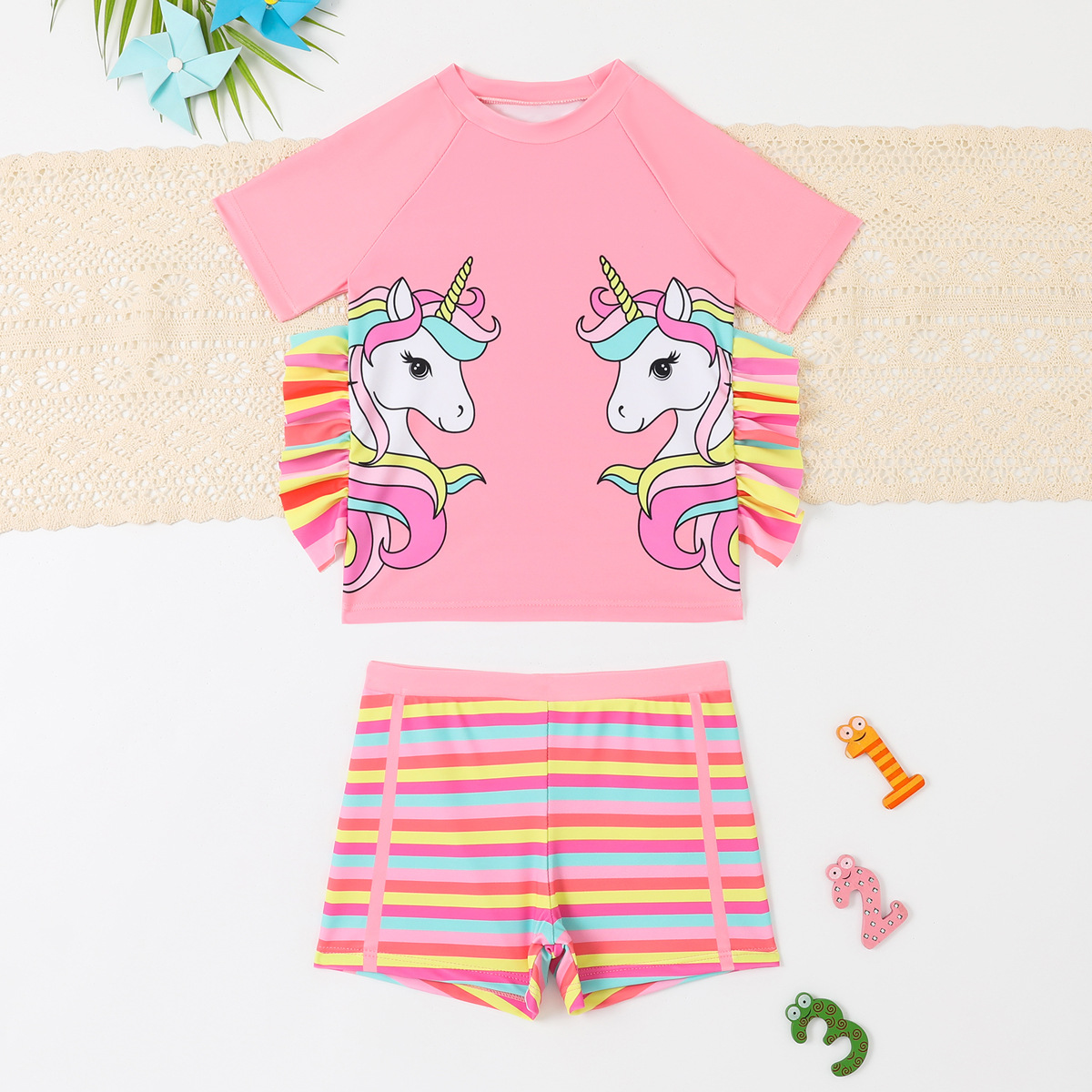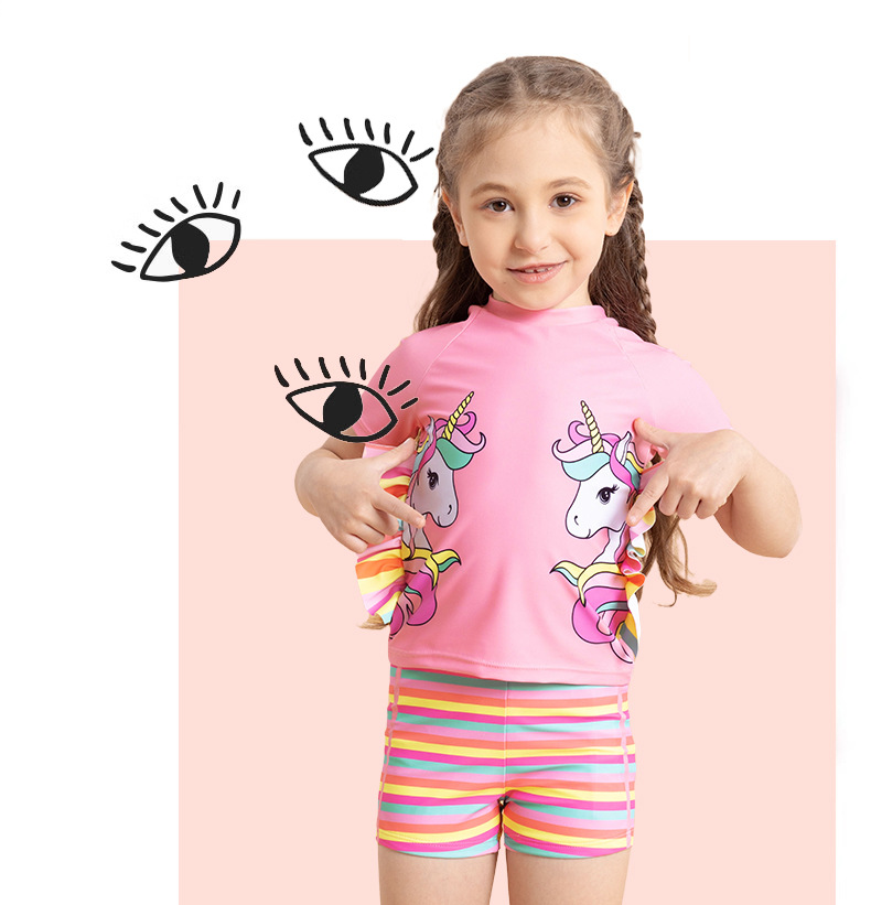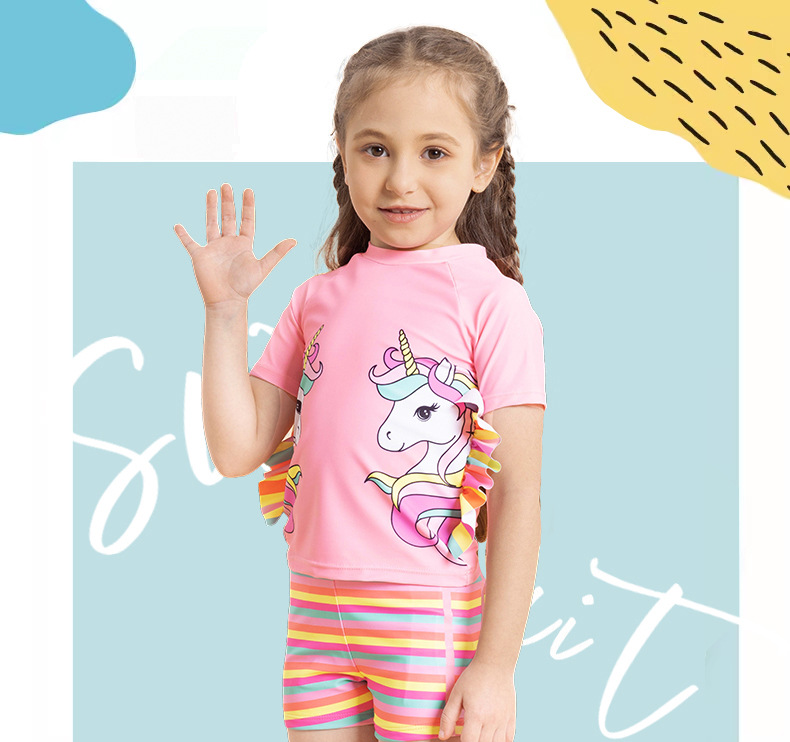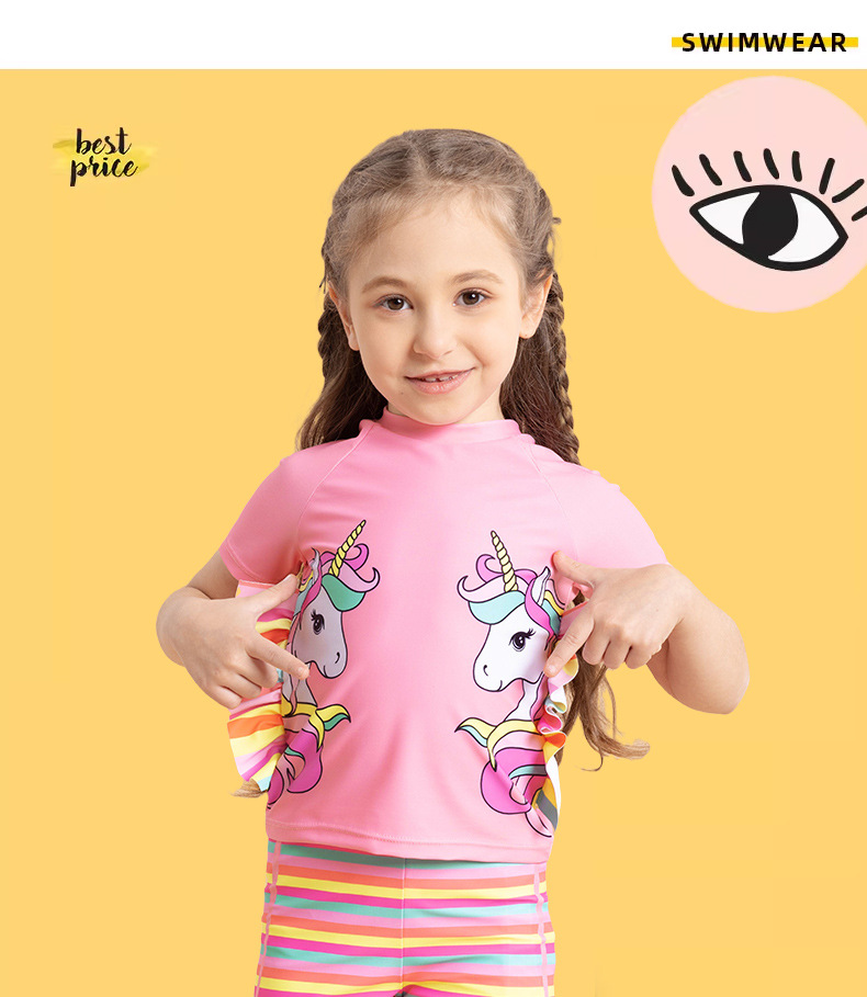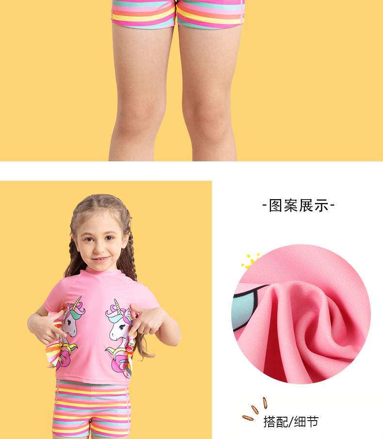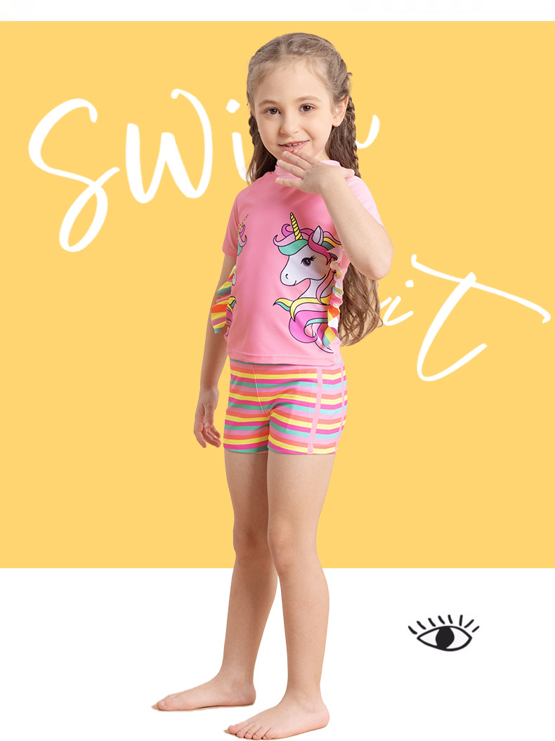 어린이 수영복 여아용 분리형 수영복 2025 반팔 유니콘 무지개 줄무늬 반바지 프릴 여아 수영복