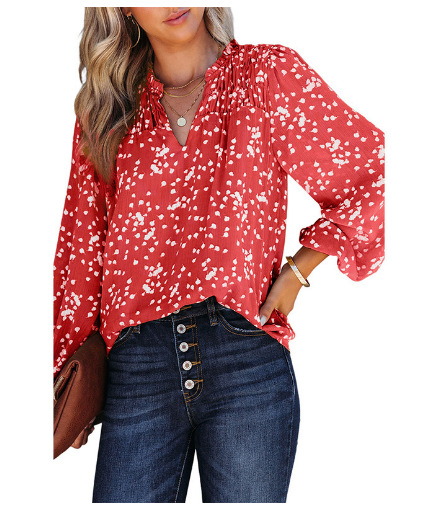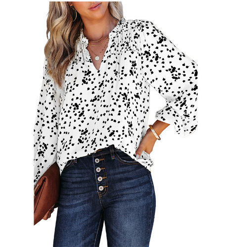 2025 유럽 및 미국 아마존 봄 여름 신상 여성 통근용 상의 V넥 긴팔 도트무늬 프린트 플리츠 셔츠