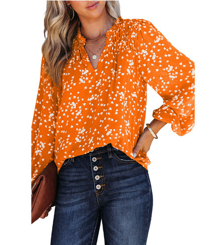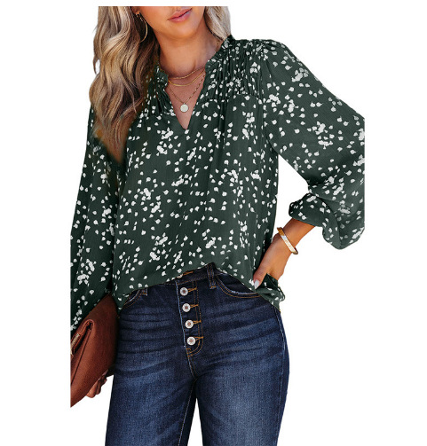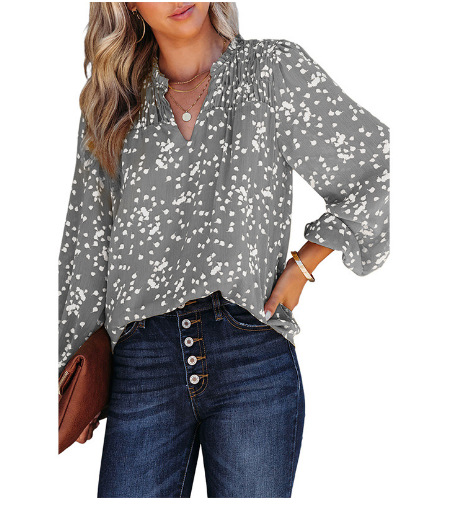 2025 유럽 및 미국 아마존 봄 여름 신상 여성 통근용 상의 V넥 긴팔 도트무늬 프린트 플리츠 셔츠스토어 가기
