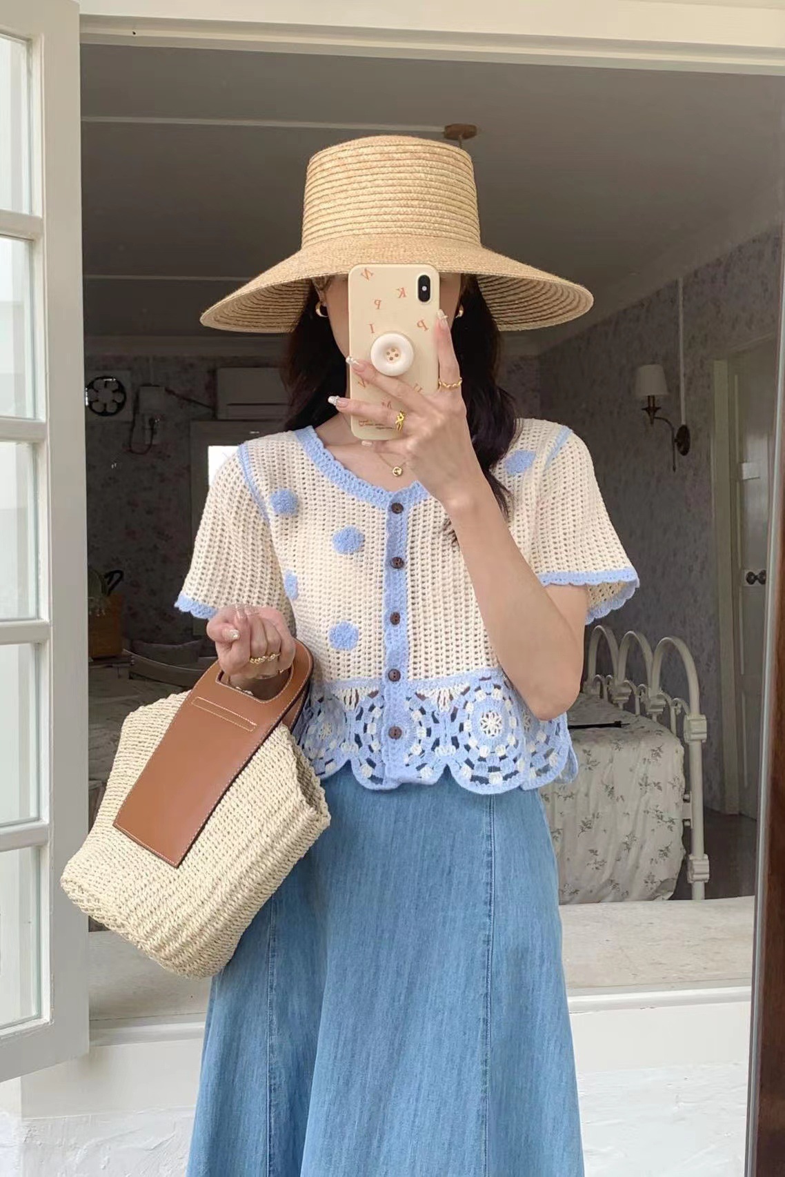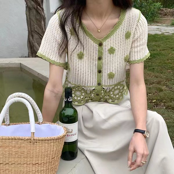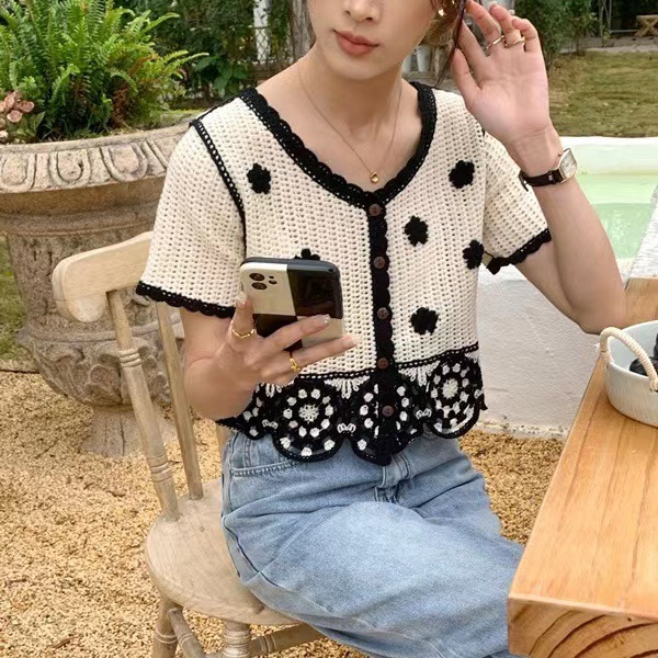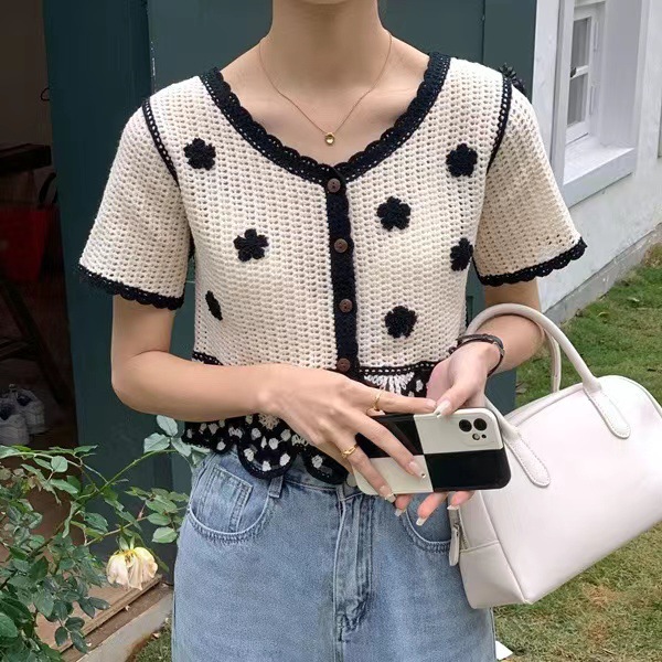 立体花朵镂空钩花针织开衫女夏装新款修身显瘦时尚撞色短款上衣服
