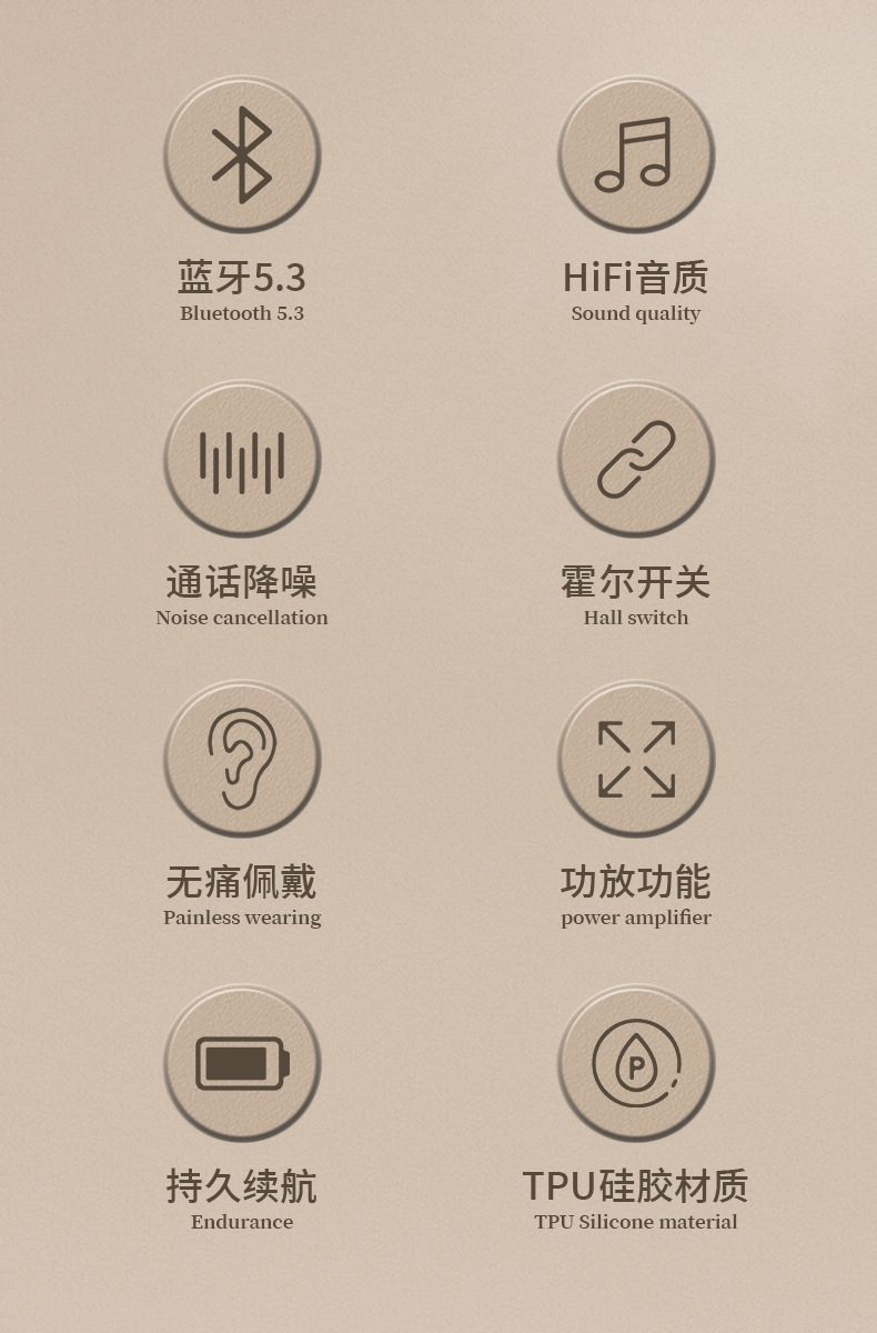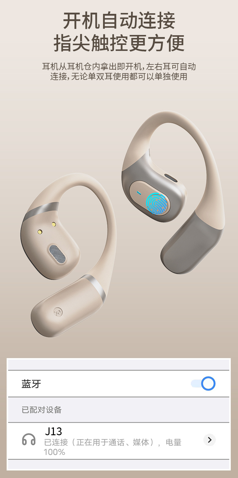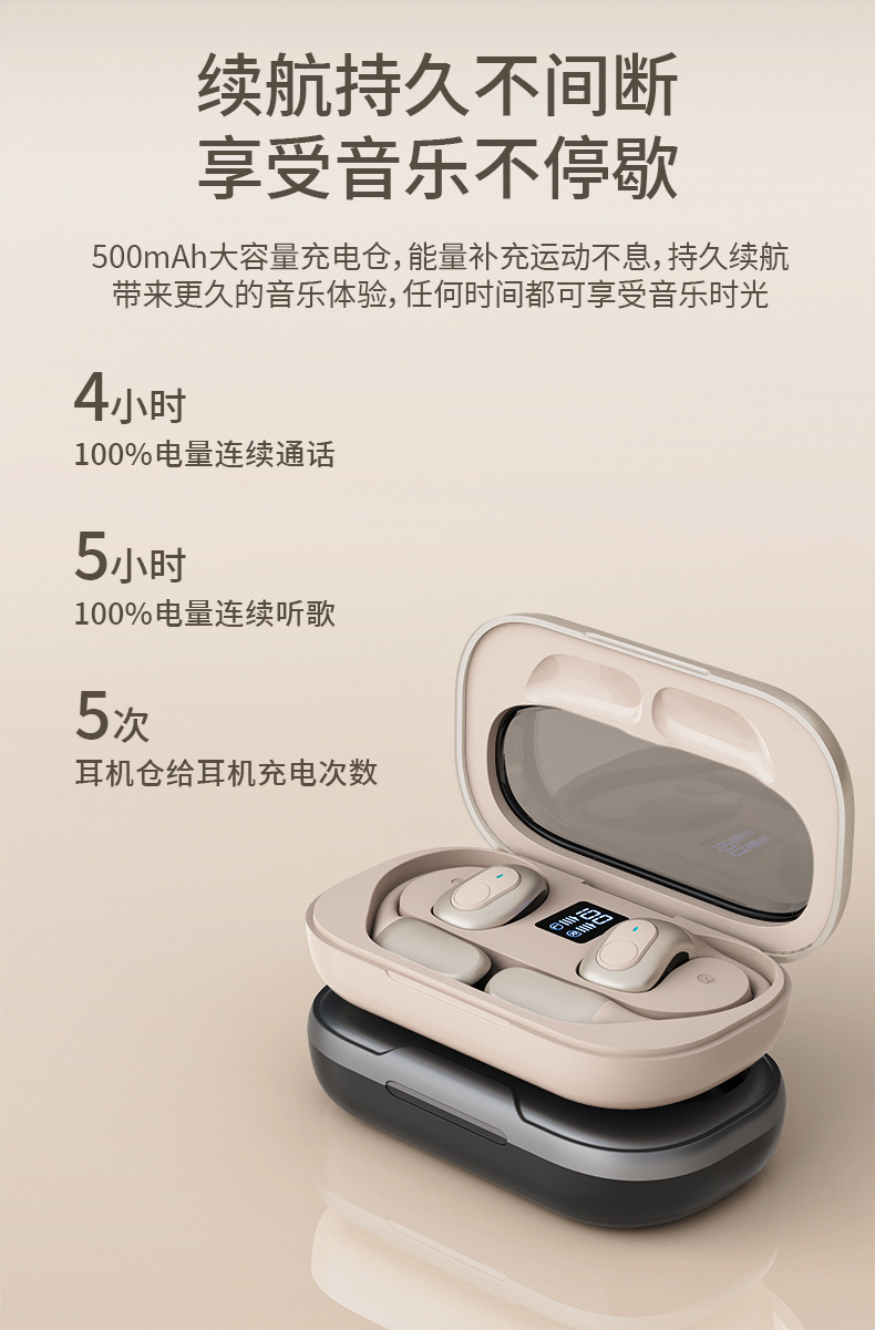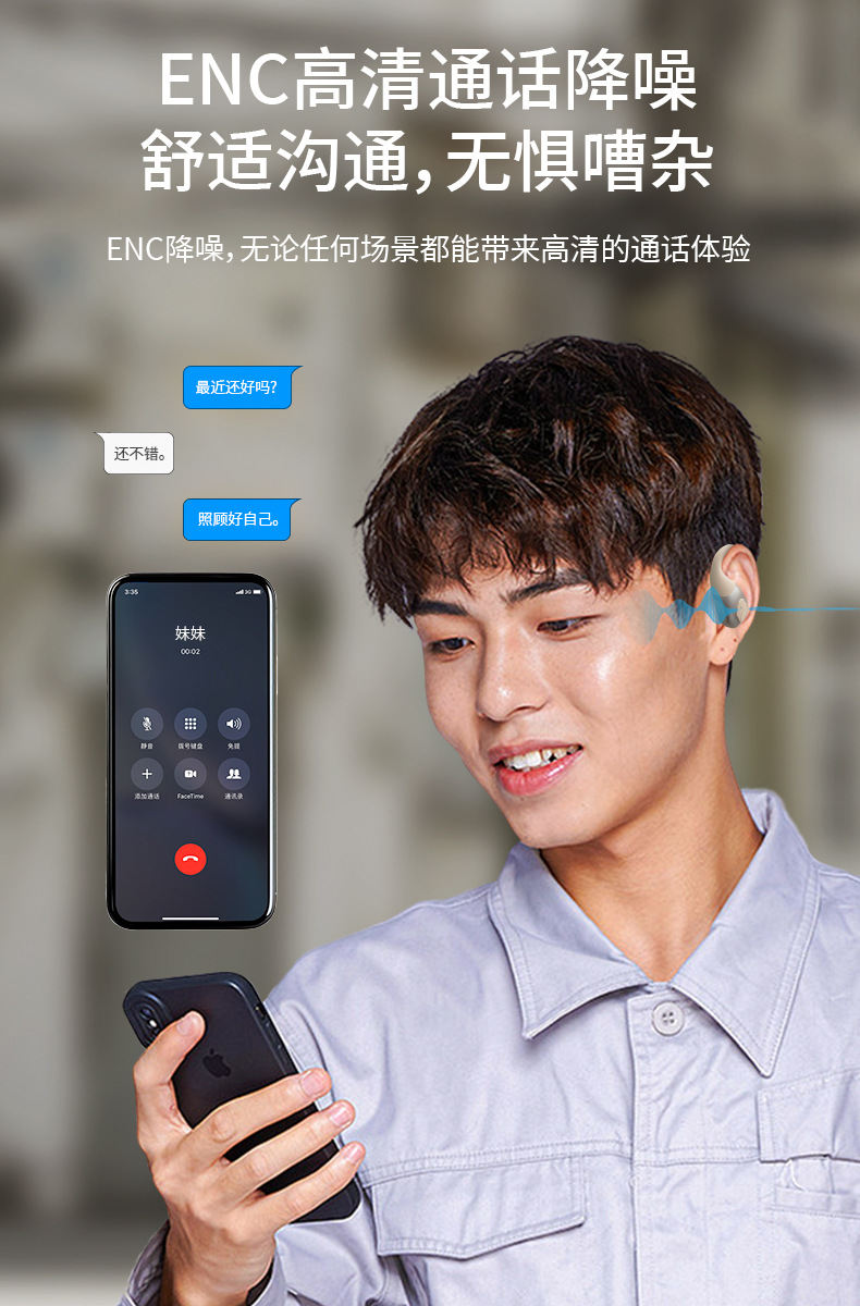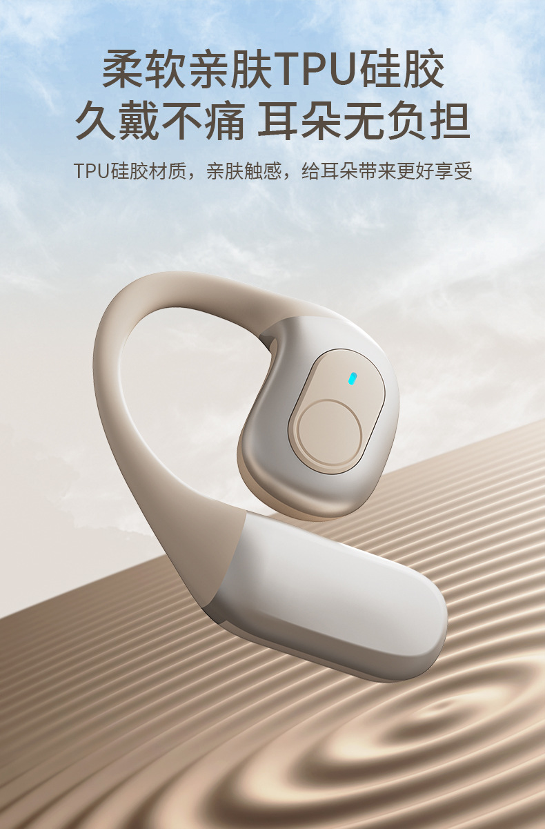 3.挂耳更稳定,佩戴的舒适感得到了提升,OWS的(音腔-耳挂-末端)均采用了三点一面,贴合耳廓的流线型设计,耳机自然下挂,仅受重力影响,无夹耳感,多点分散佩戴压力,久戴无压迫感,很舒适能够实现超长续航。蓝牙5.3技术,在20米测试距离和空间内,也能做到连接稳定。