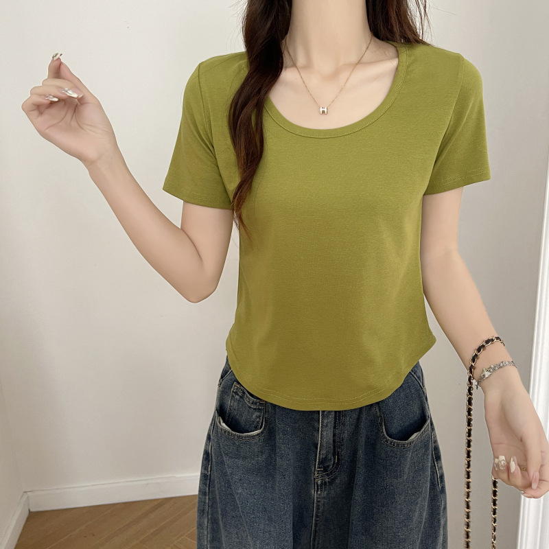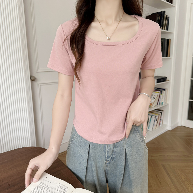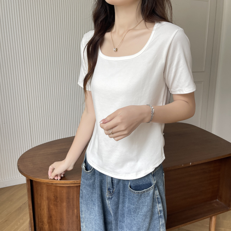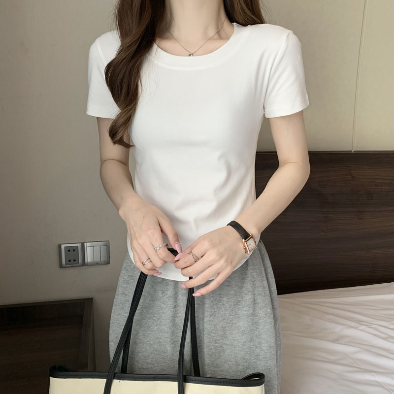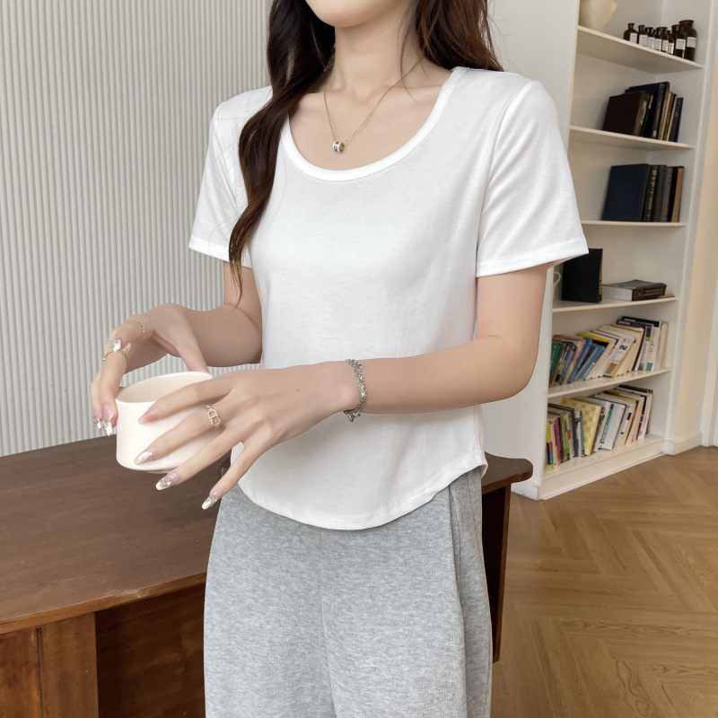 여성을위한 오른쪽 어깨 순수 코튼 반팔 티셔츠 2025 여름 새로운 스타일 느슨한 내부 다목적 슬리밍 라운드 넥 티셔츠 탑스토어 가기