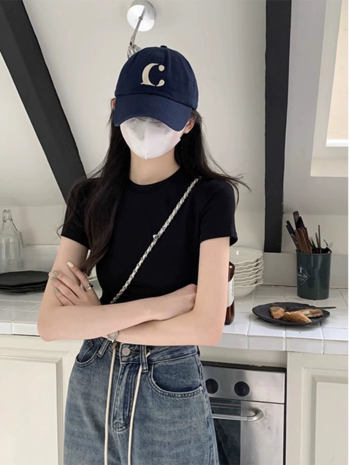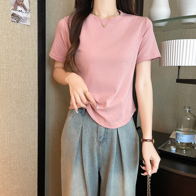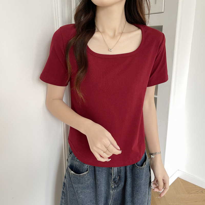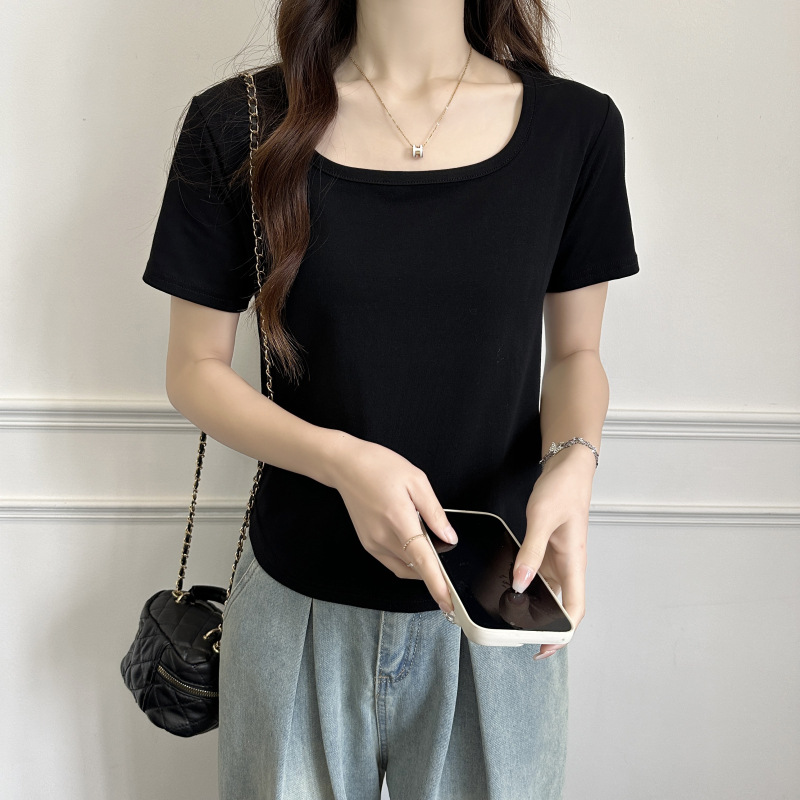 여성을위한 오른쪽 어깨 순수 코튼 반팔 티셔츠 2025 여름 새로운 스타일 느슨한 내부 다목적 슬리밍 라운드 넥 티셔츠 탑스토어 가기