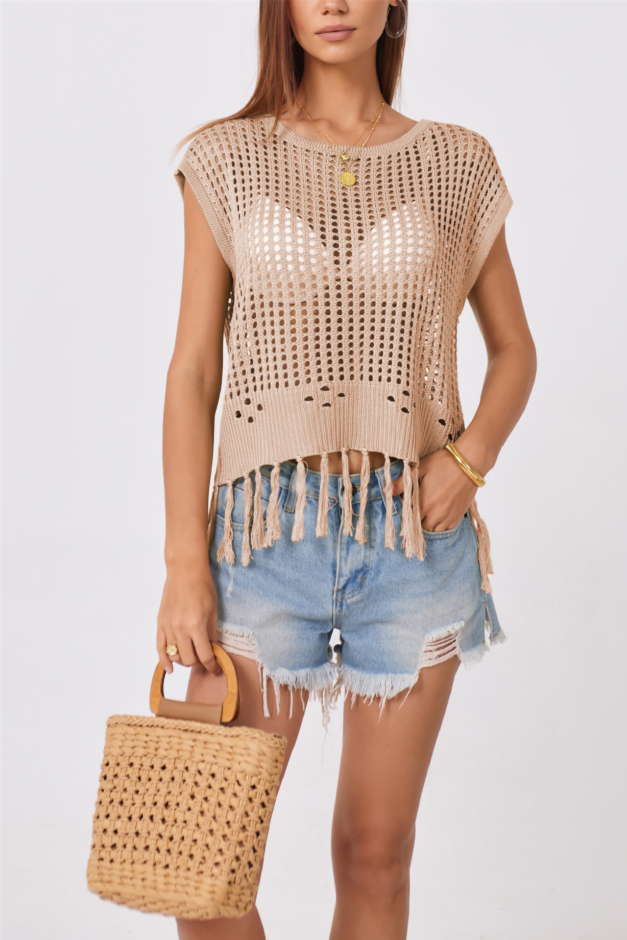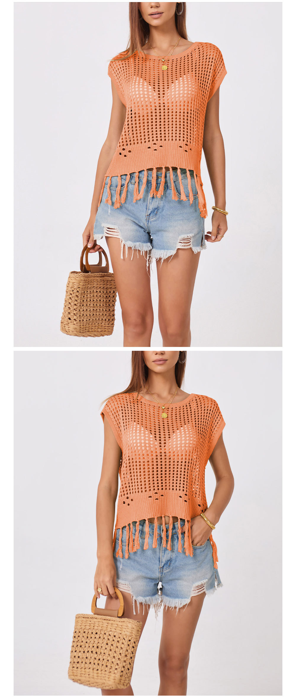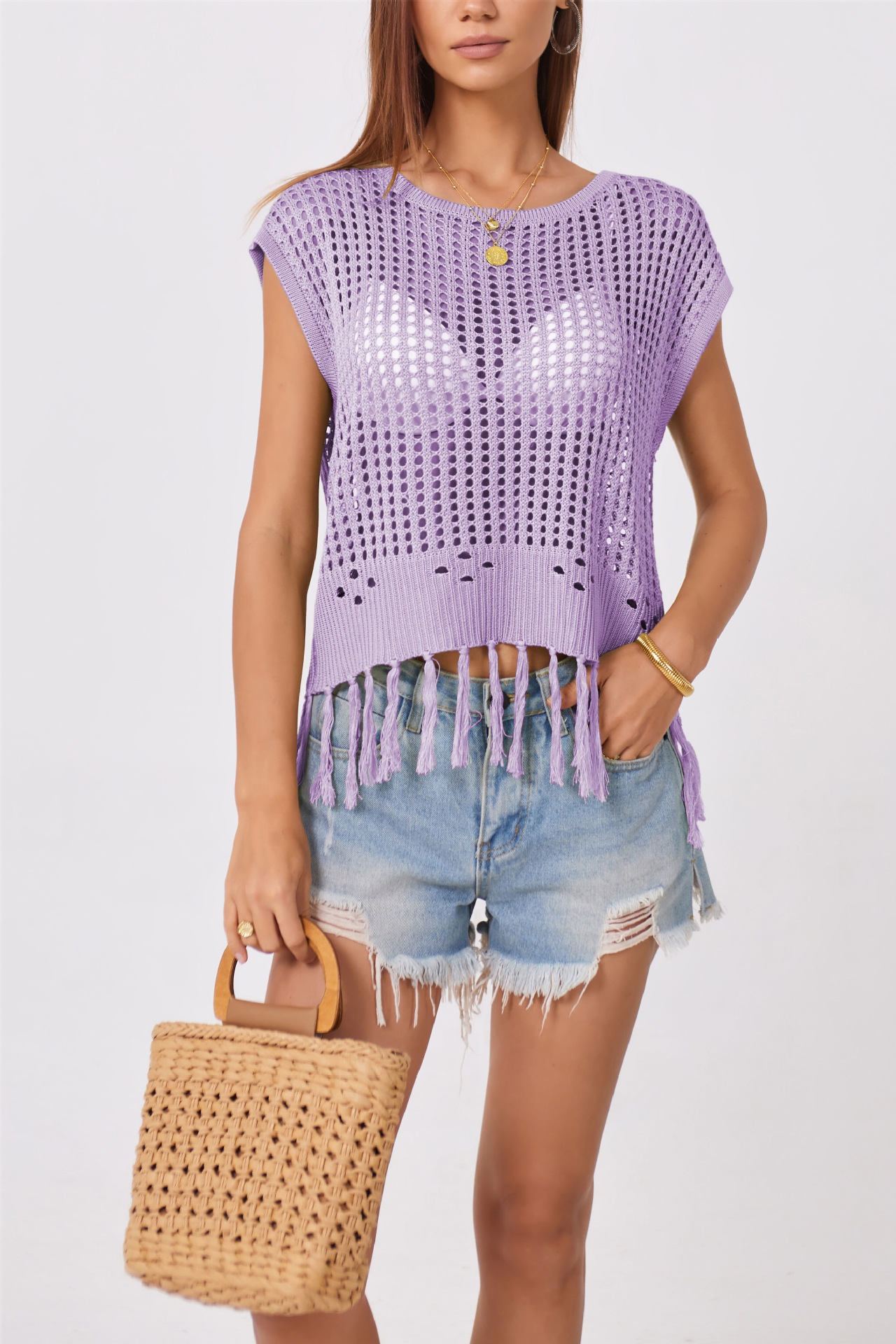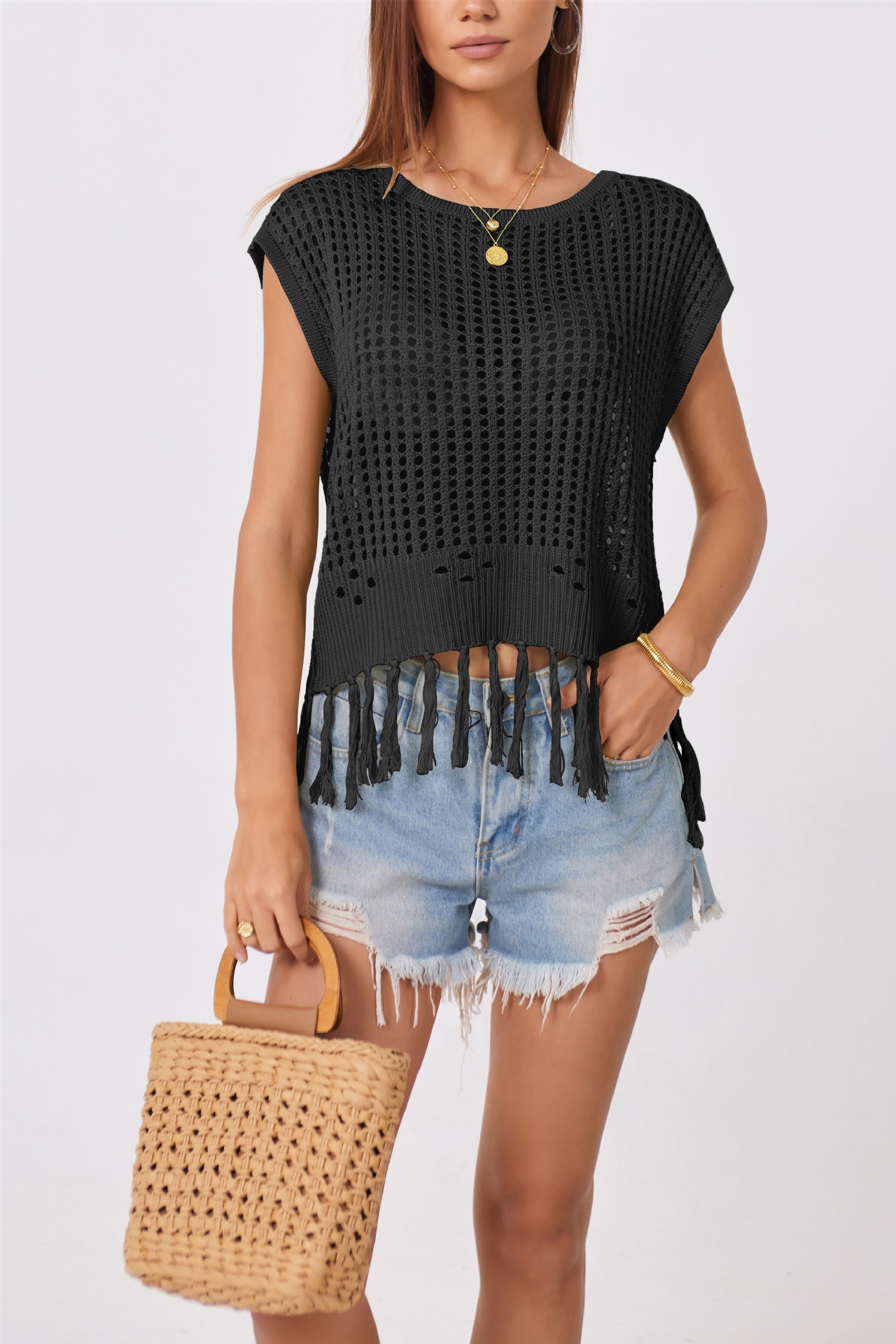 2024 국경 간 여름 아마존 새로운 유럽과 미국의 휴가 수제 술 느슨한 둥근 목 속이 빈 여성용 스웨터스토어 가기