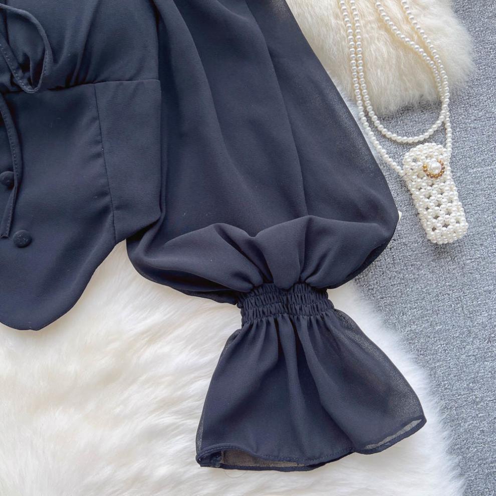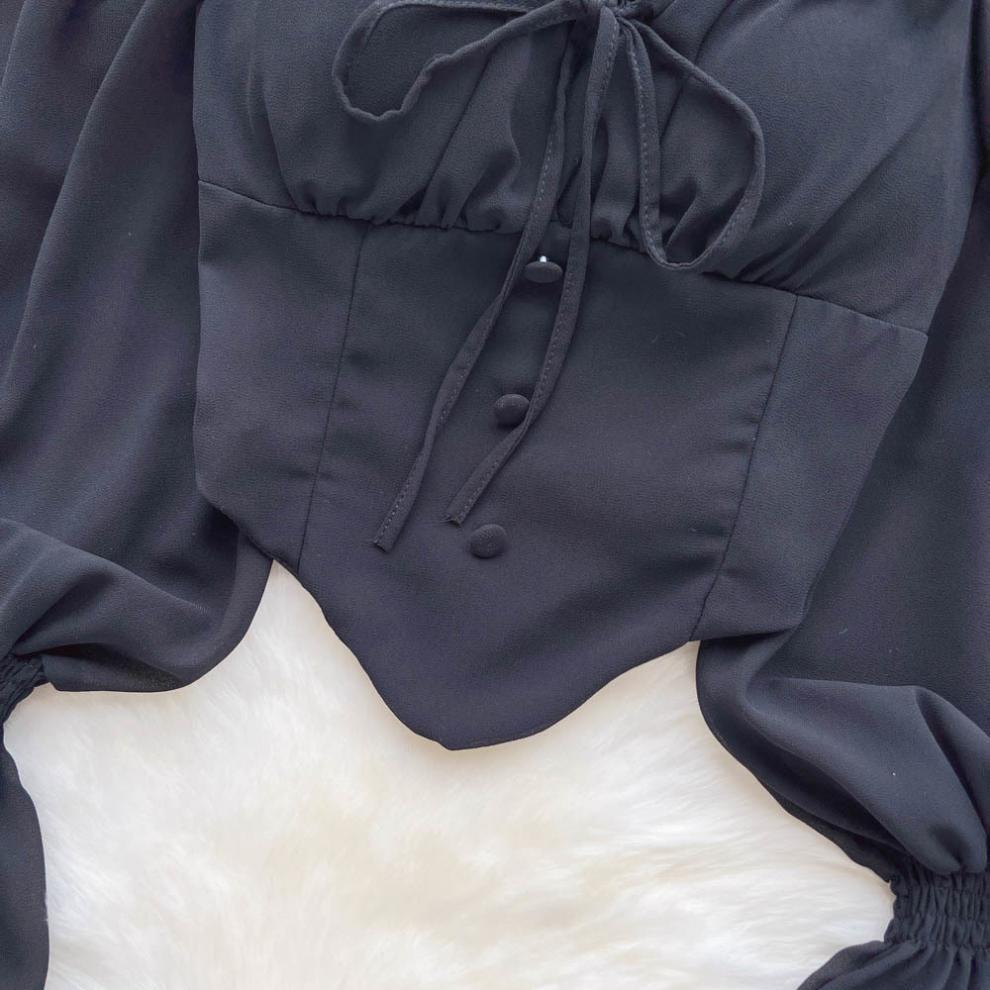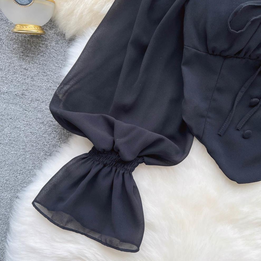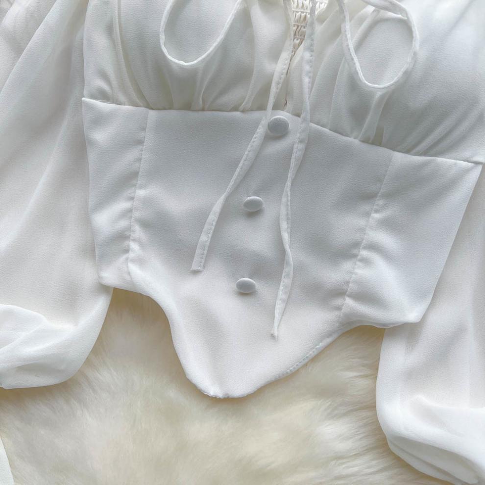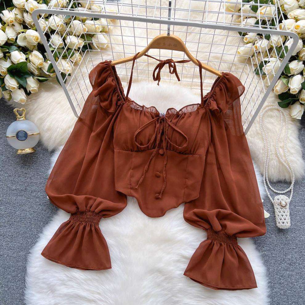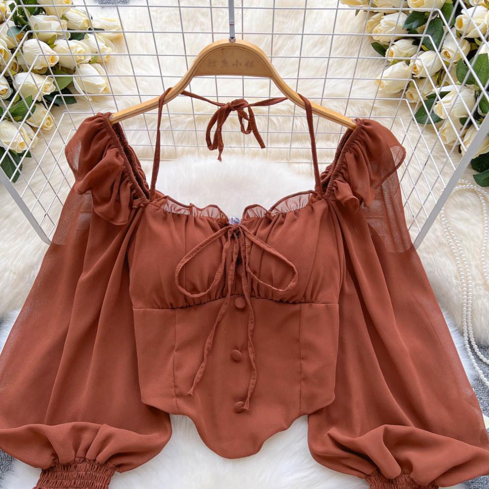 향신료 소녀 어깨 목 레이스 업 긴 소매 슬링 쉬폰 셔츠 백리스 쇼트 탑, 가슴 패드 자르기 탑