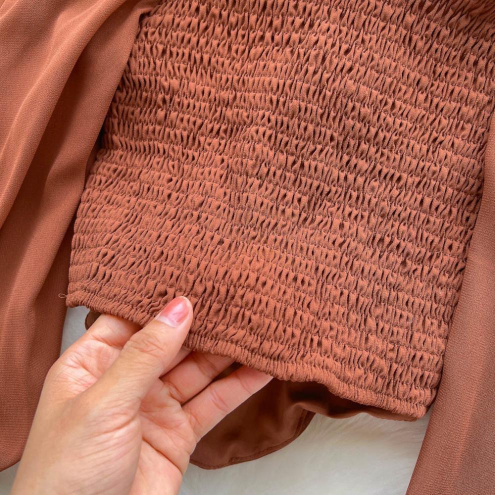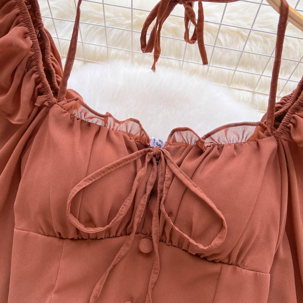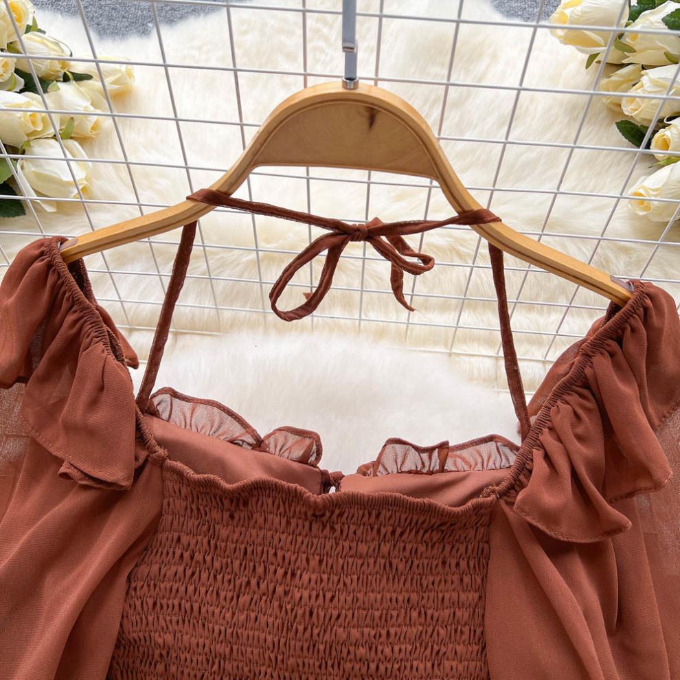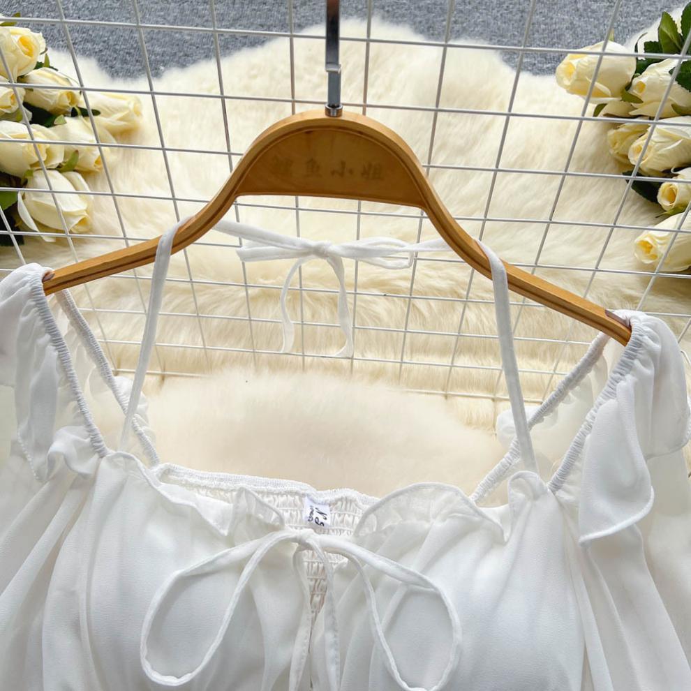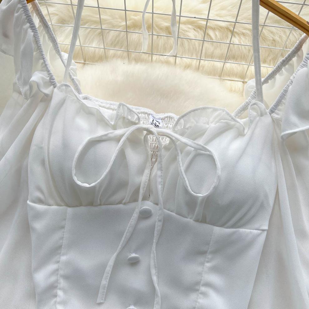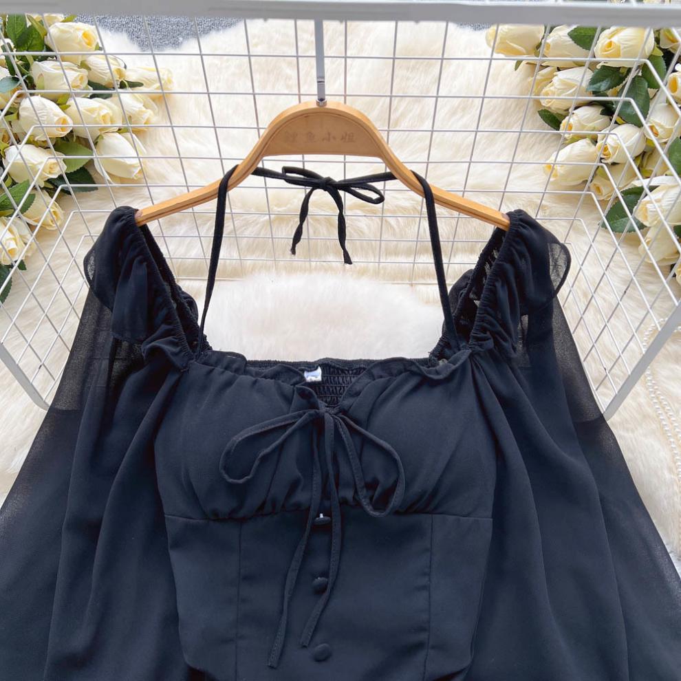 향신료 소녀 어깨 목 레이스 업 긴 소매 슬링 쉬폰 셔츠 백리스 쇼트 탑, 가슴 패드 자르기 탑