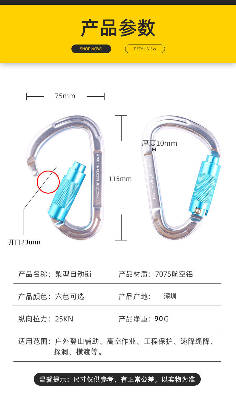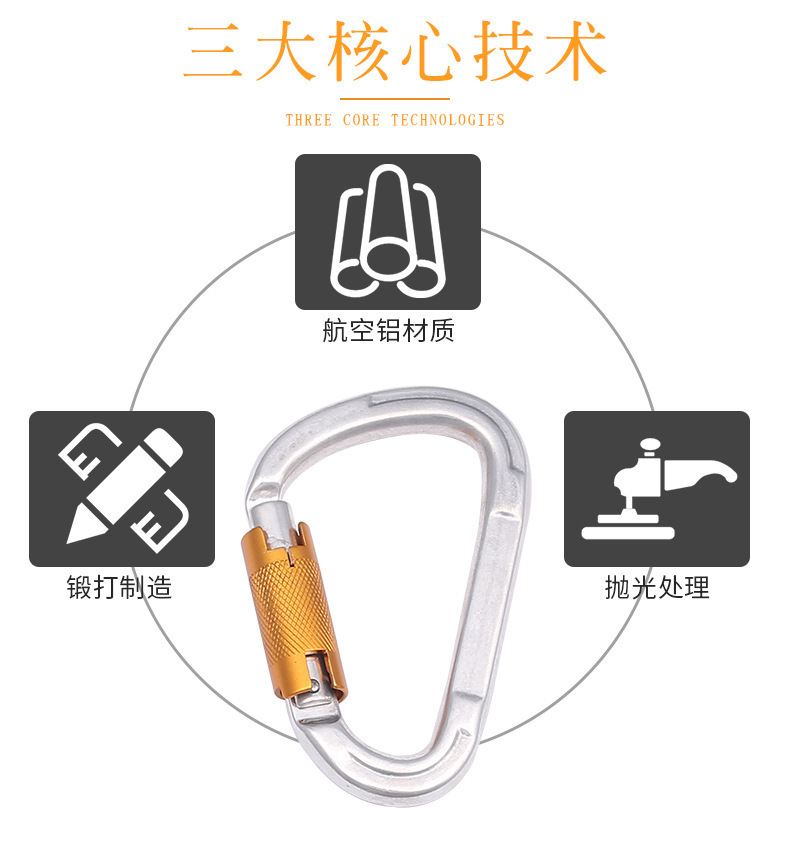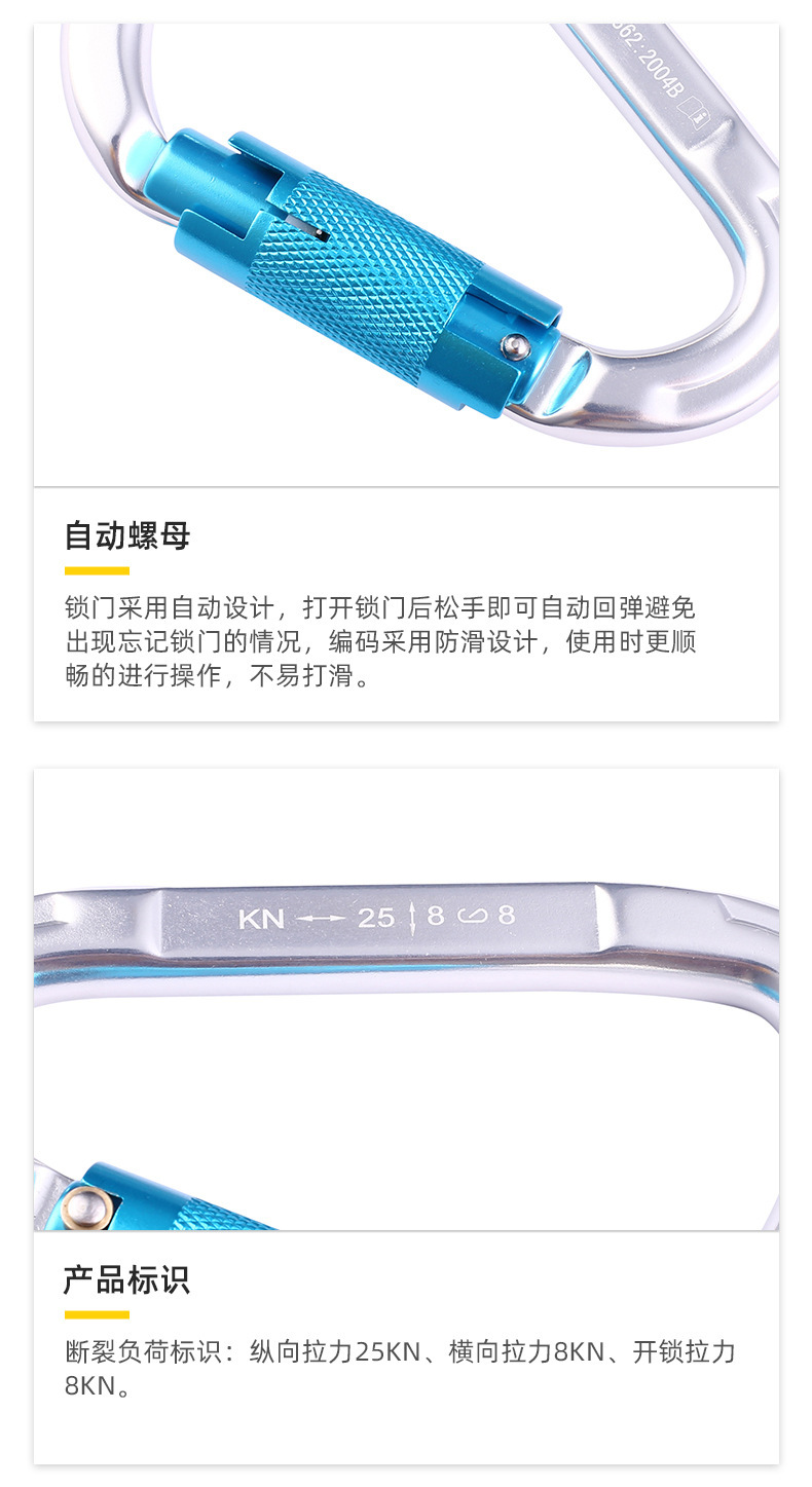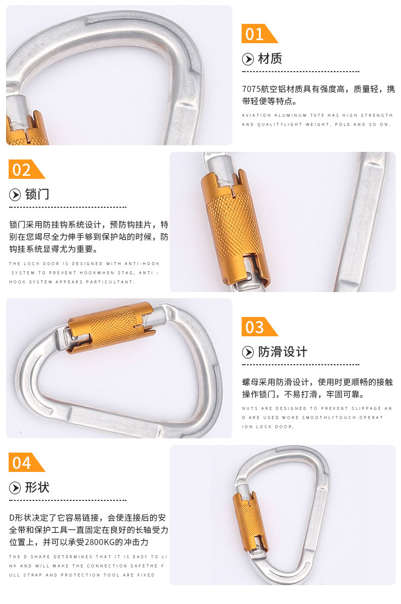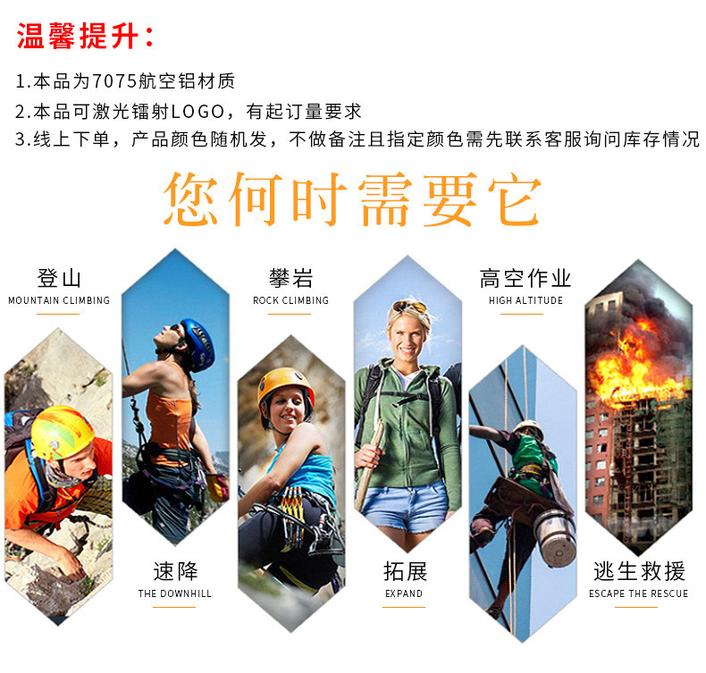 特点:重量轻、拉力强、开口大适用范围:瑜伽吊床、攀岩、横渡、高空垂降、SRT作业