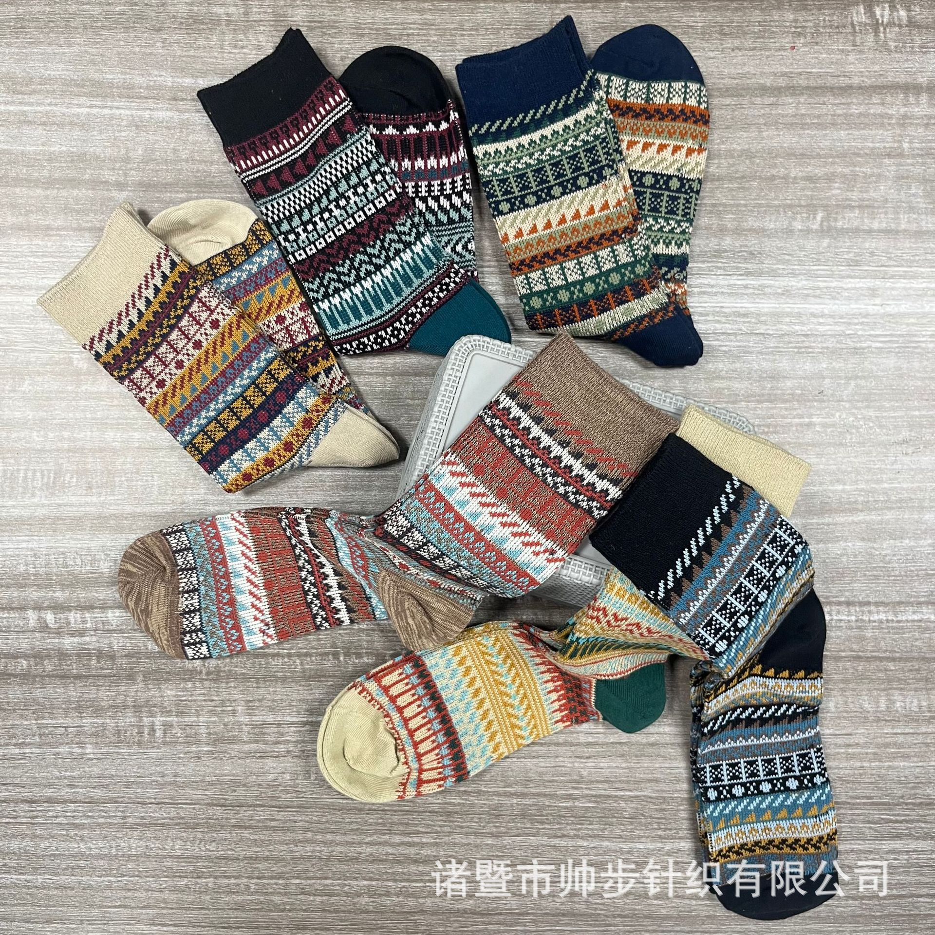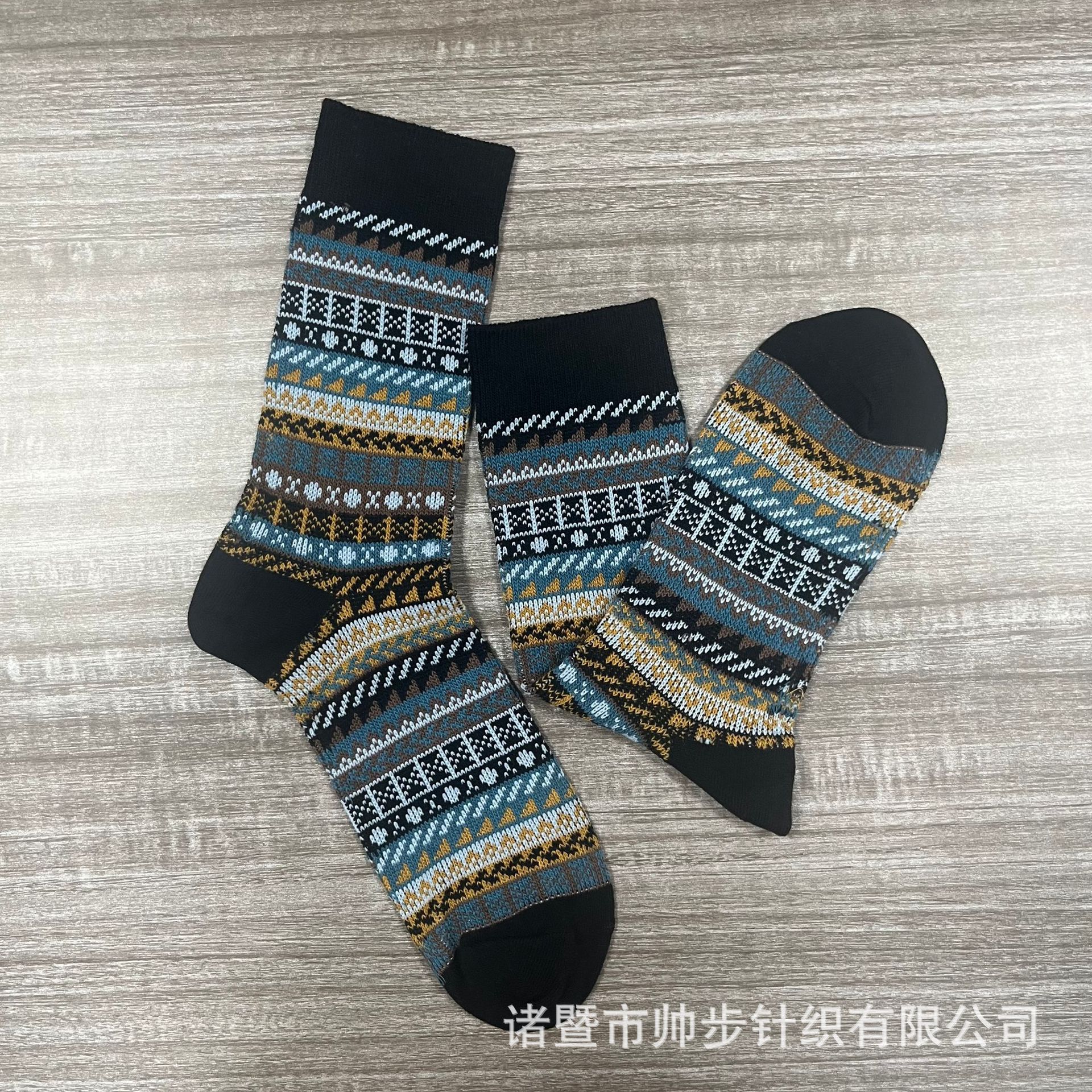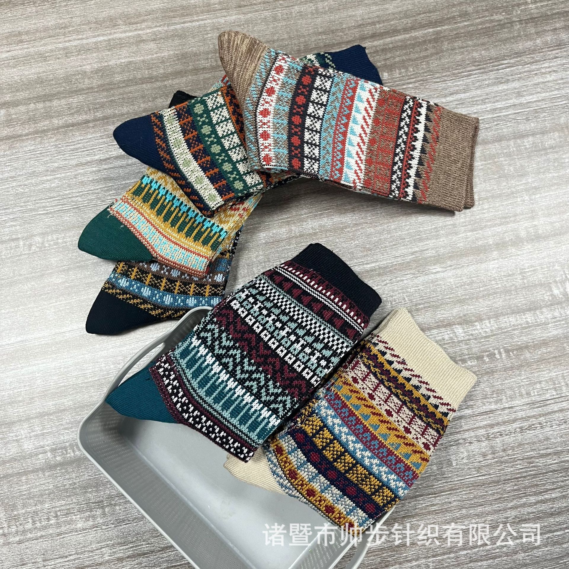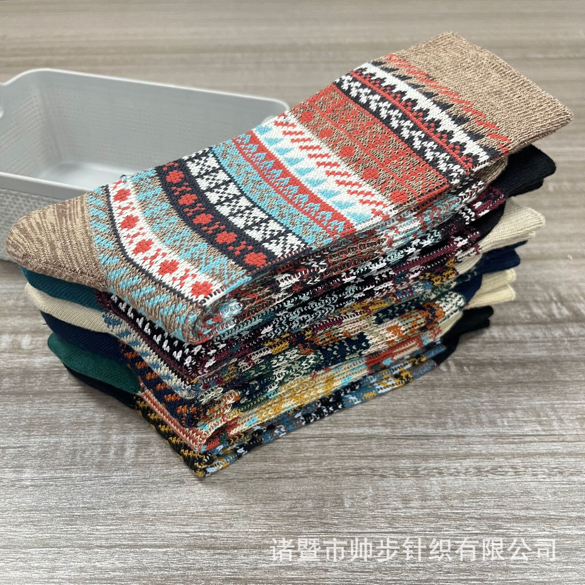 2024 새로운 양말 남성 가을 및 겨울 중반 종아리 양말 양말 더블 바늘 양방향 복고풍 민족 스타일 지원 도매 가공