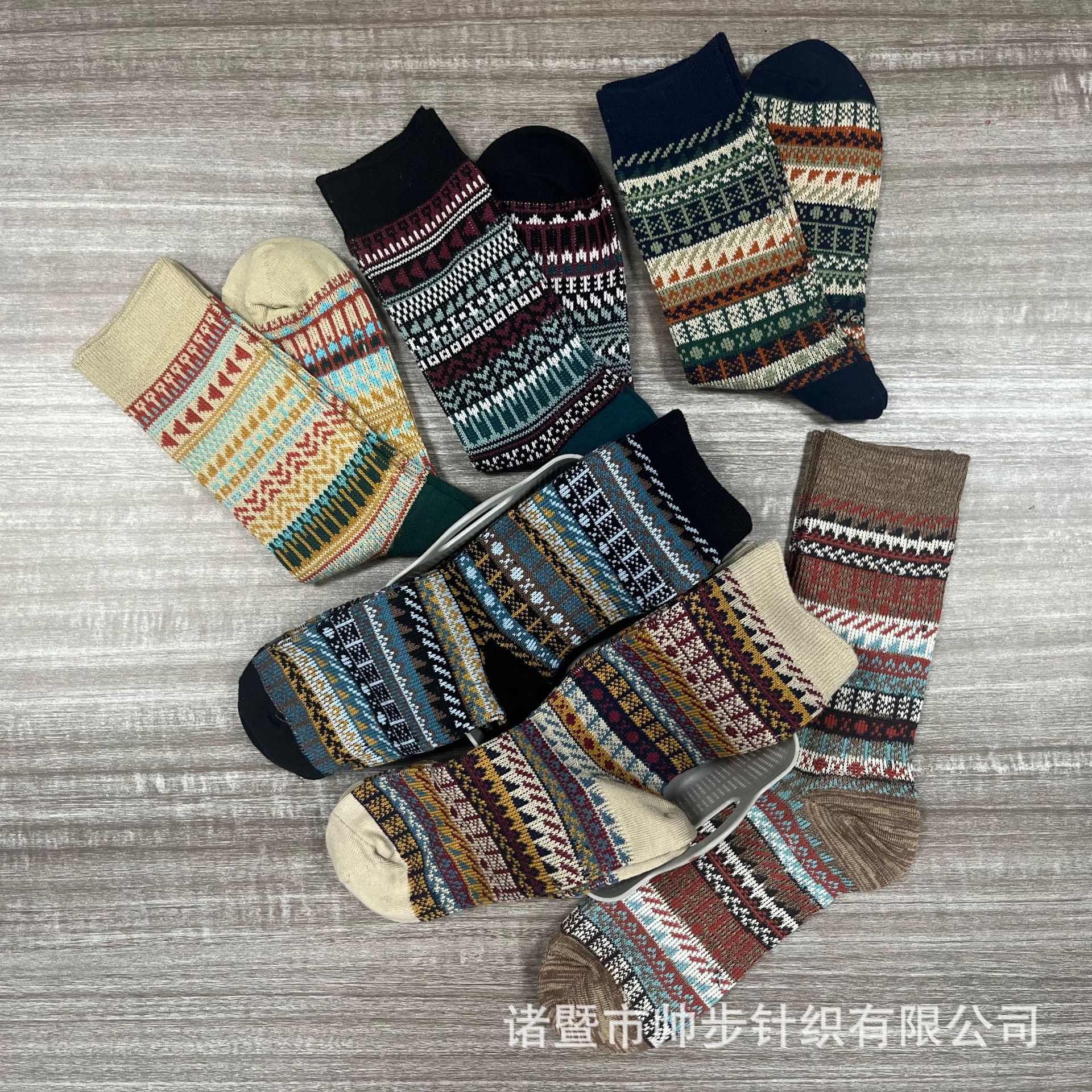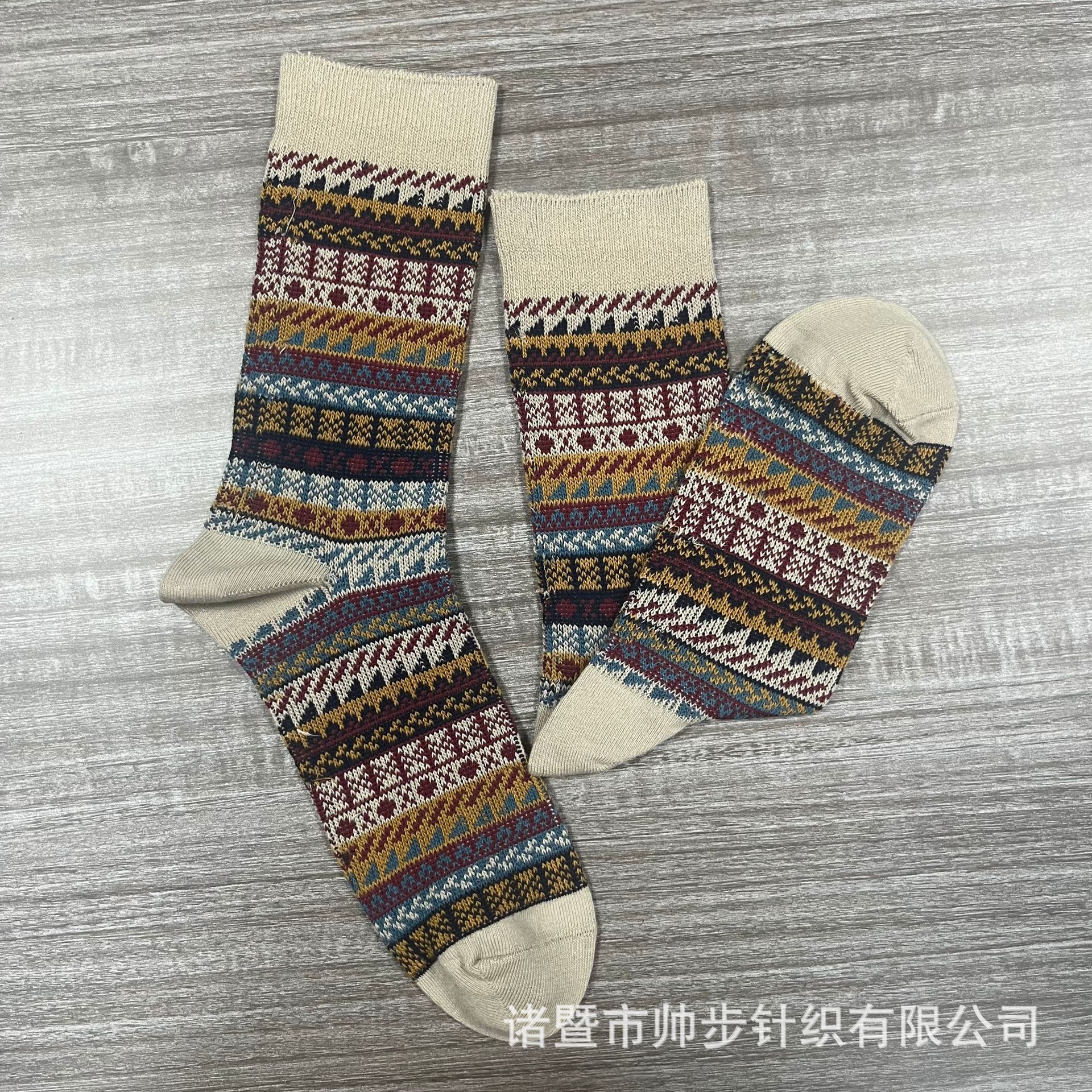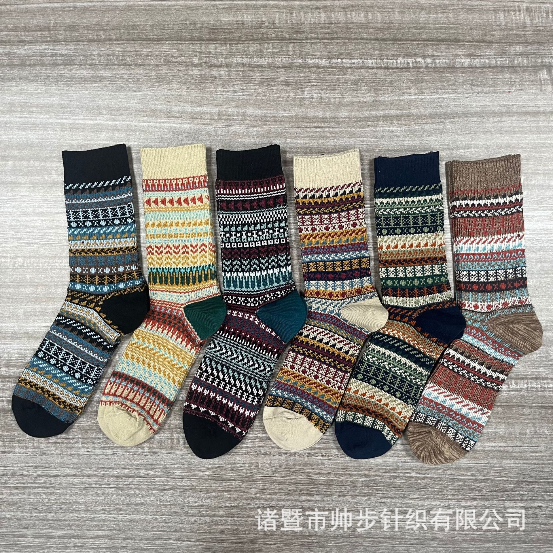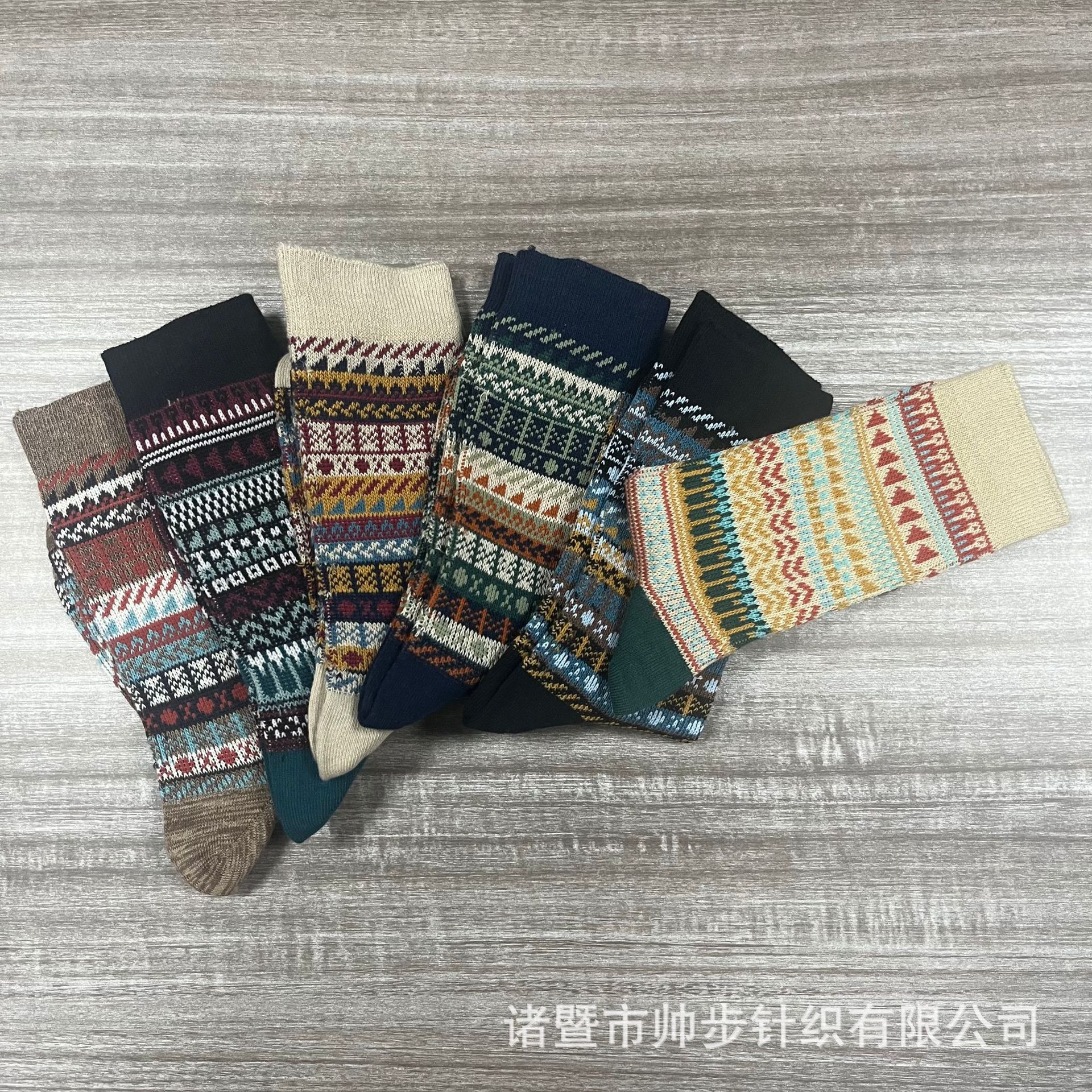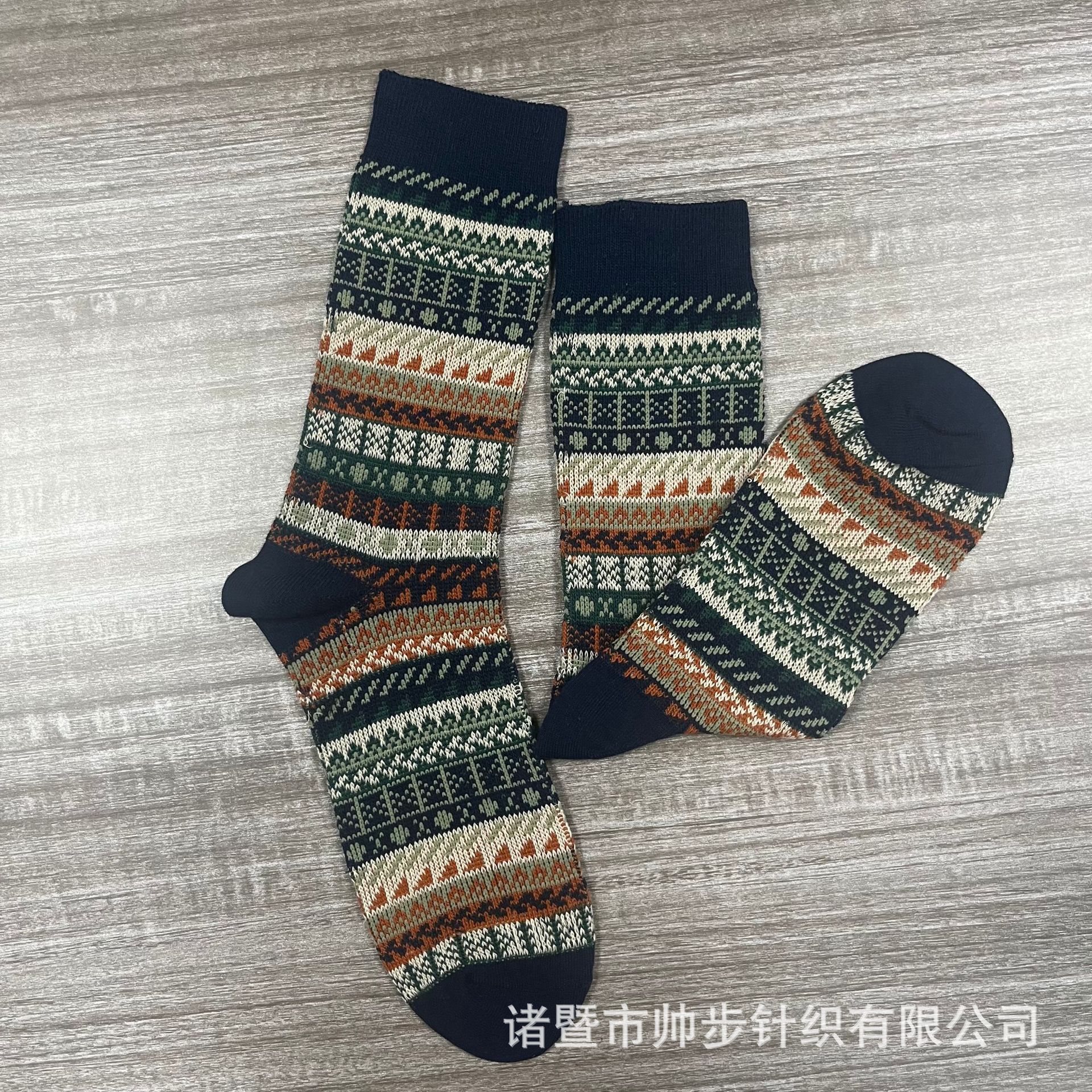 2024 새로운 양말 남성 가을 및 겨울 중반 종아리 양말 양말 더블 바늘 양방향 복고풍 민족 스타일 지원 도매 가공