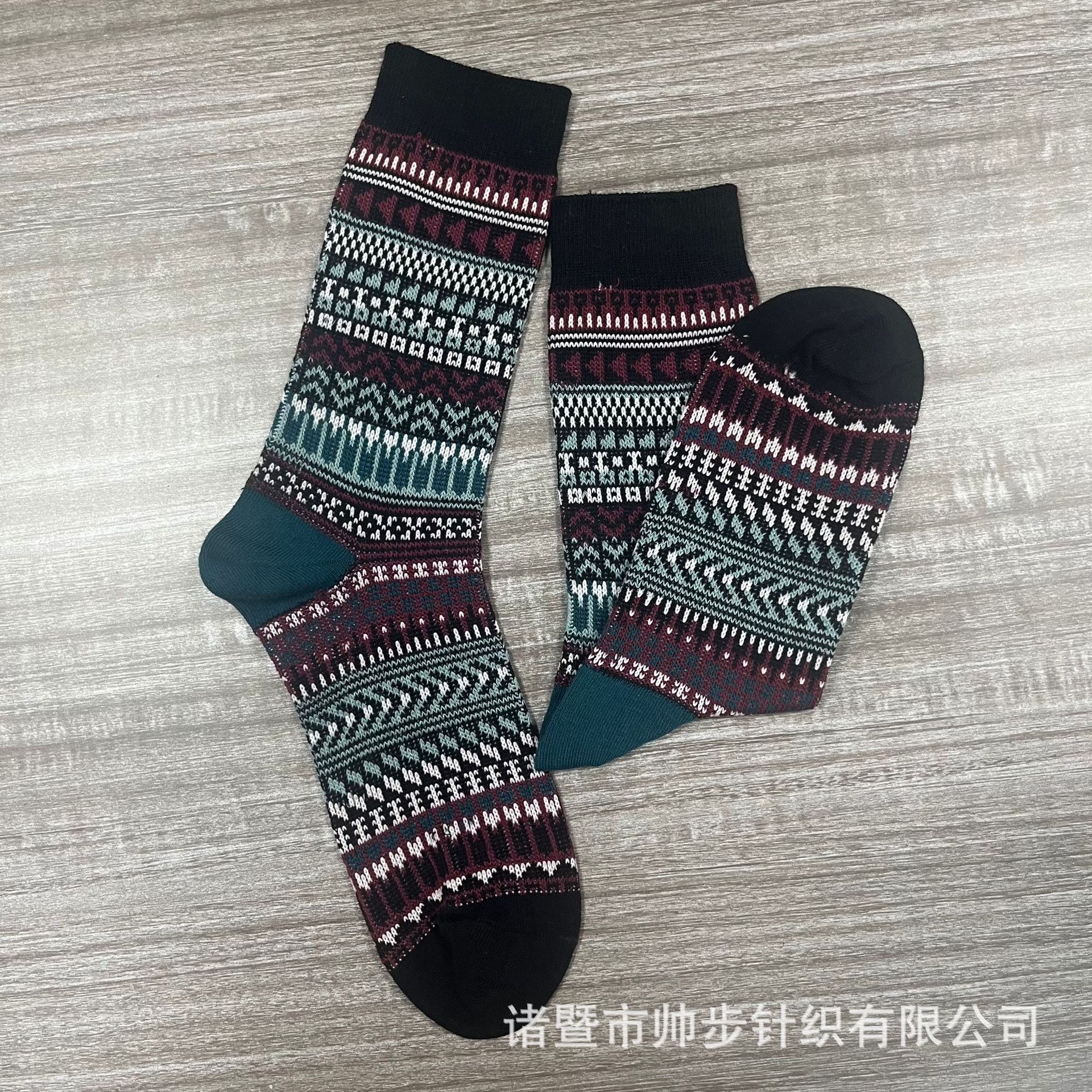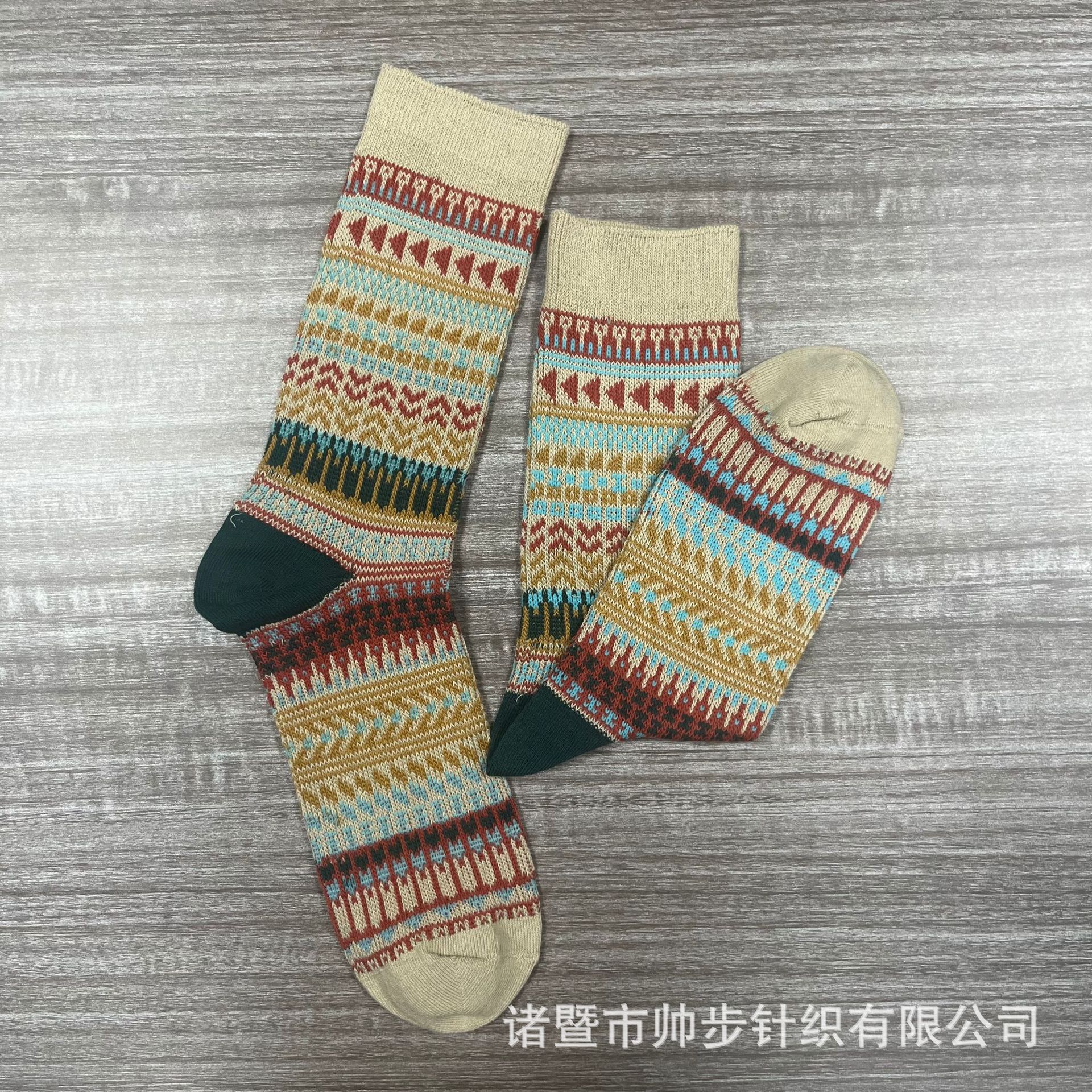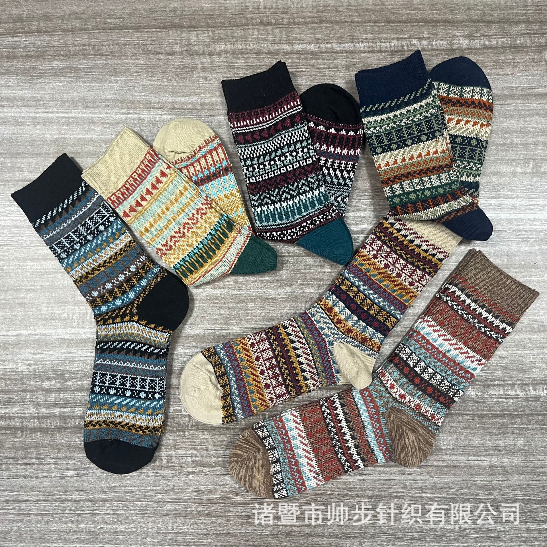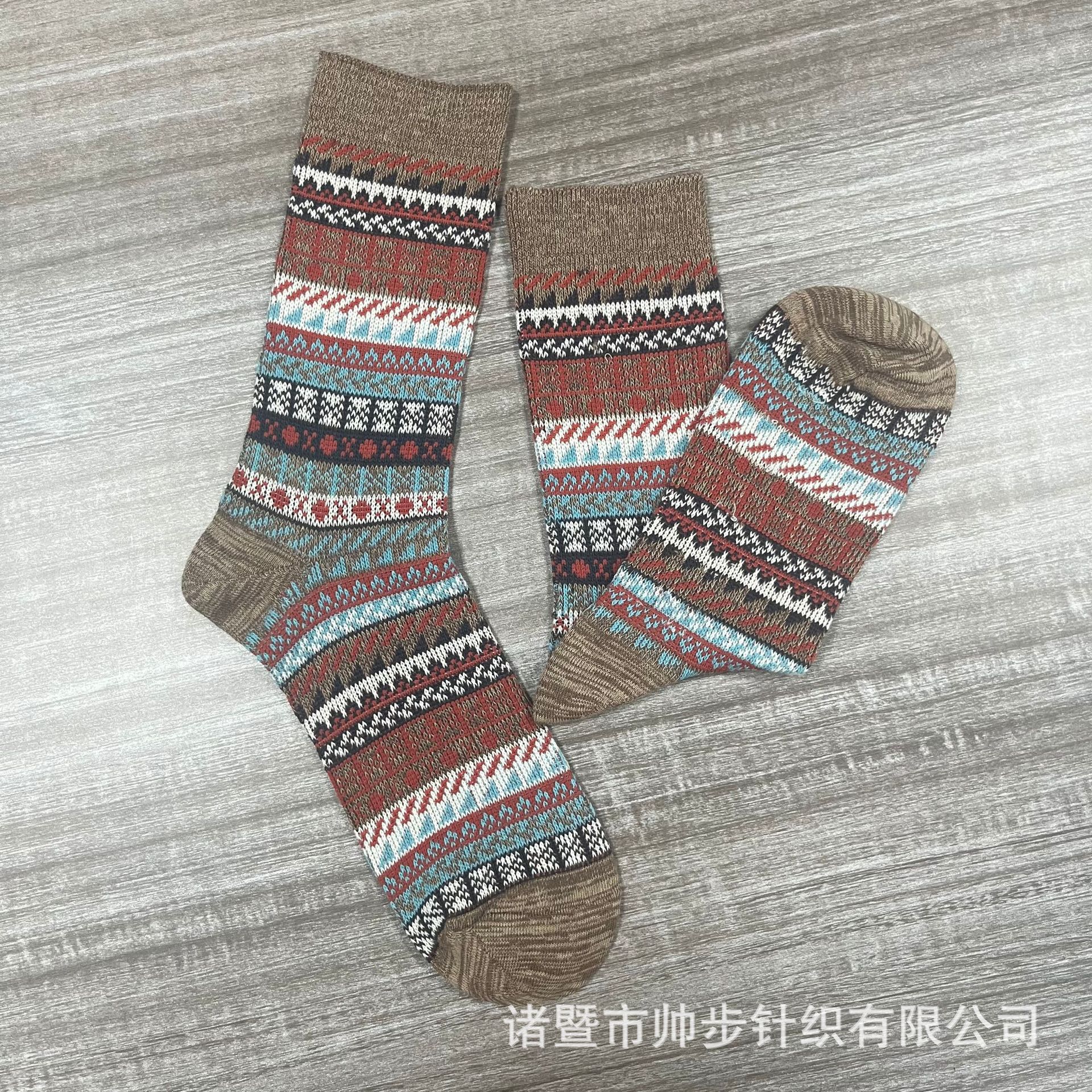 2024 새로운 양말 남성 가을 및 겨울 중반 종아리 양말 양말 더블 바늘 양방향 복고풍 민족 스타일 지원 도매 가공
