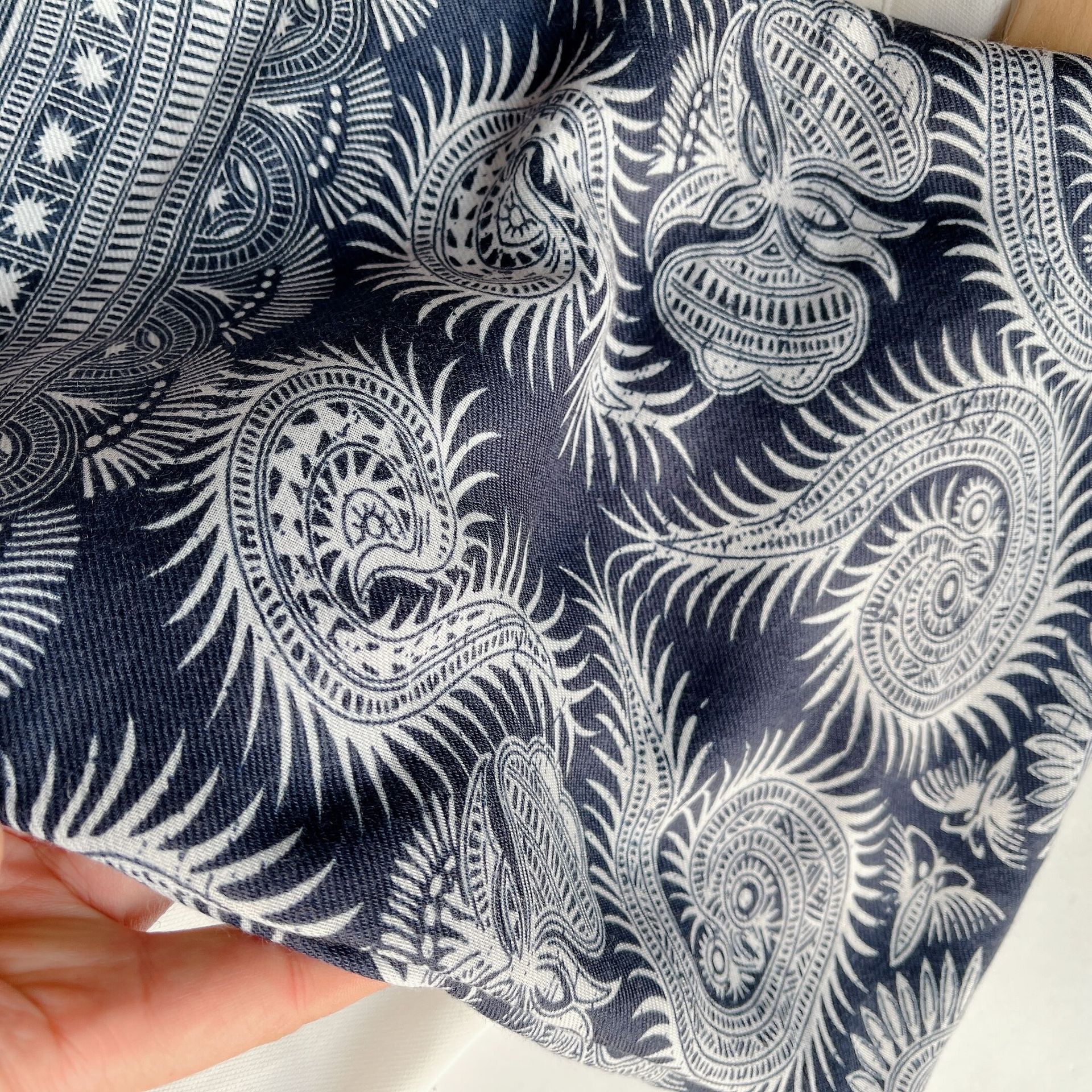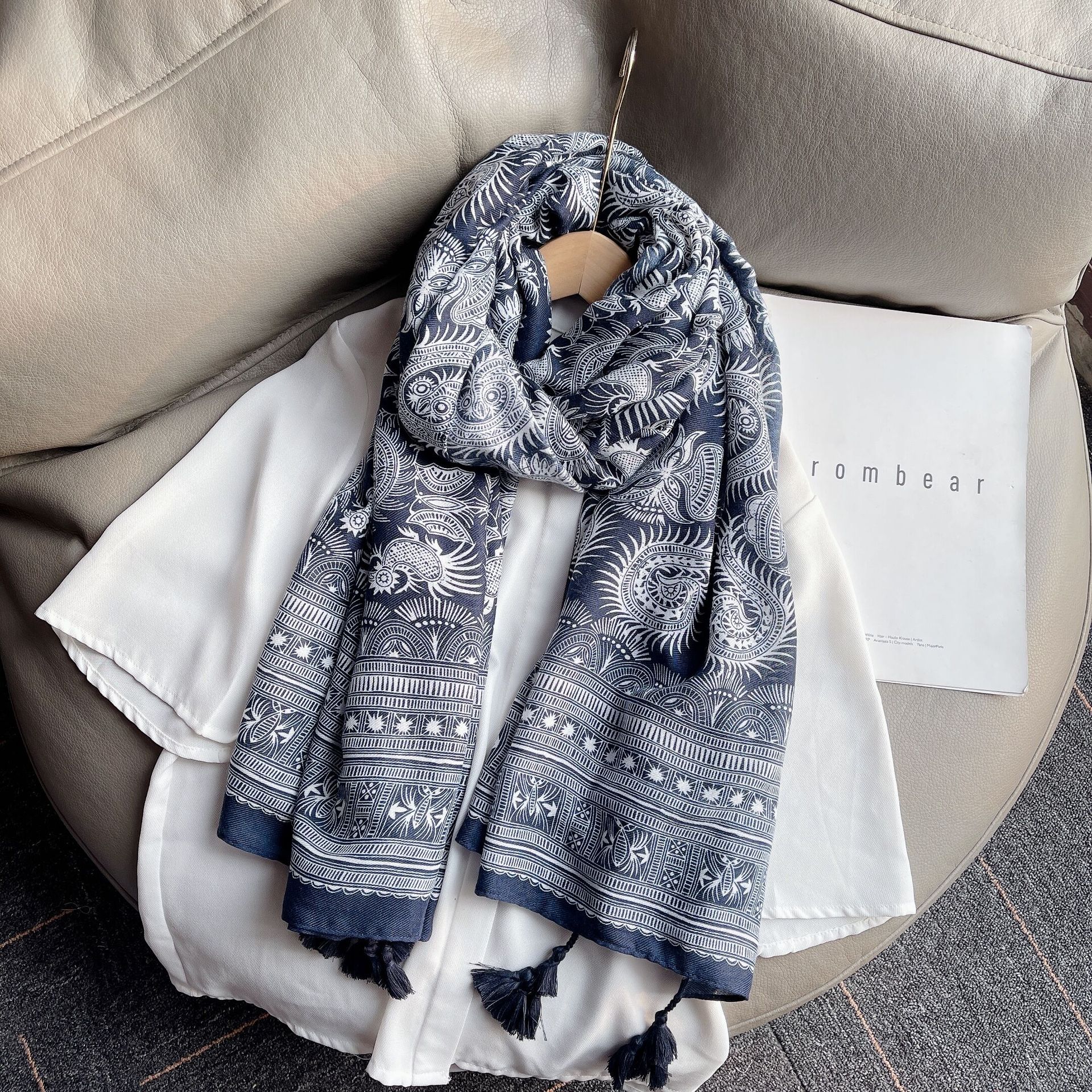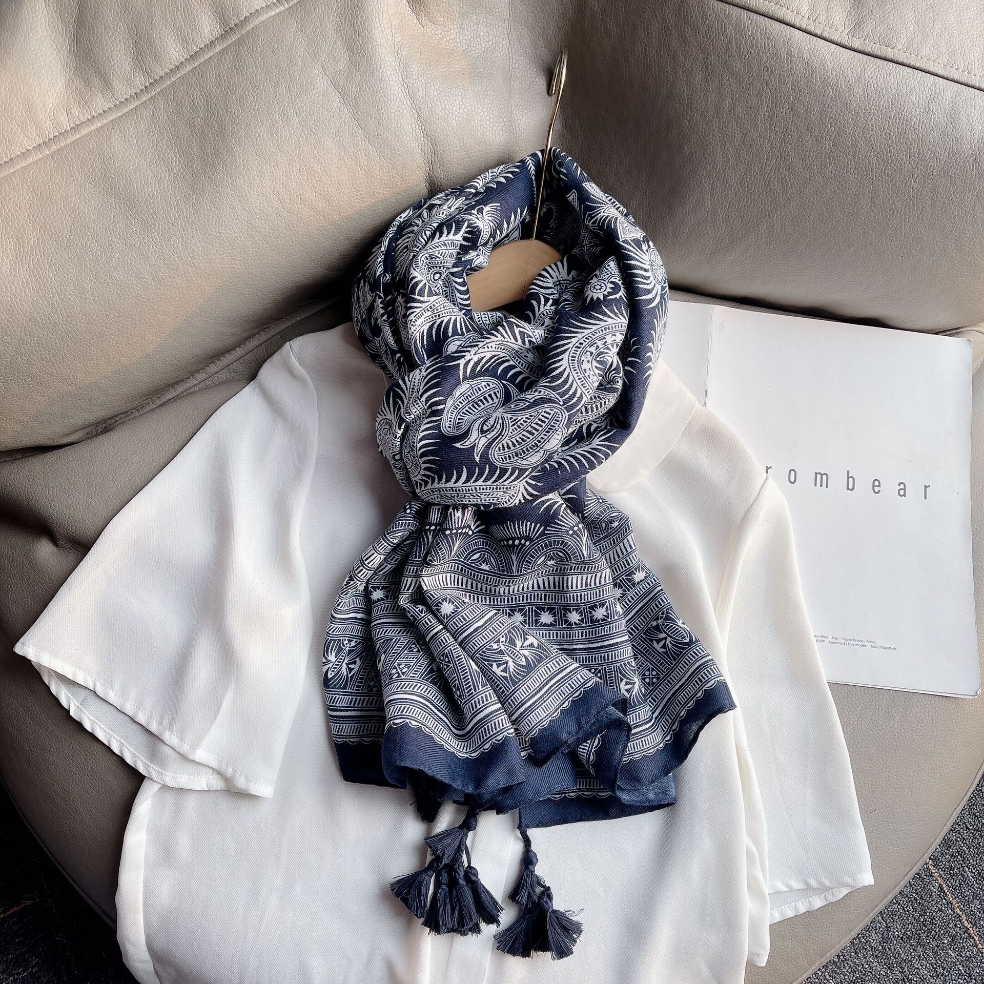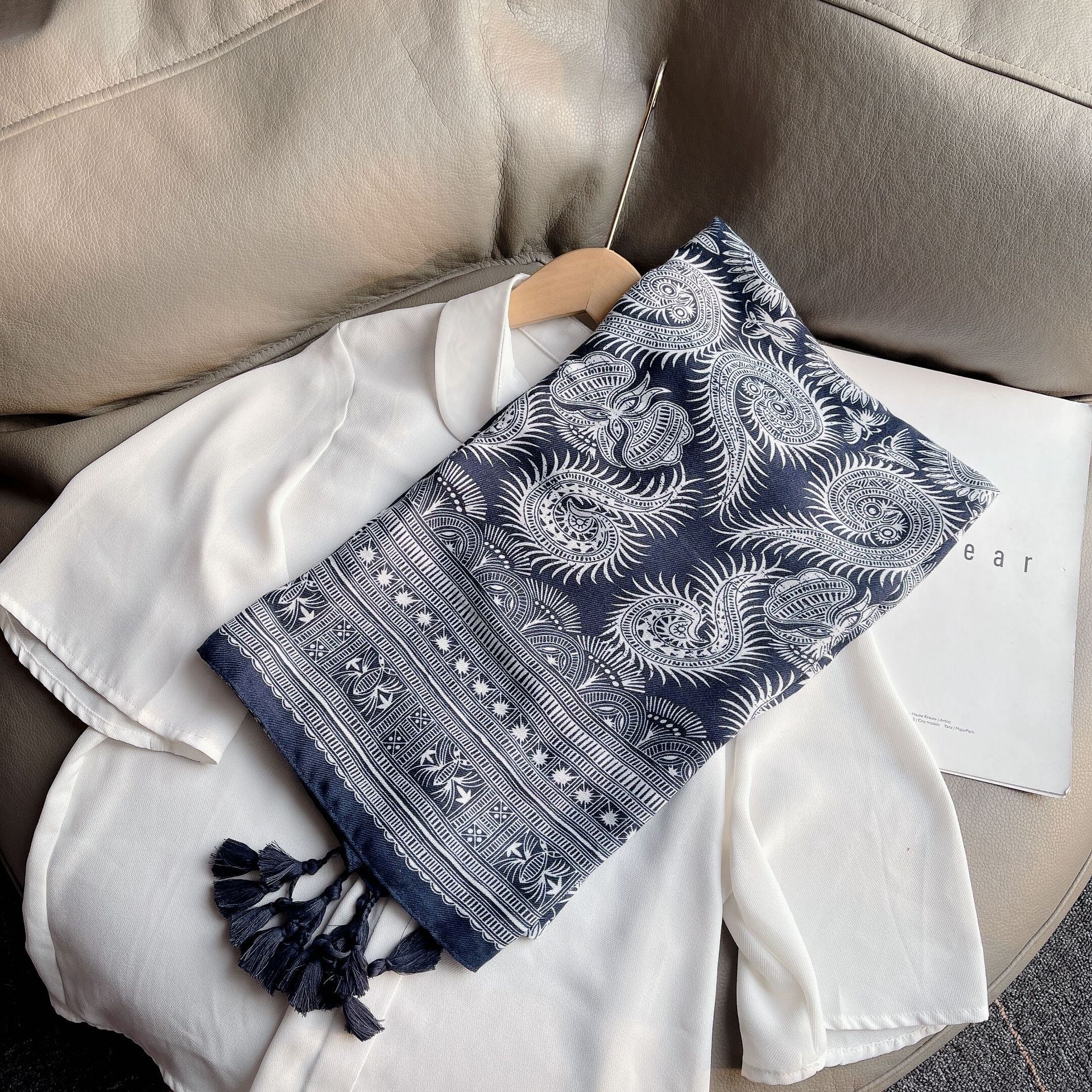구이저우 모조 식초 염료 인쇄 캐슈 꽃 술면 및 리넨 민족 스타일 스카프 관광 해변 해변 여성을위한 대외 무역 스카프스토어 가기