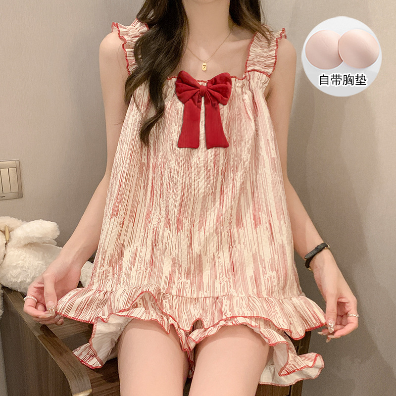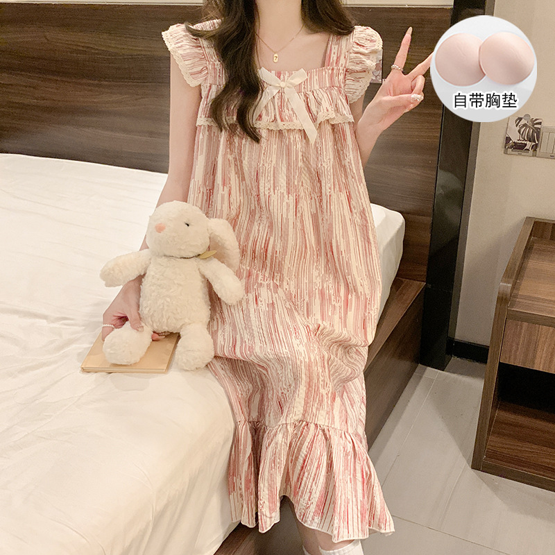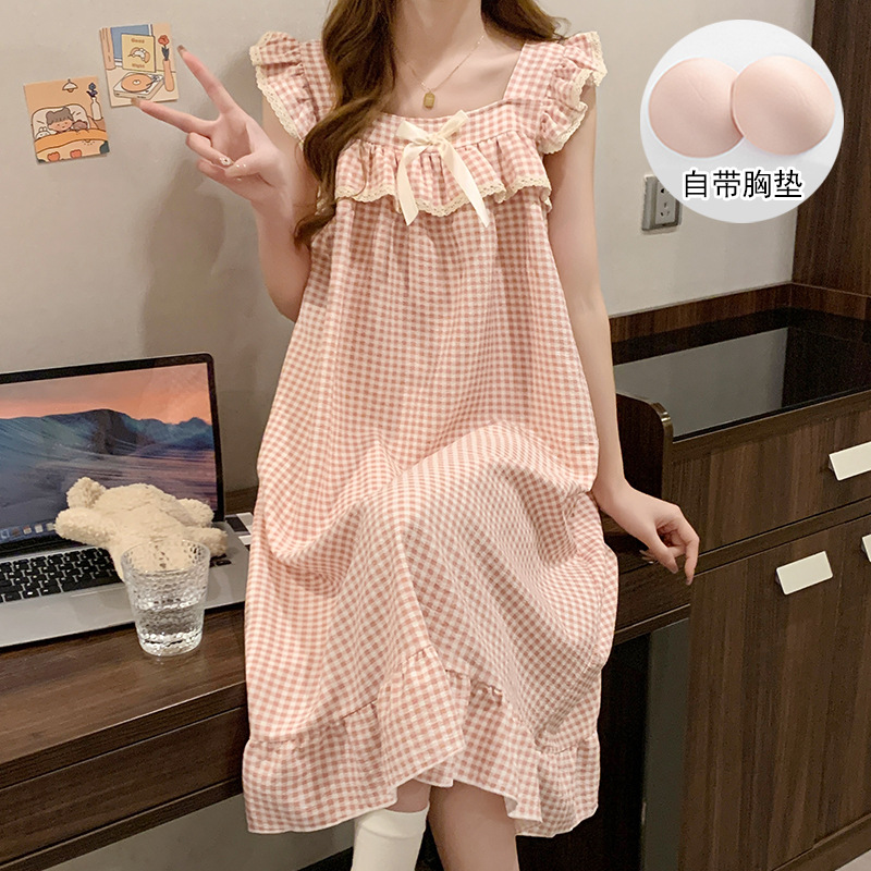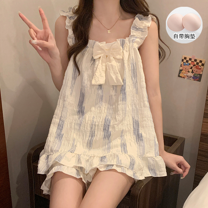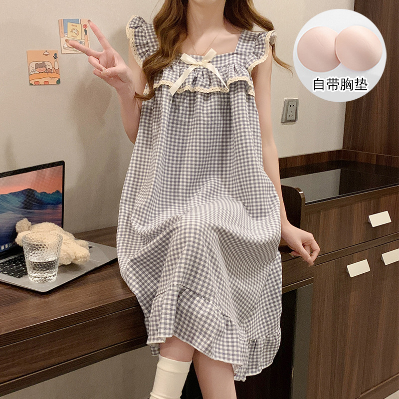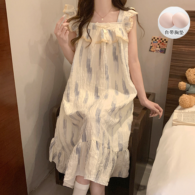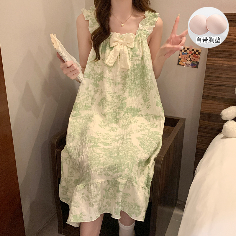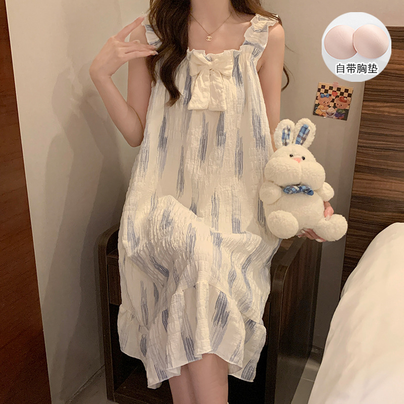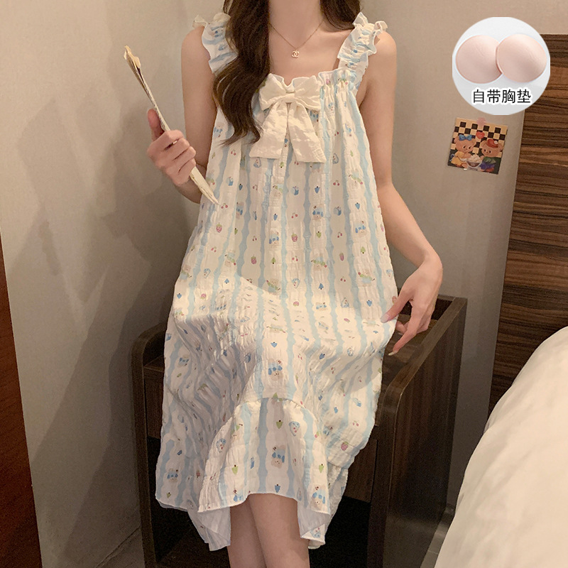 여자 여름 달콤하고 귀여운 슬링 가슴 패드 조끼 Nightdress 학생 얇은 바깥 옷을 입은 중간 길이의 원피스