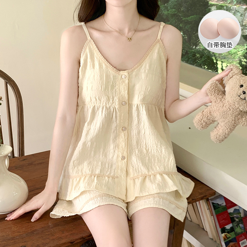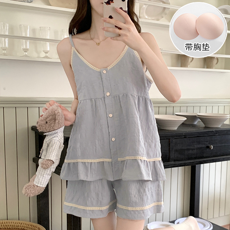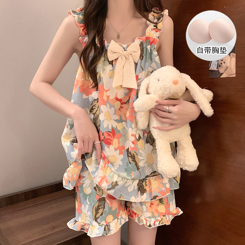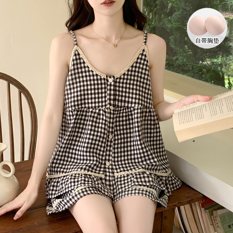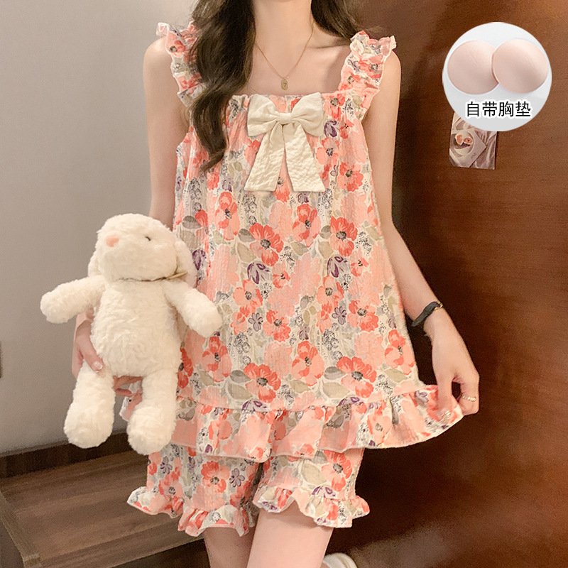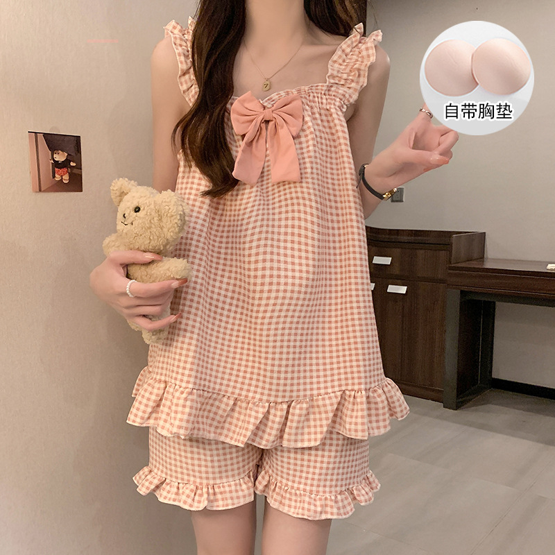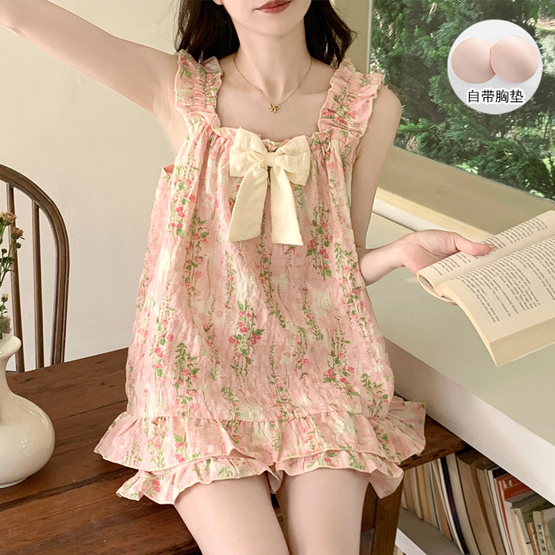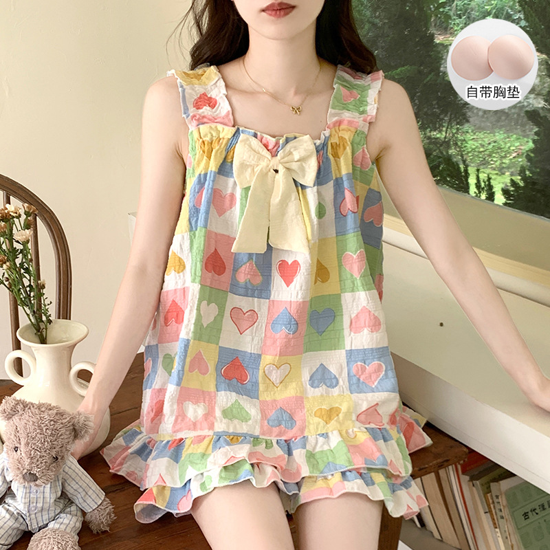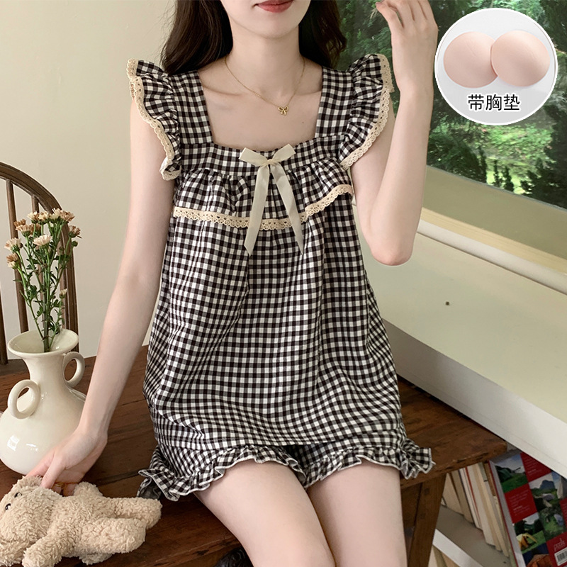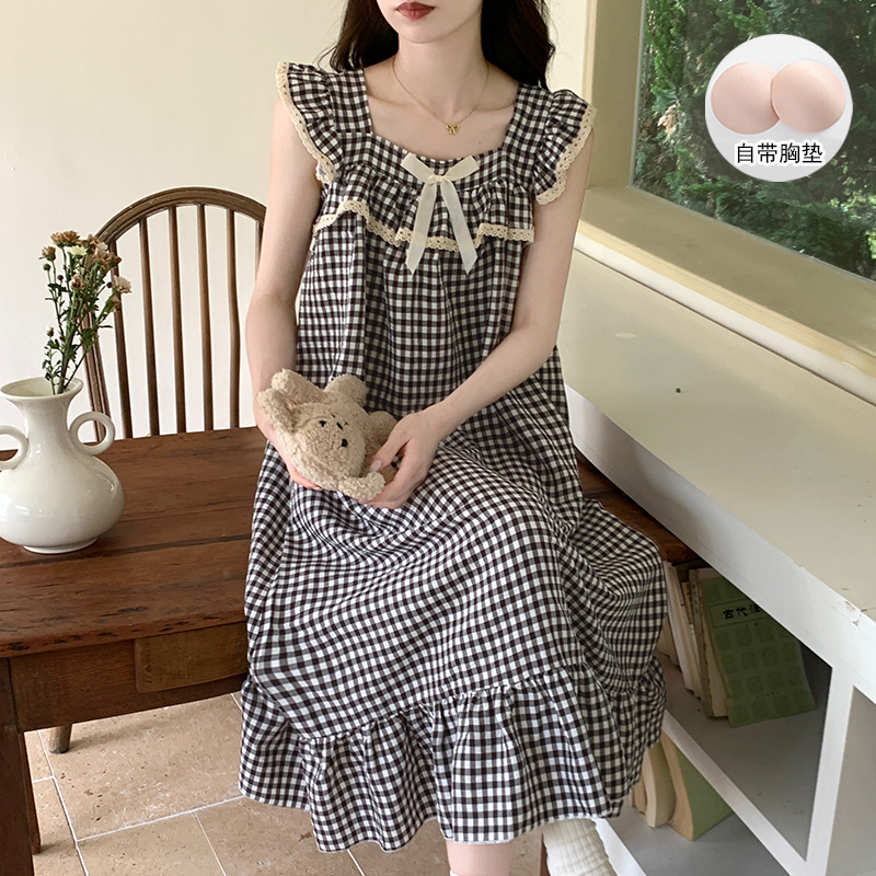 여자 여름 달콤하고 귀여운 슬링 가슴 패드 조끼 Nightdress 학생 얇은 바깥 옷을 입은 중간 길이의 원피스