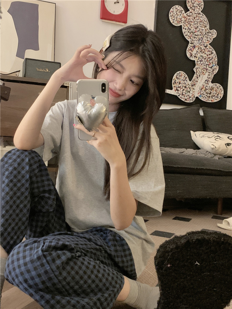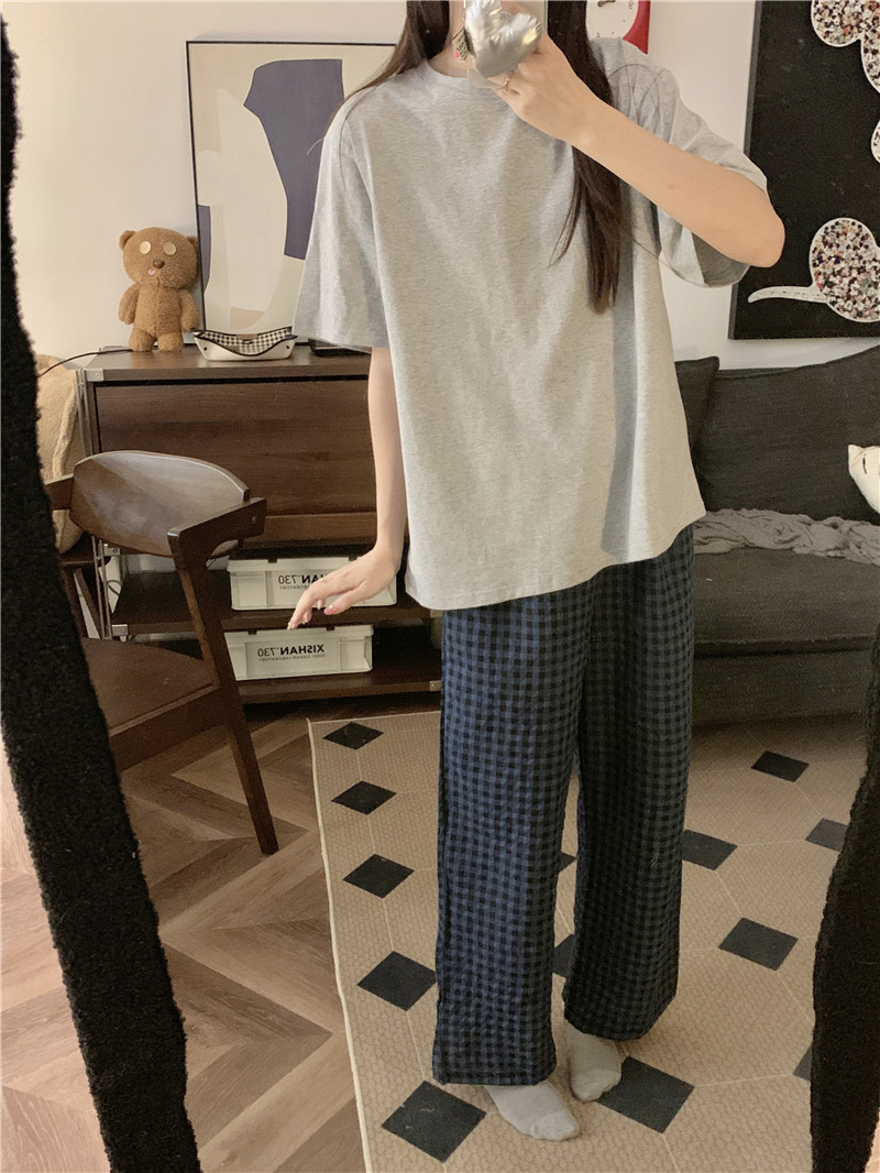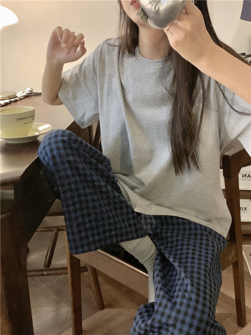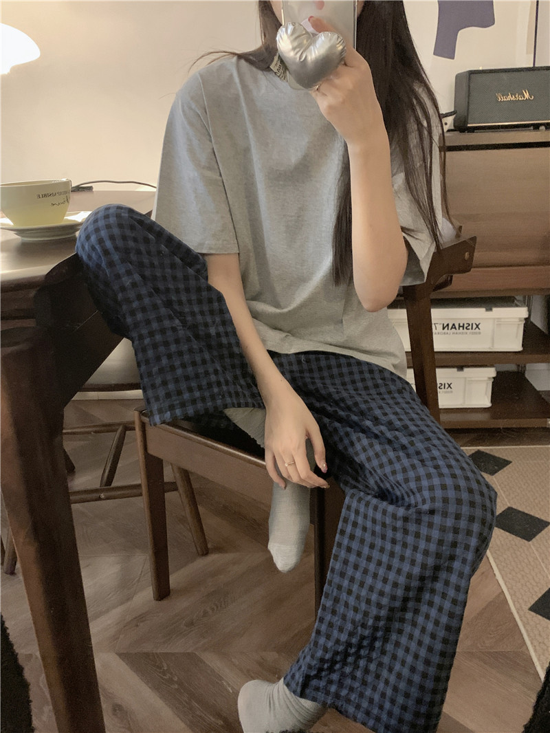 Ins Korean Style Pajamas 여성의 여름 솔리드 컬러 반팔 학생의 캐주얼 체크 무늬 바지 양복 투피스 홈 세트스토어 가기