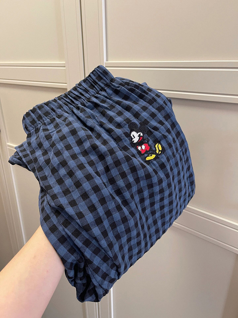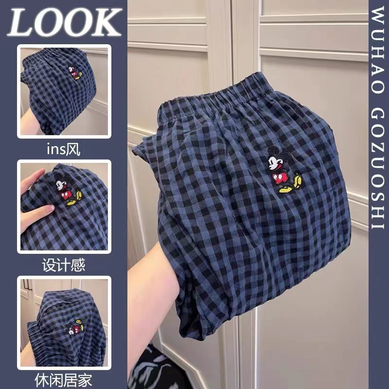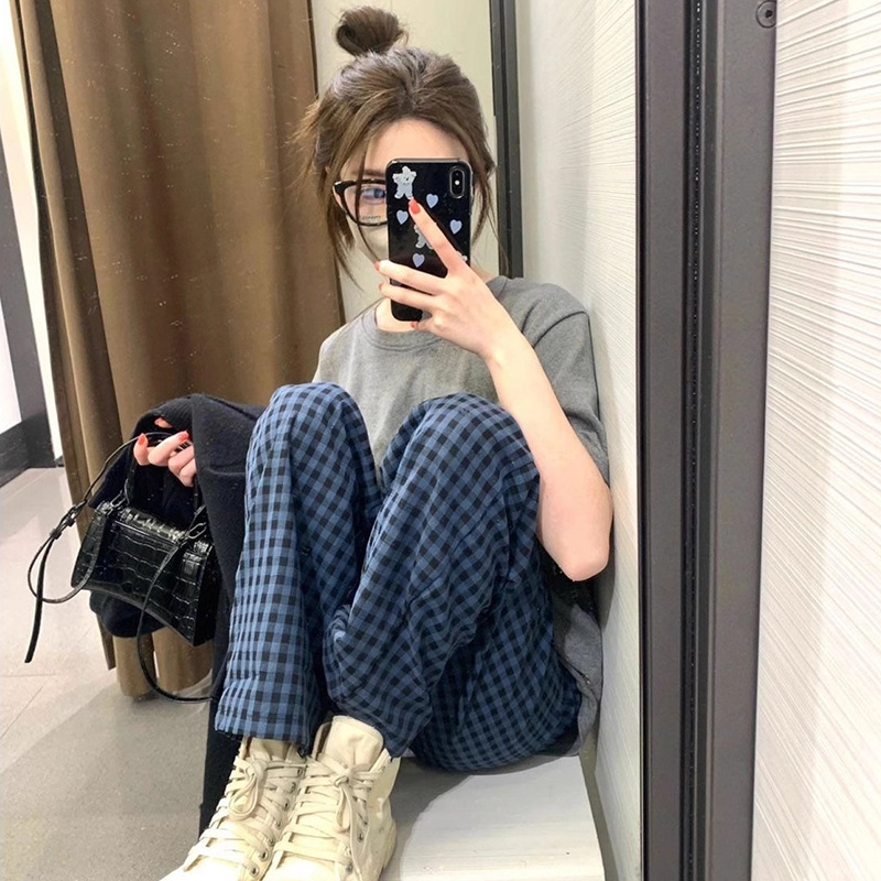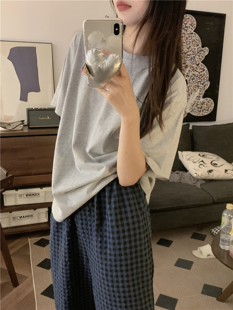 Ins Korean Style Pajamas 여성의 여름 솔리드 컬러 반팔 학생의 캐주얼 체크 무늬 바지 양복 투피스 홈 세트스토어 가기