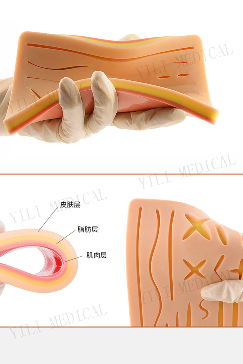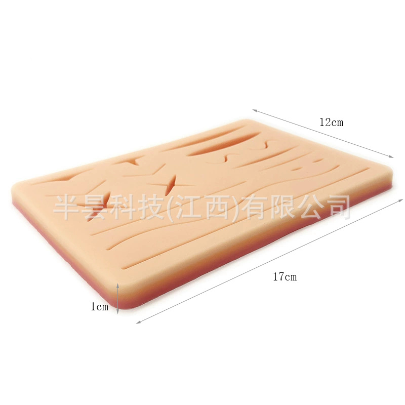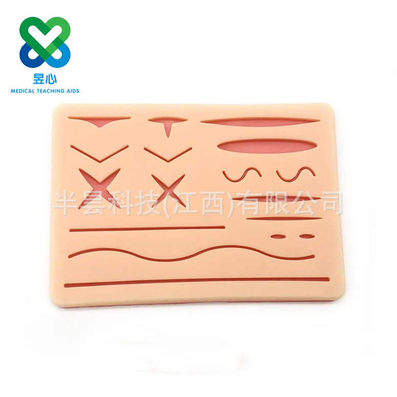 硅胶缝合训练适用于练习者练习外科切割、缝合和打结技术。满足您不同的练习需求。这是新型的缝合练习模块。仿真的皮肤质感,3层结构(皮肤/脂肪/肌肉)让操作和携带更方便。含有复合材料使劲拉扯打结线时不会出现硅胶断裂的情况。使用时您可以根据需要添加各种伤口进行模拟切割缝合练习。产品可以多次使用。