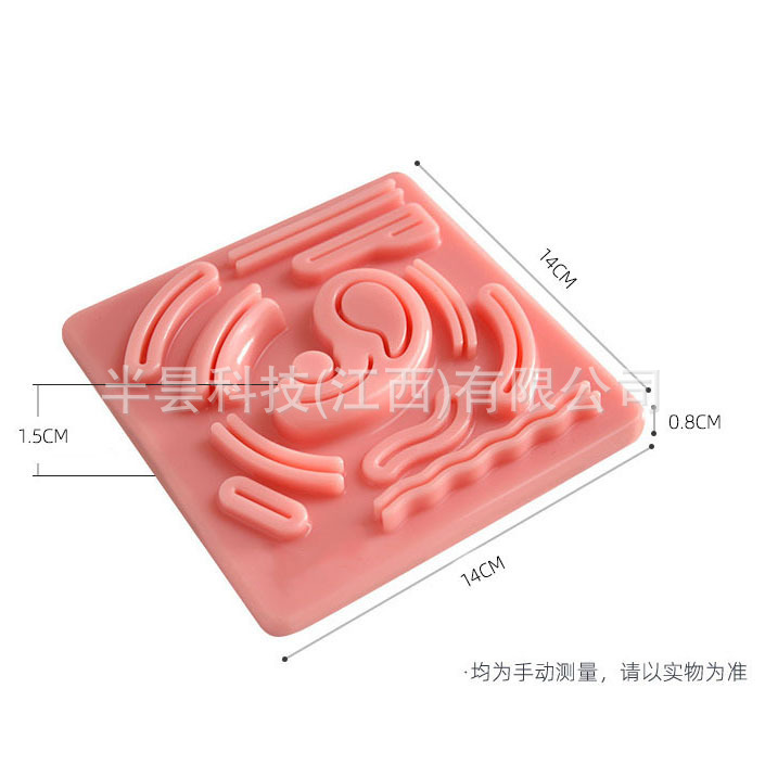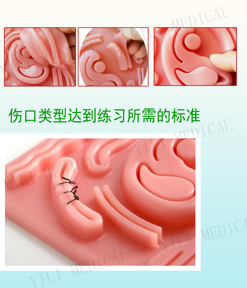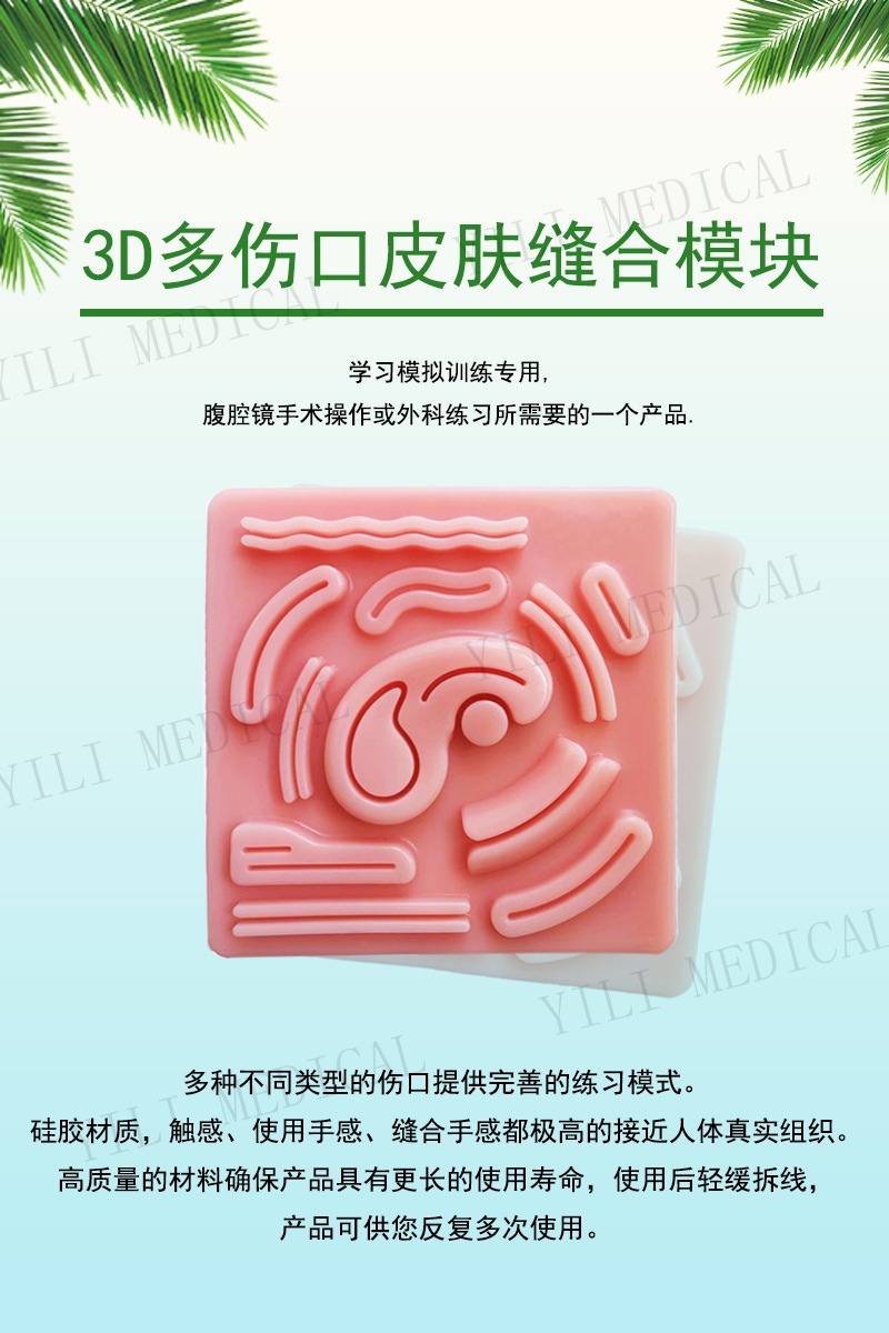 腹腔镜训练多伤口硅胶缝合模型是一款模拟腹腔真实伤口的医学教具。它采用柔软的硅胶材料制作,逼真地呈现了腹腔伤口的形状和缝合过程。硅胶缝合训练适用于练习者练习外科切割、缝合和打结等技术。含有复合材料使劲拉扯打结线时不会出现硅胶断裂的情况。仿真的皮肤质感,耐用且易于清洁,使用时您可以根据需要添加各种伤口进行模拟切割缝合练习。产品可以多次使用。