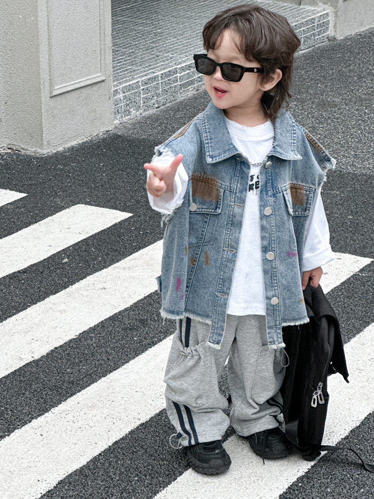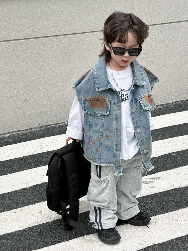 아동 조끼 2025년 신상 남아 가을옷 아기 한국 스타일 데님 아동복 중소형 아동용 컬러 페인트 조끼 트렌디