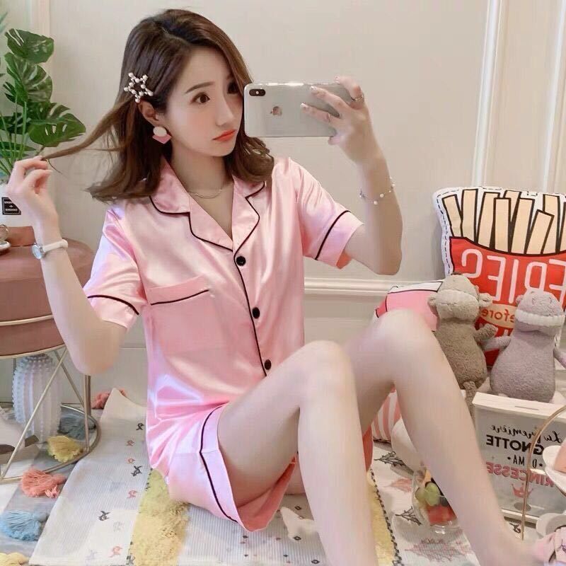아이스 실크 파자마 여성 여름 반팔 바지 얇은 솔리드 컬러 시뮬레이션 실크 홈 세트 투피스 세트 라이브 대외 무역스토어 가기