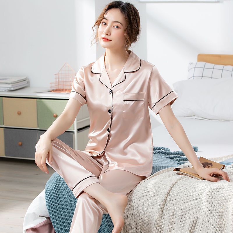 아이스 실크 파자마 여성 여름 반팔 바지 얇은 솔리드 컬러 시뮬레이션 실크 홈 세트 투피스 세트 라이브 대외 무역