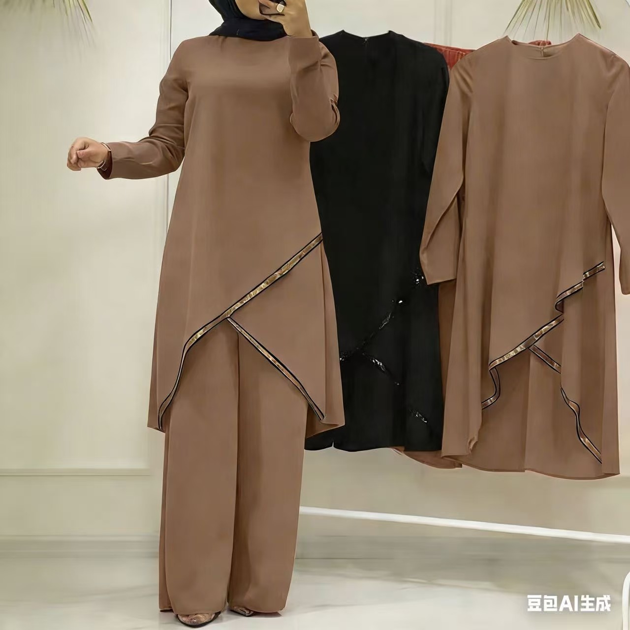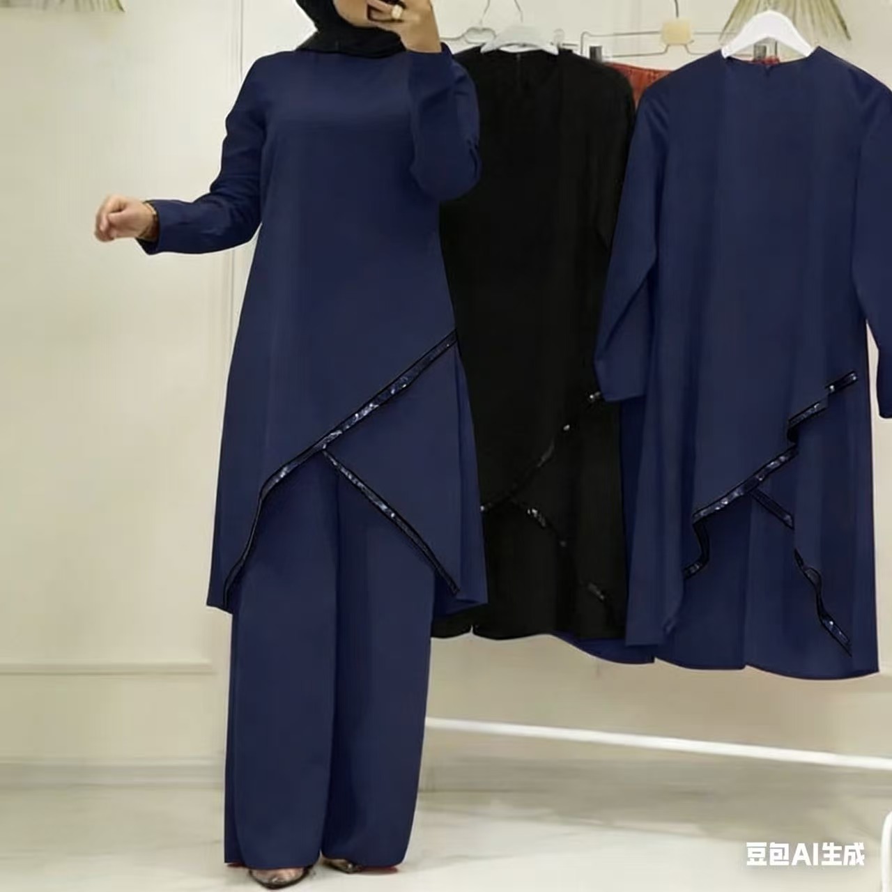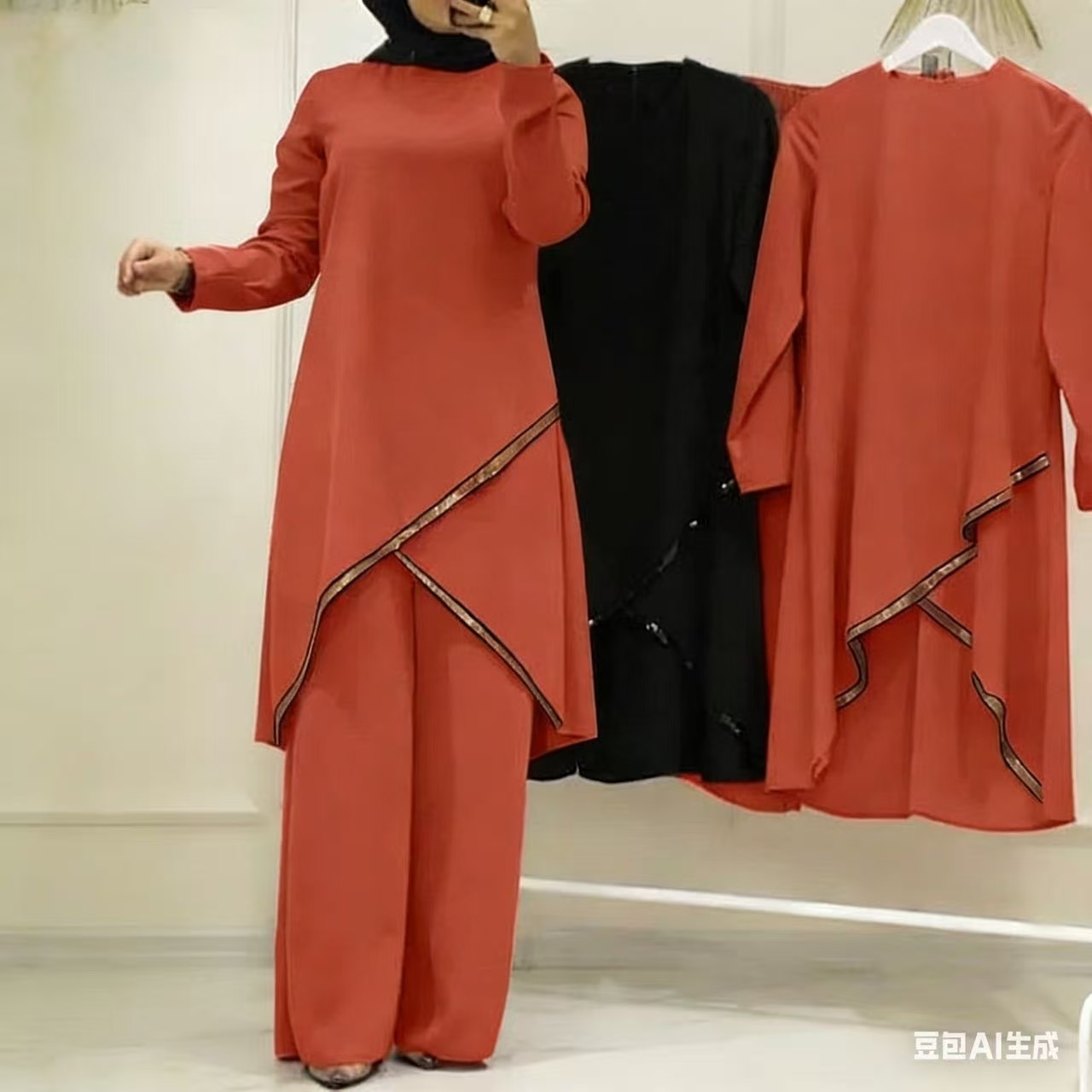 H720 # 봄과 가을을 위한 무슬림 여성용 투피스 캐주얼 라운드넥 긴팔 셔츠와 바지 세트