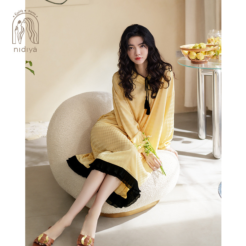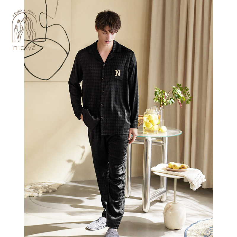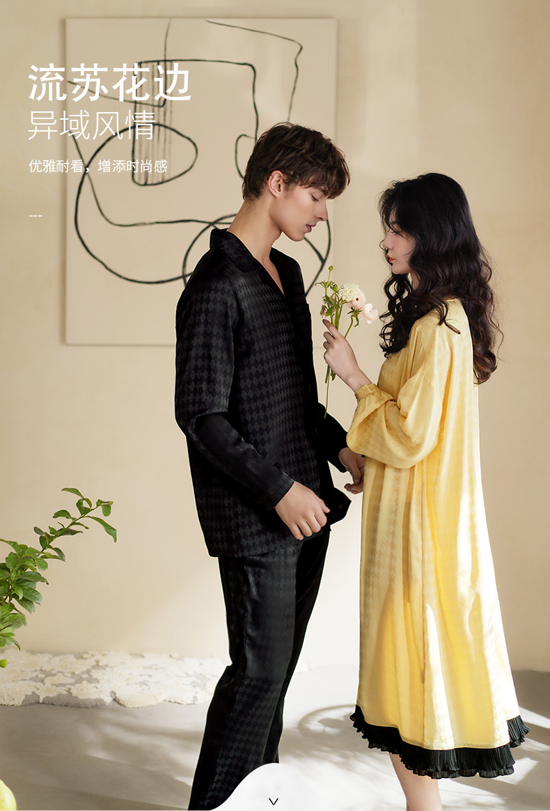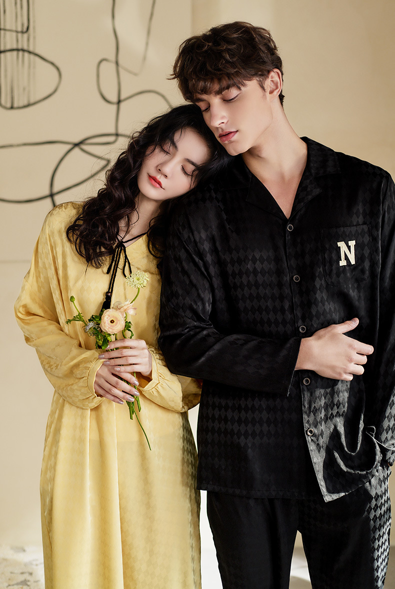 Nidiya 커플 잠옷 봄 아이스 실크 여성 나이트 드레스 옷깃 카디건 긴 소매 캐주얼 남성 봄과 가을 홈웨어 세트