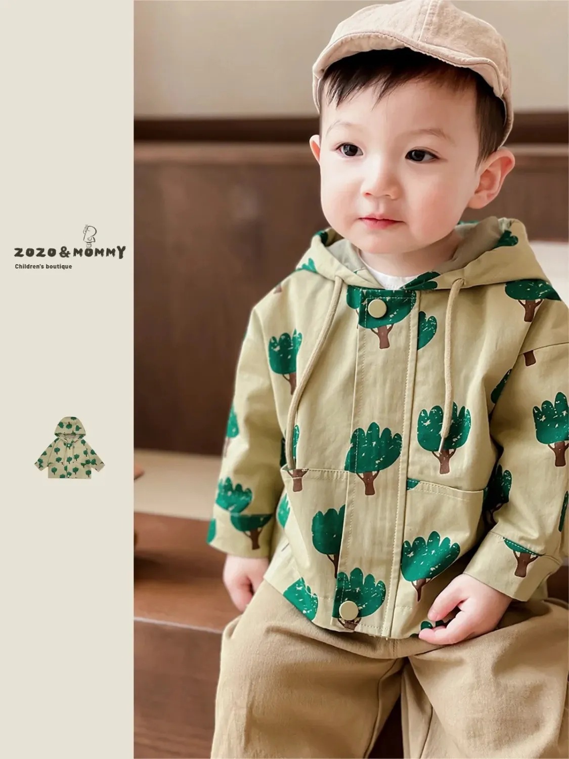 [작은그로브] 작은 나무 인쇄 후드 윈드브레이커 가을 아기 소년들과 소녀 보물 방풍 재킷 코트