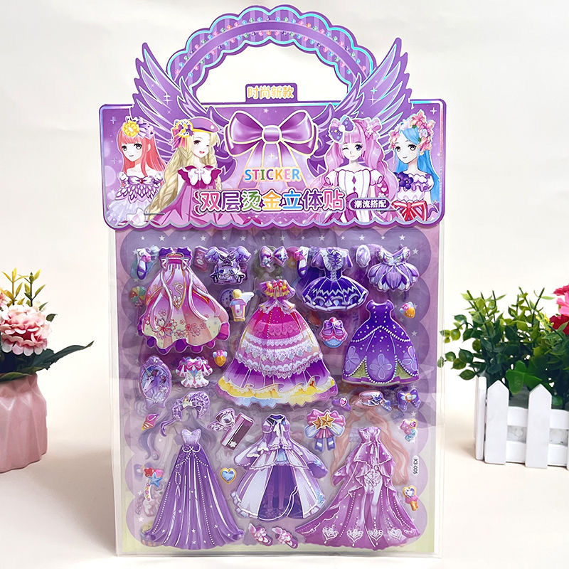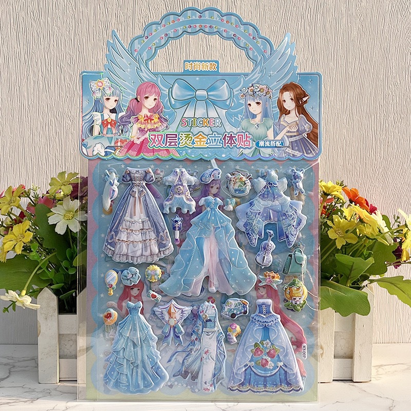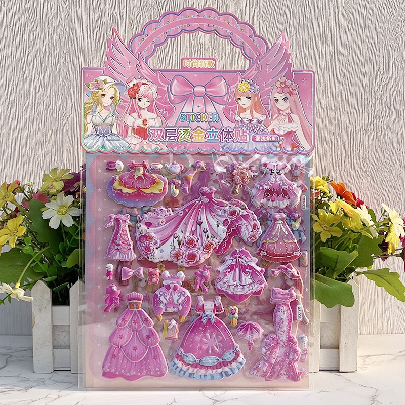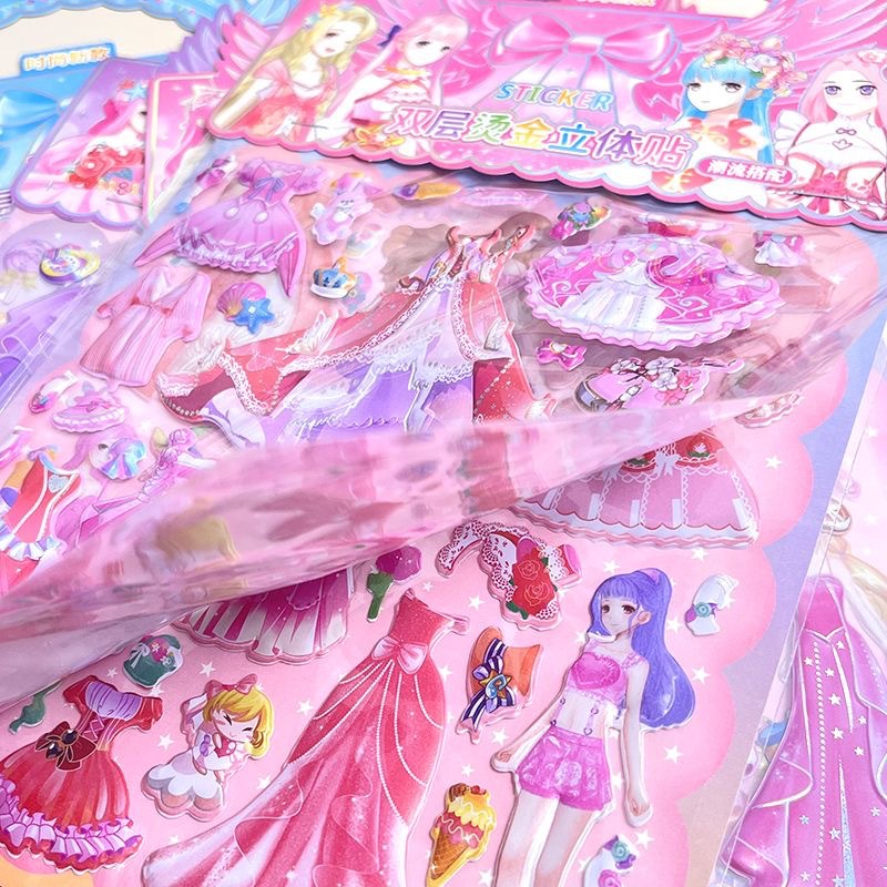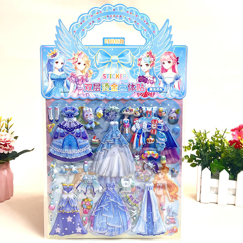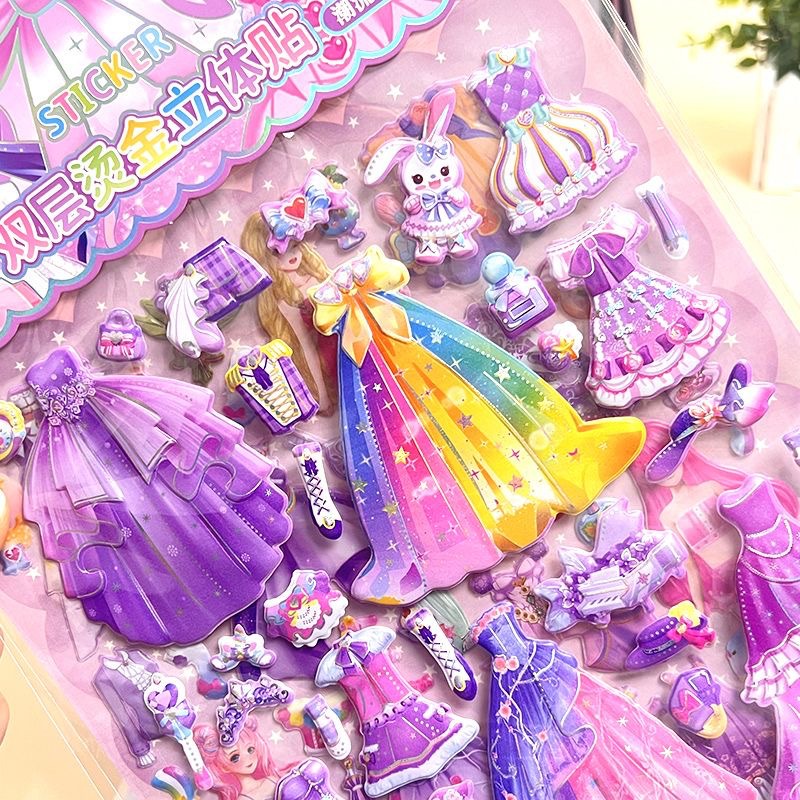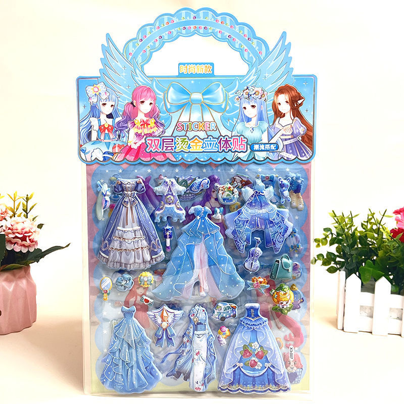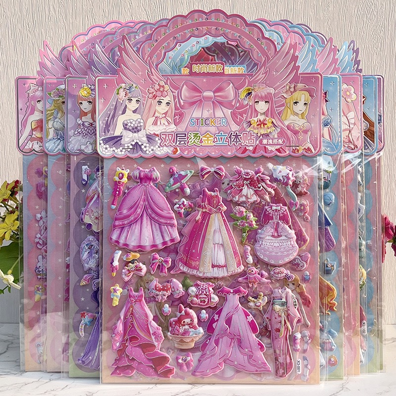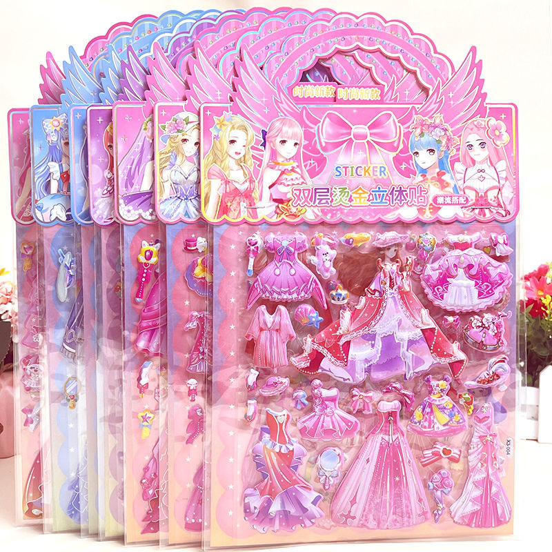 어린이 공주 드레스 업 스티커 도금 더블 레이어 3 차원 만화 보상 스티커 소녀 옷 거품 스티커 장난감스토어 가기