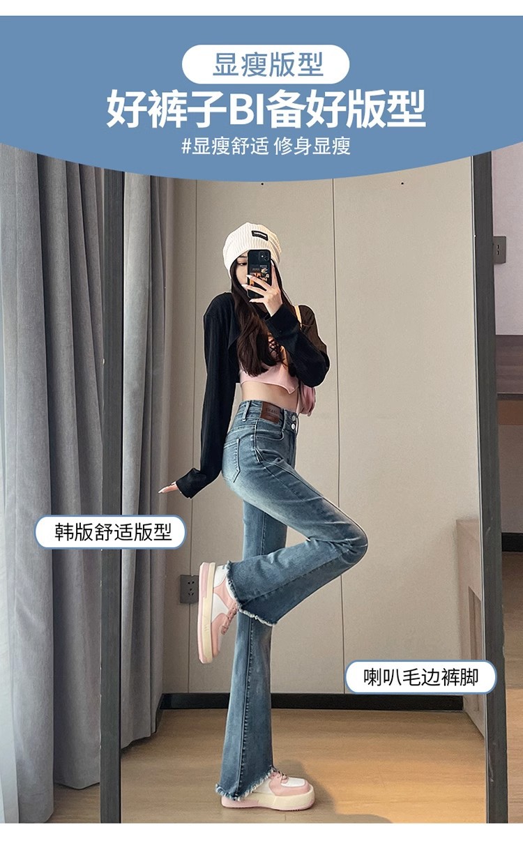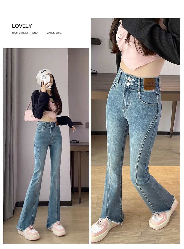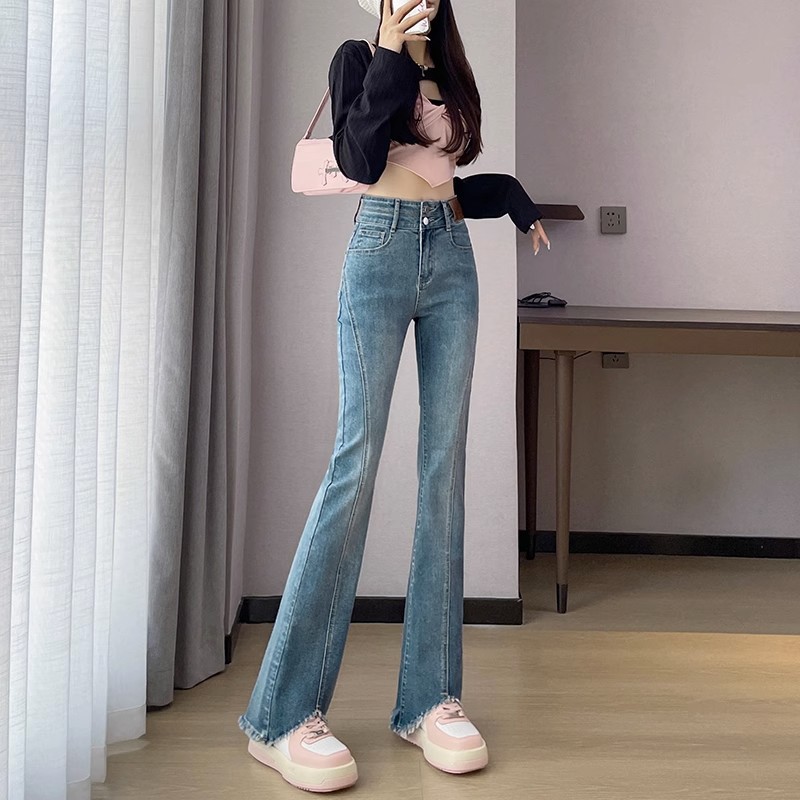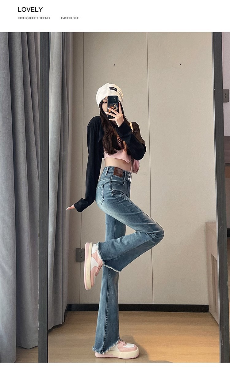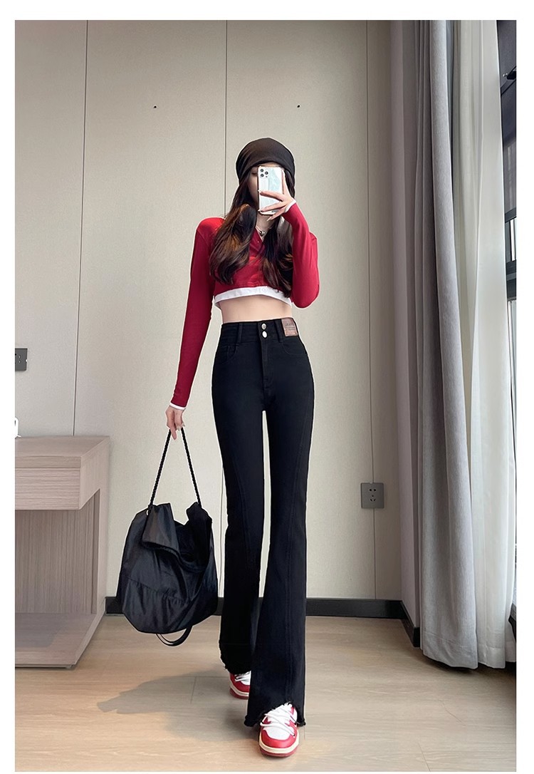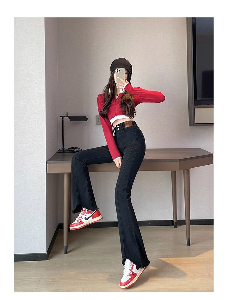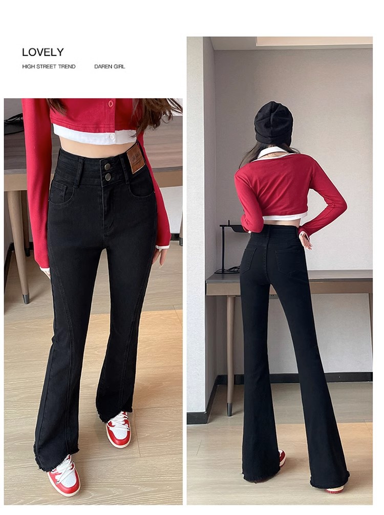 검은 거친 가장자리 청바지 여성용 슬림 핏 봄 2024 새로운 높은 허리 슬리밍 말굽 걸레 마이크로 혼 바지스토어 가기