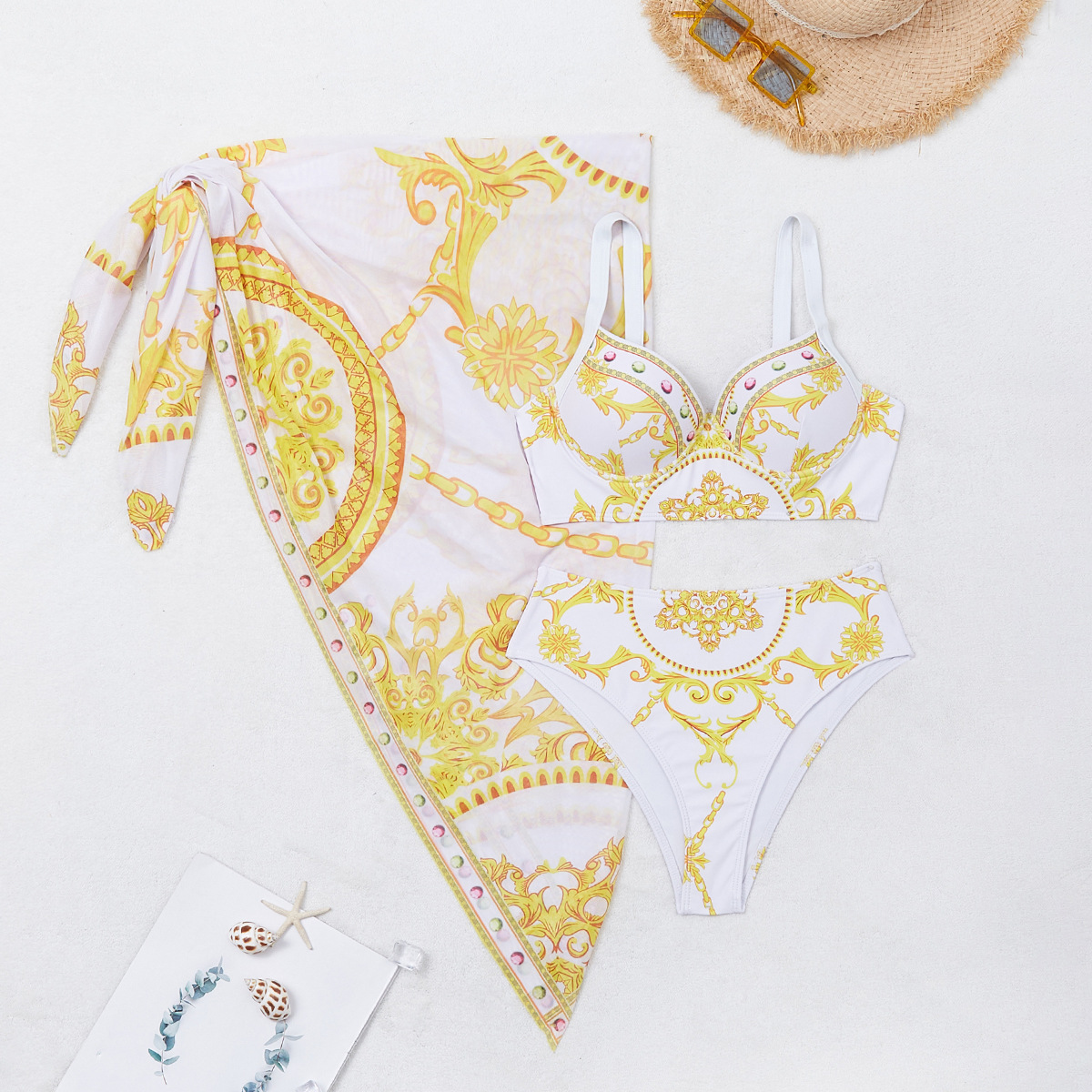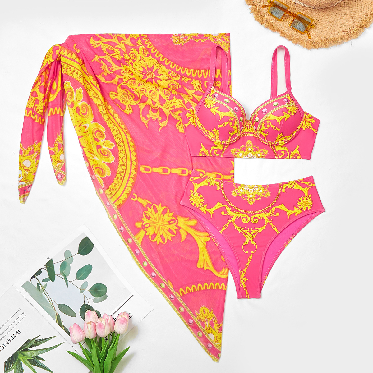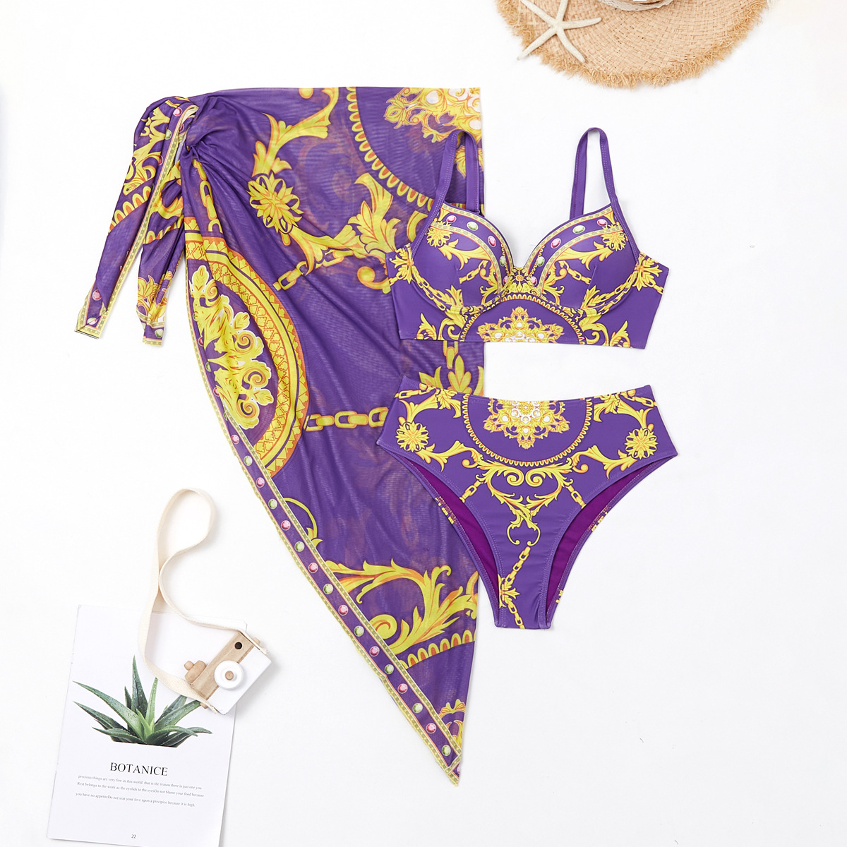 2024 새로운 인은 수영복 하드 가방 스틸 브래킷 포지셔닝 인쇄 높은 허리 수영복 비키니 투피스 세트