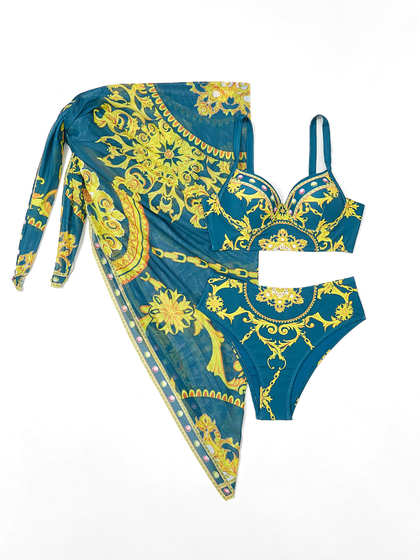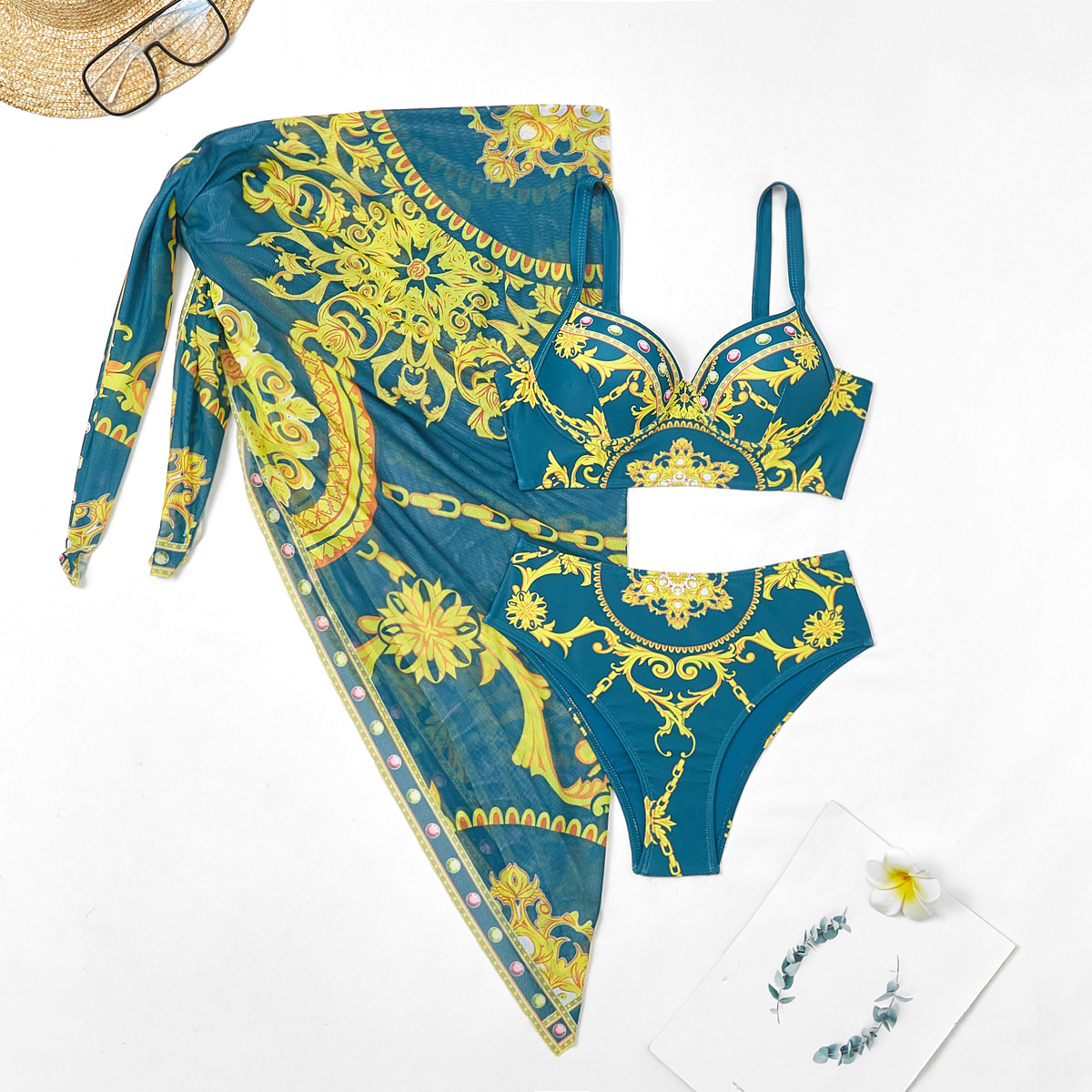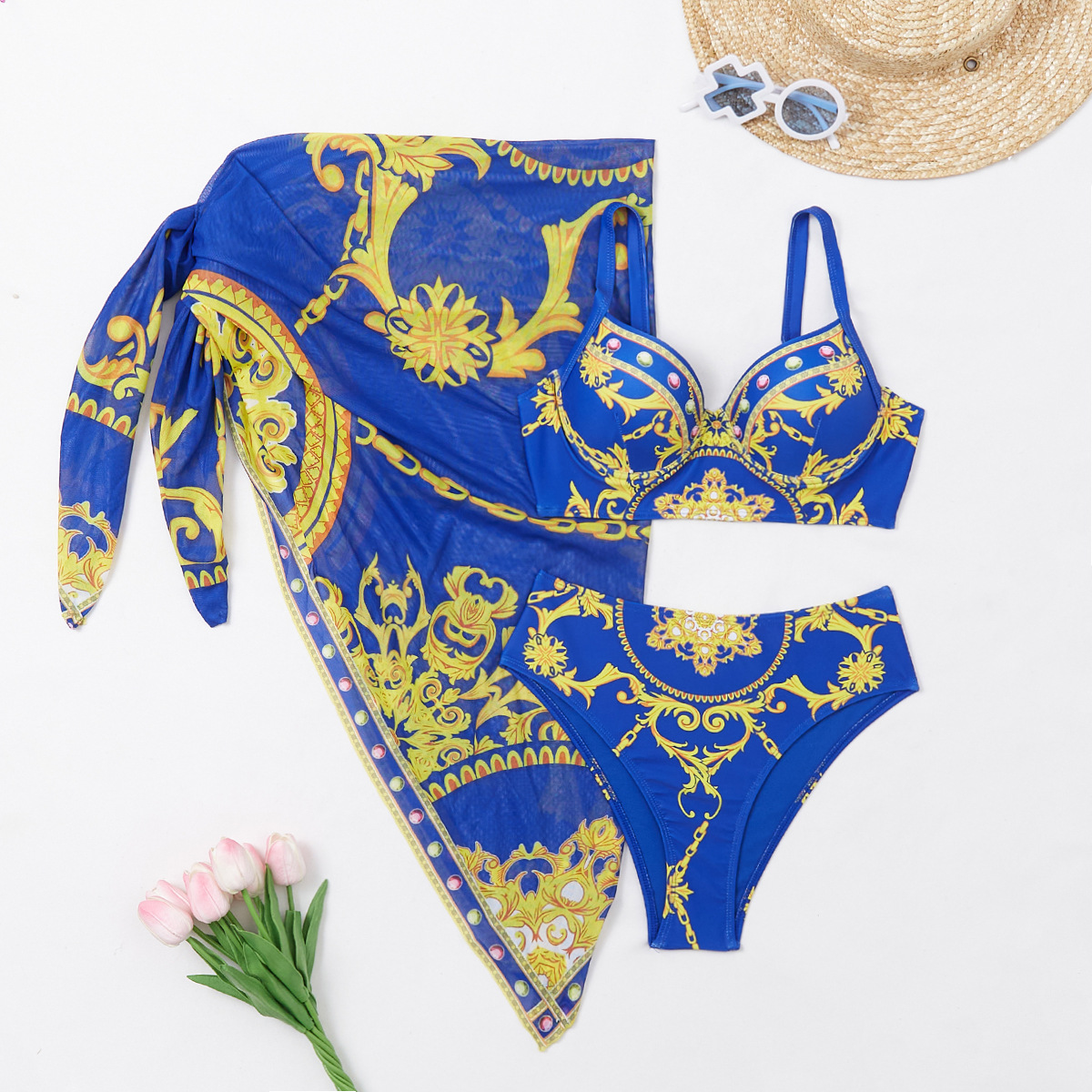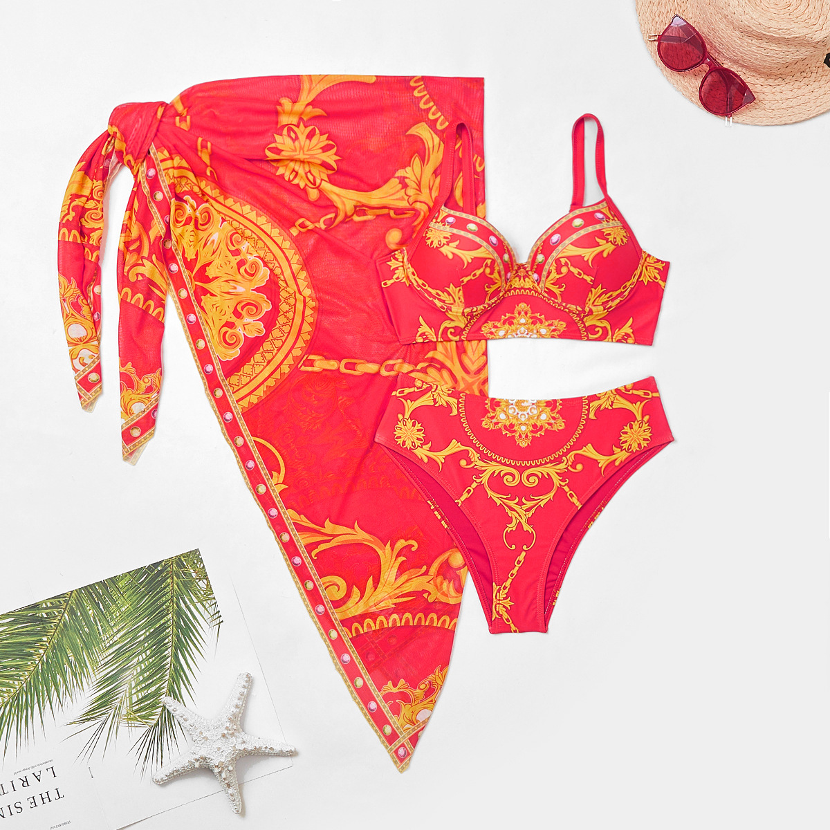 2024 새로운 인은 수영복 하드 가방 스틸 브래킷 포지셔닝 인쇄 높은 허리 수영복 비키니 투피스 세트