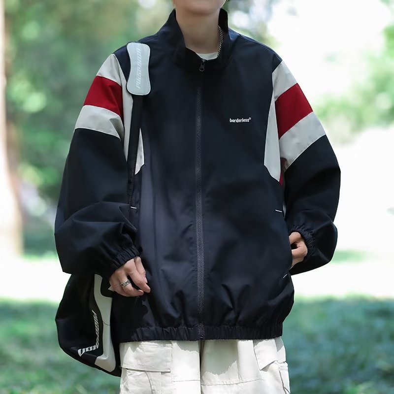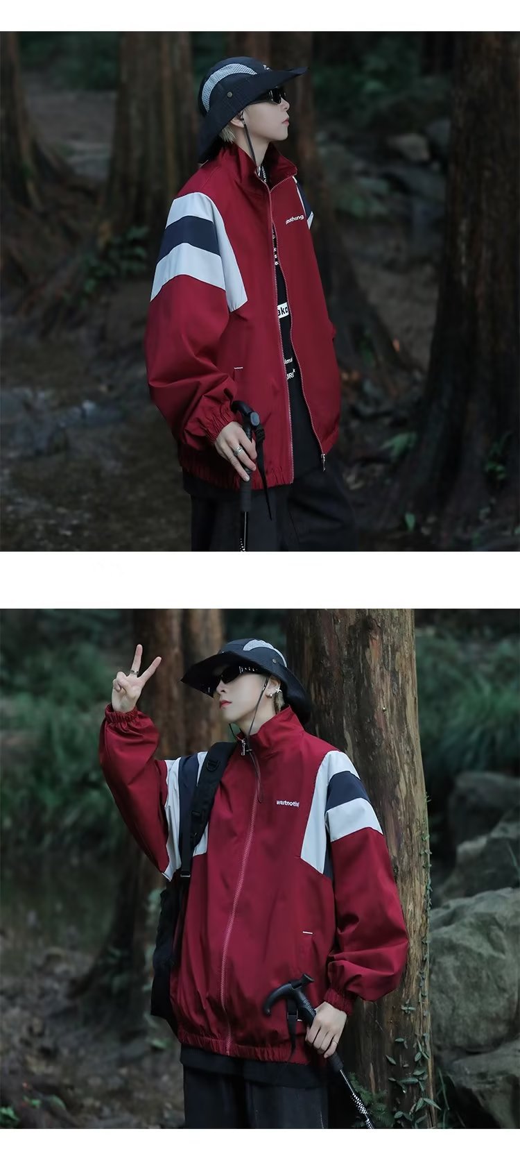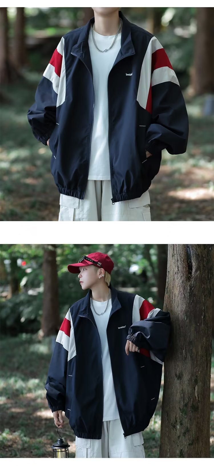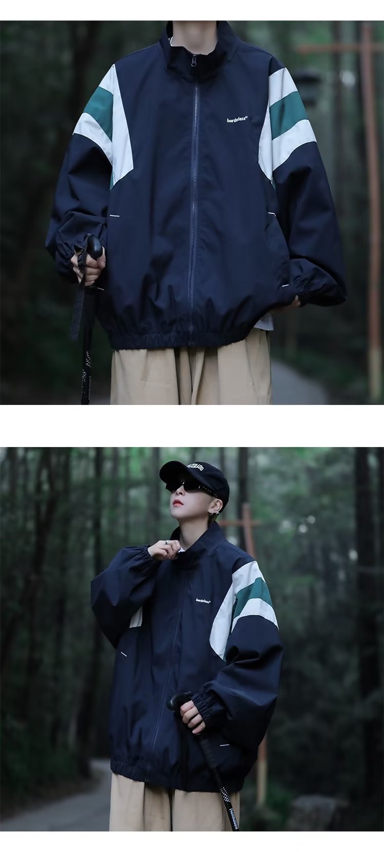 일본식 컬러 매칭 재킷 남성 산 패션 브랜드 미국 복고풍 느슨한 Pu 잘 생긴 야외 스탠드 칼라 캐주얼 재킷