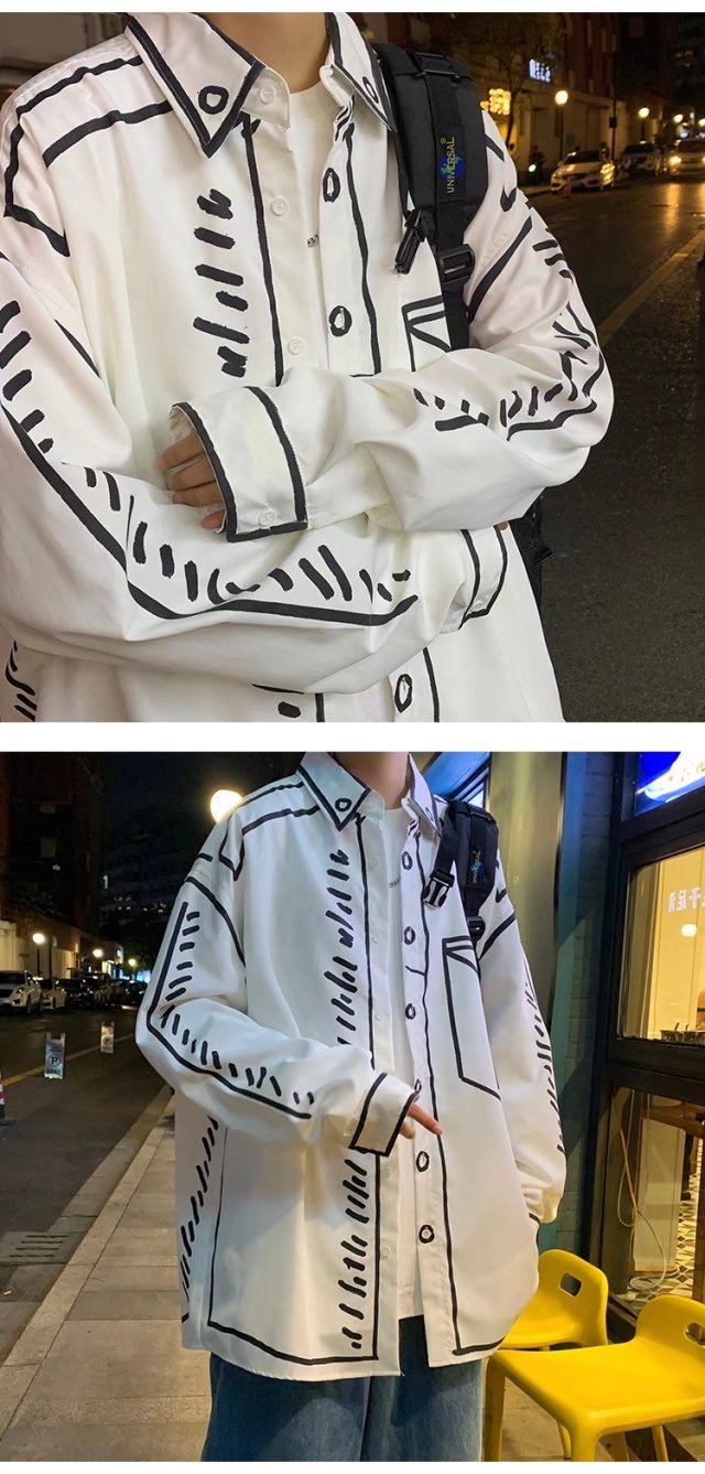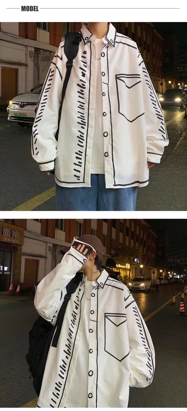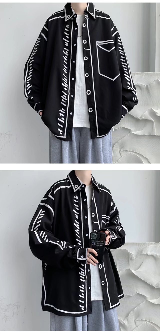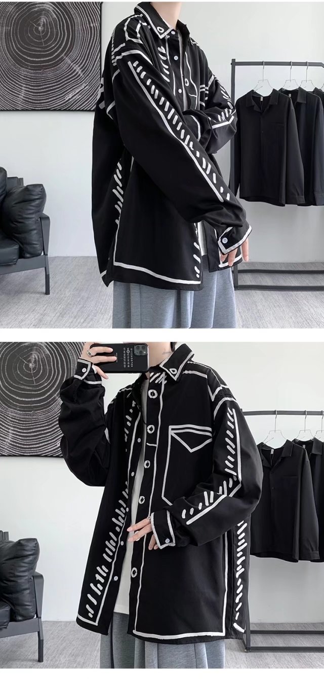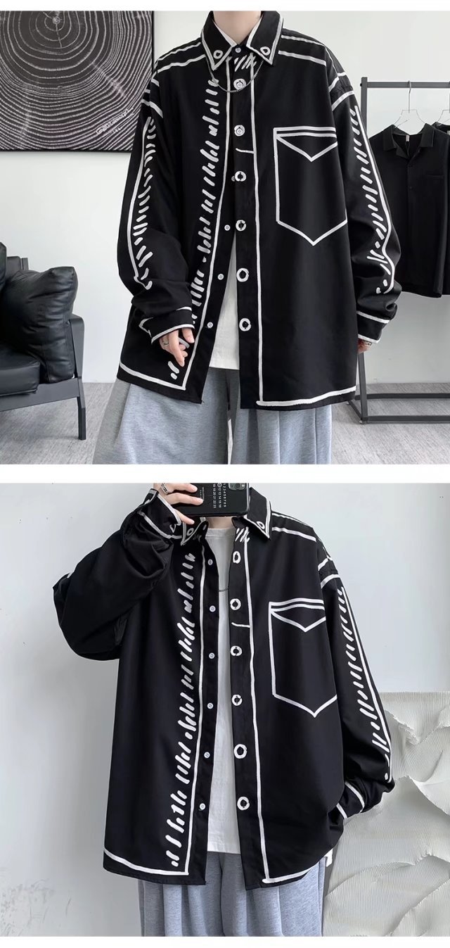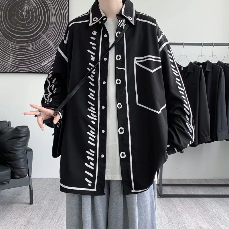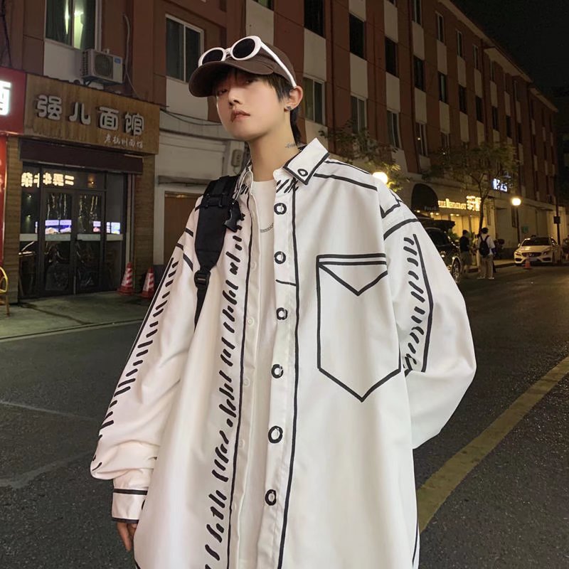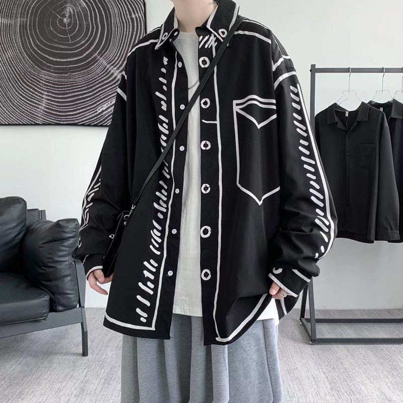 긴 소매 셔츠 남자의 봄 틈새 디자인 국가 패션 손으로 그린 낙서 라인 셔츠 코트 홍콩 스타일 프릴 잘 생긴 탑 옷