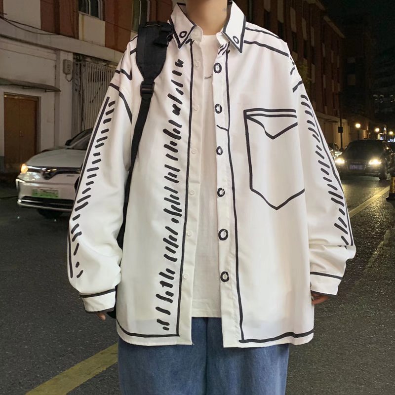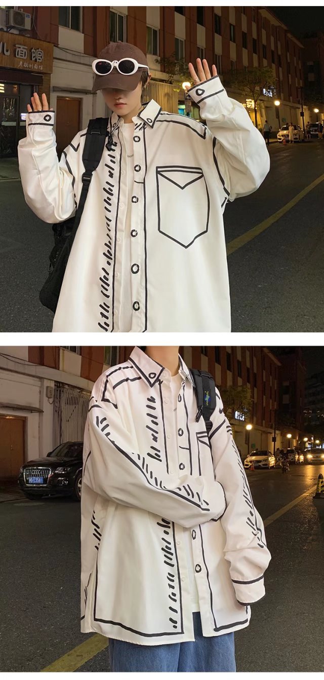 긴 소매 셔츠 남자의 봄 틈새 디자인 국가 패션 손으로 그린 낙서 라인 셔츠 코트 홍콩 스타일 프릴 잘 생긴 탑 옷스토어 가기