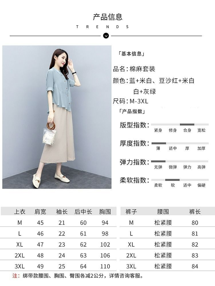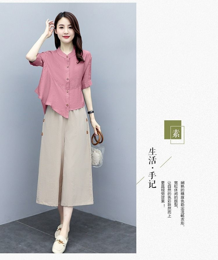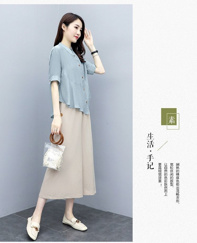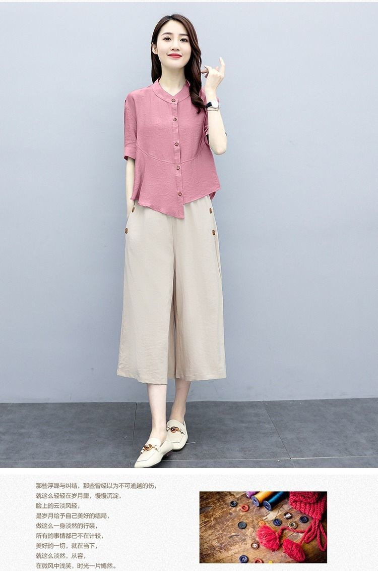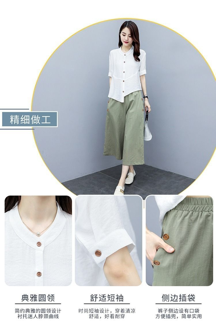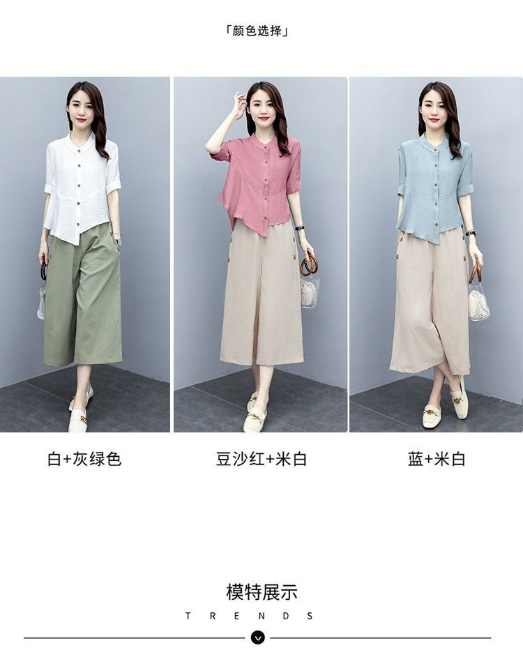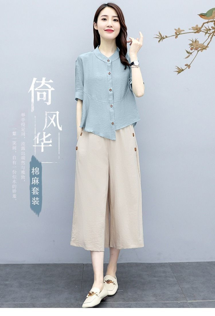 코튼 및 린넨 세트 여성 2024 새로운 서양식 캐주얼 패션 와이드 레그 바지 여성 여름 느슨한 단색 짧은 소매 투피스 세트 패션스토어 가기