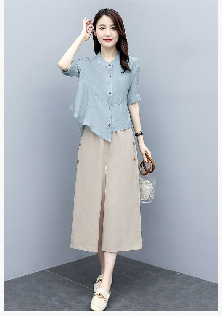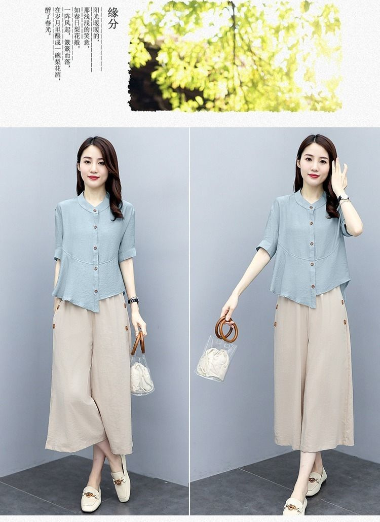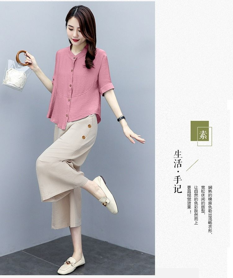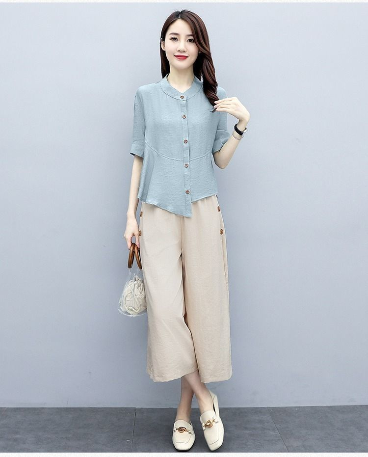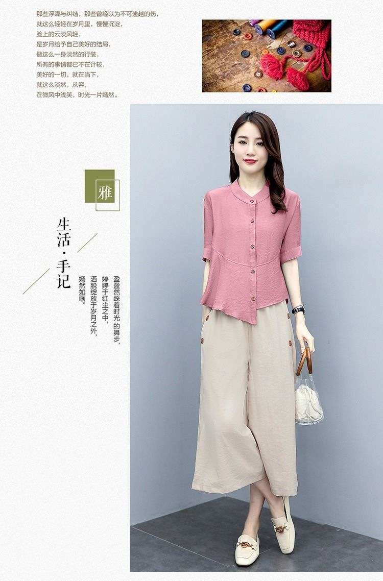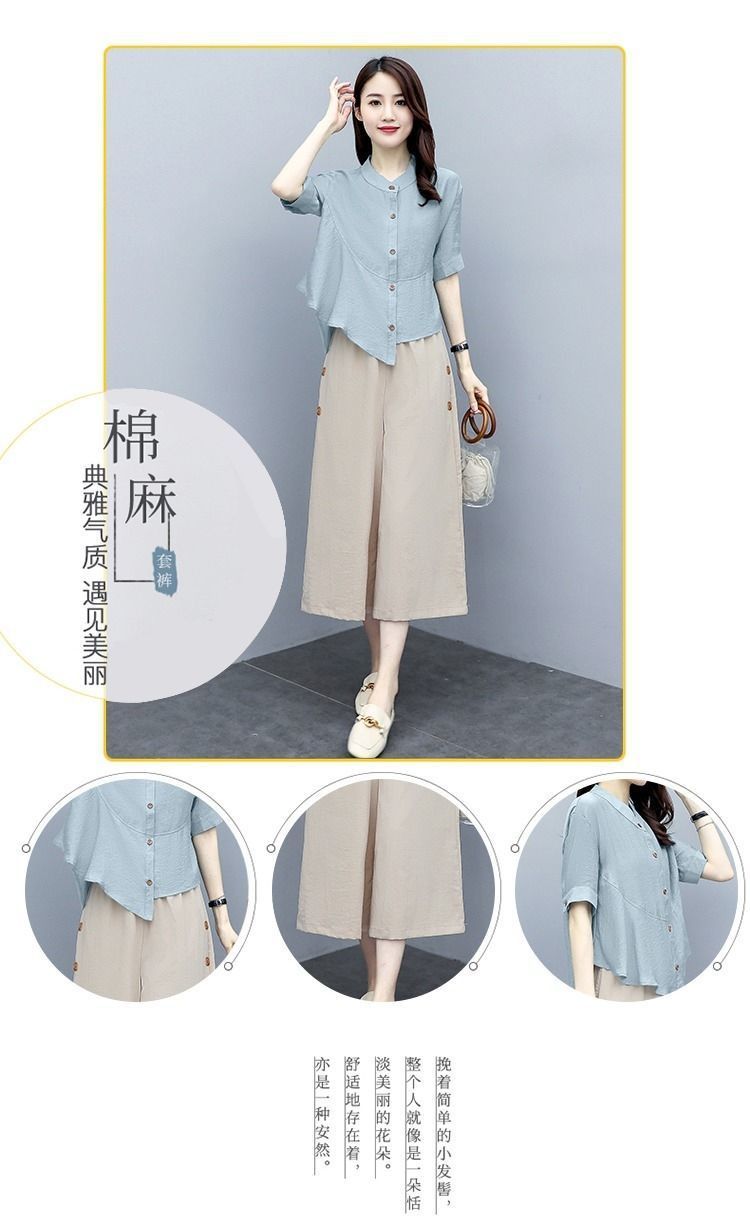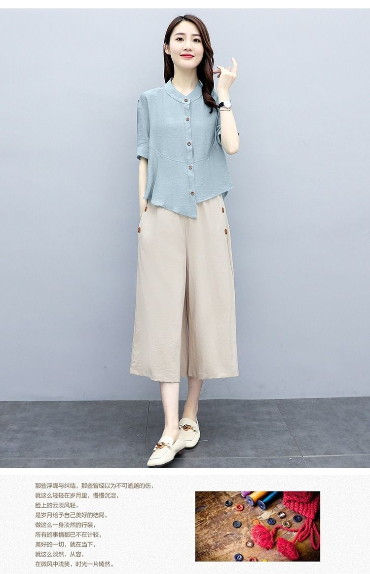코튼 및 린넨 세트 여성 2024 새로운 서양식 캐주얼 패션 와이드 레그 바지 여성 여름 느슨한 단색 짧은 소매 투피스 세트 패션스토어 가기