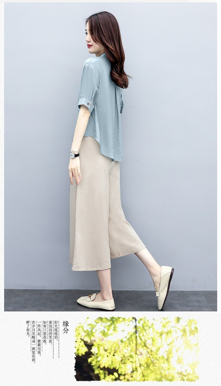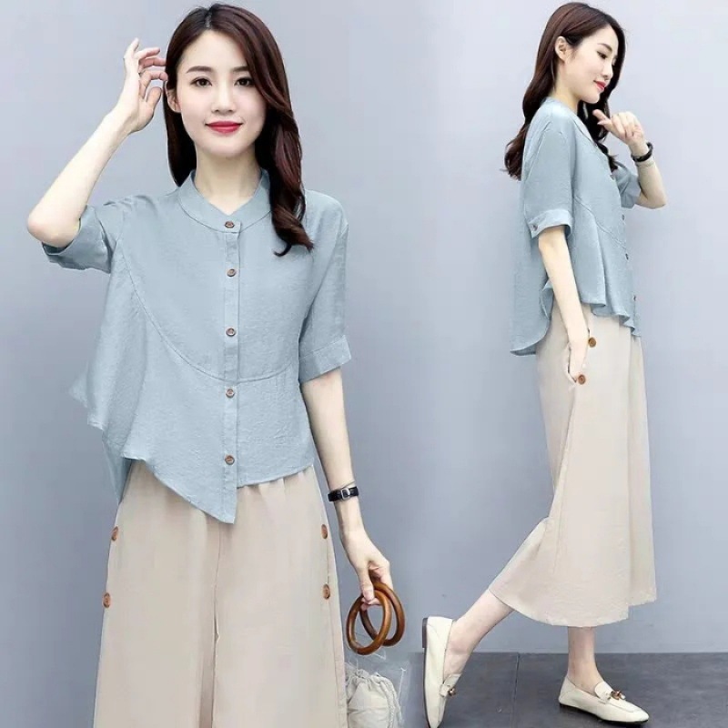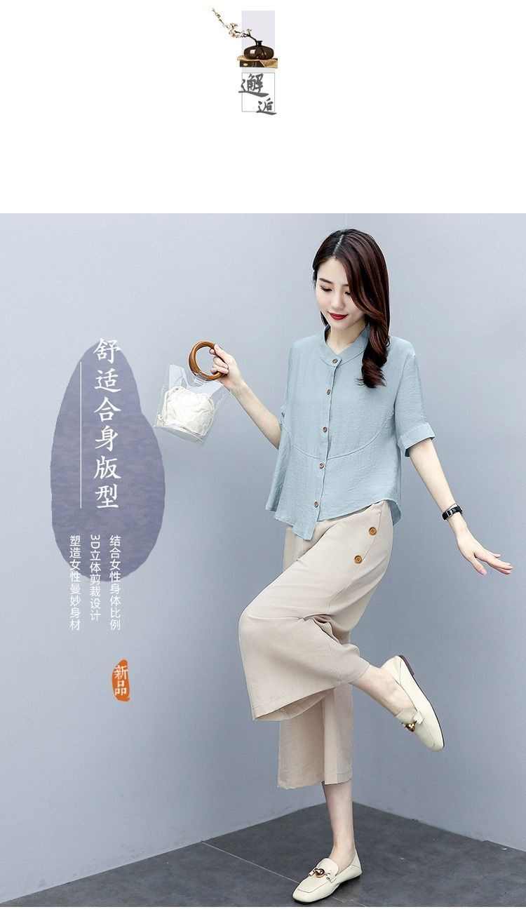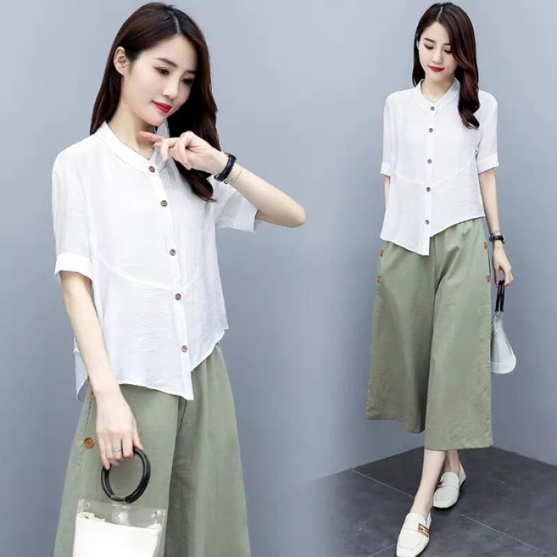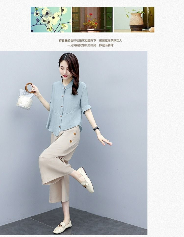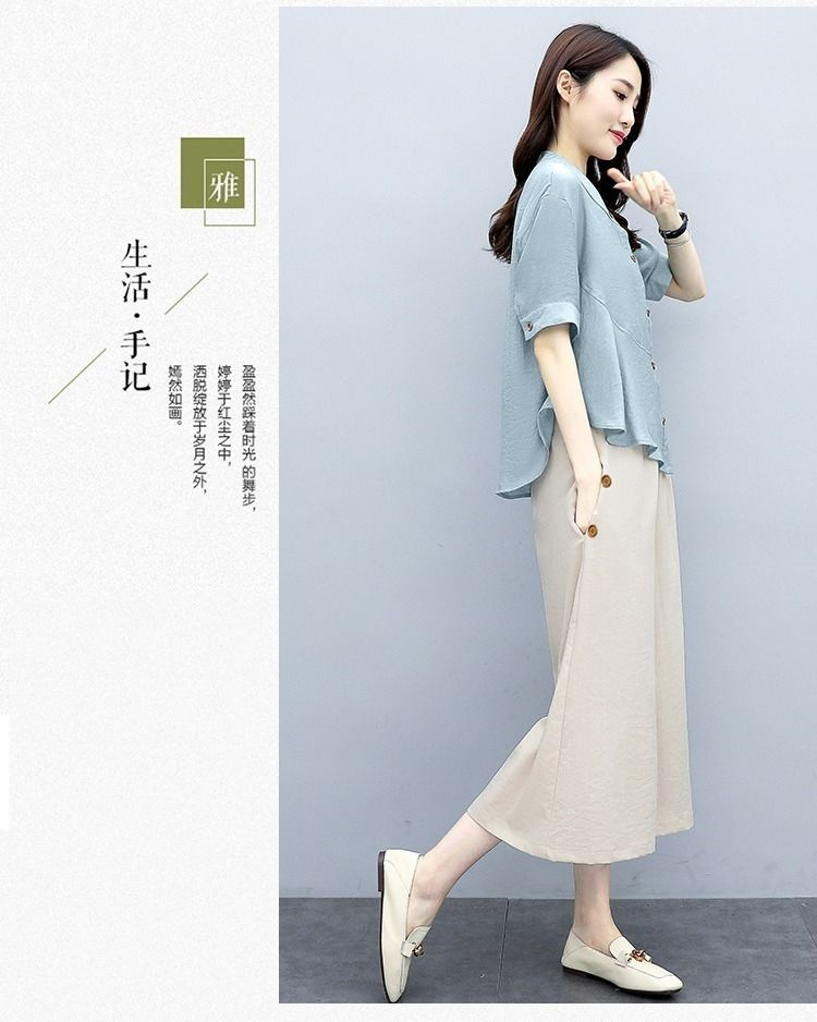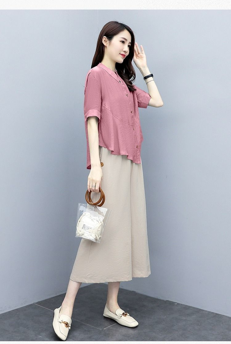 코튼 및 린넨 세트 여성 2024 새로운 서양식 캐주얼 패션 와이드 레그 바지 여성 여름 느슨한 단색 짧은 소매 투피스 세트 패션스토어 가기